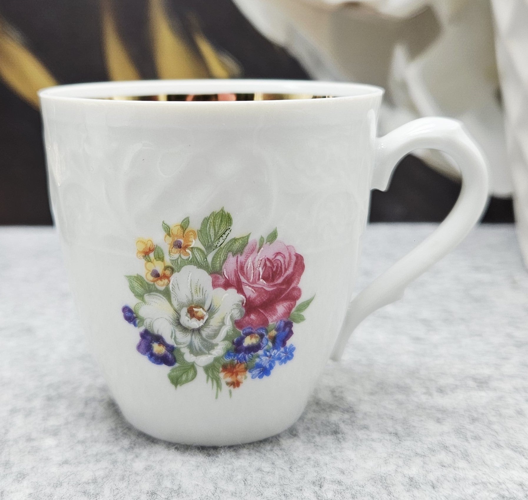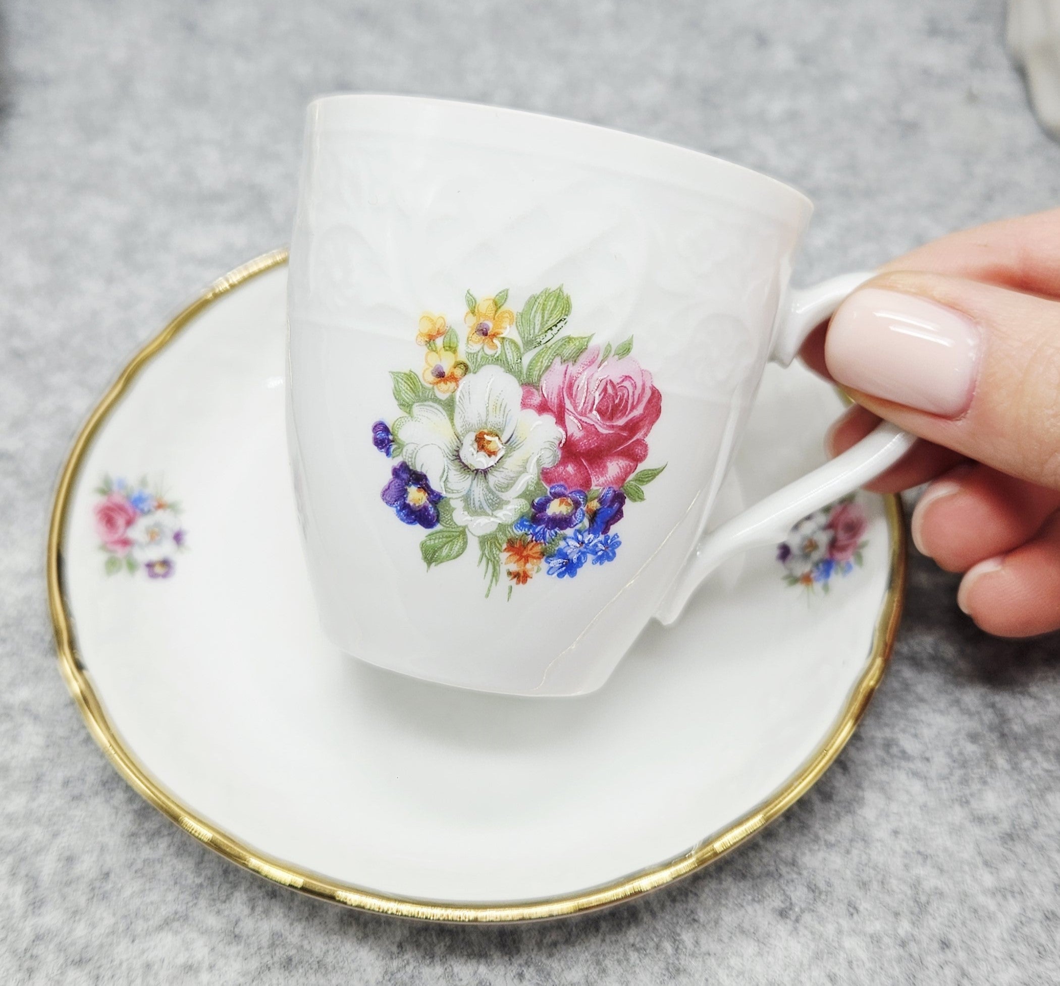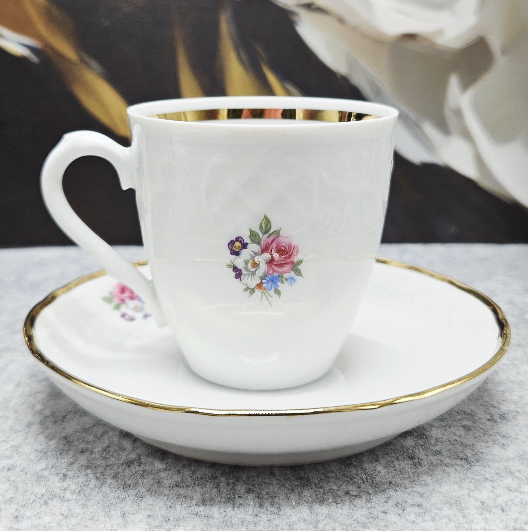 Eine exklusive Espressotasse aus Porzellanvon Schumann Arzberg , verziert mit einem Gartenblumenarrangement und vergoldeten Rändern. Das Design wird durch eine geprägte Zierleiste und einen eleganten Henkel ergänzt.