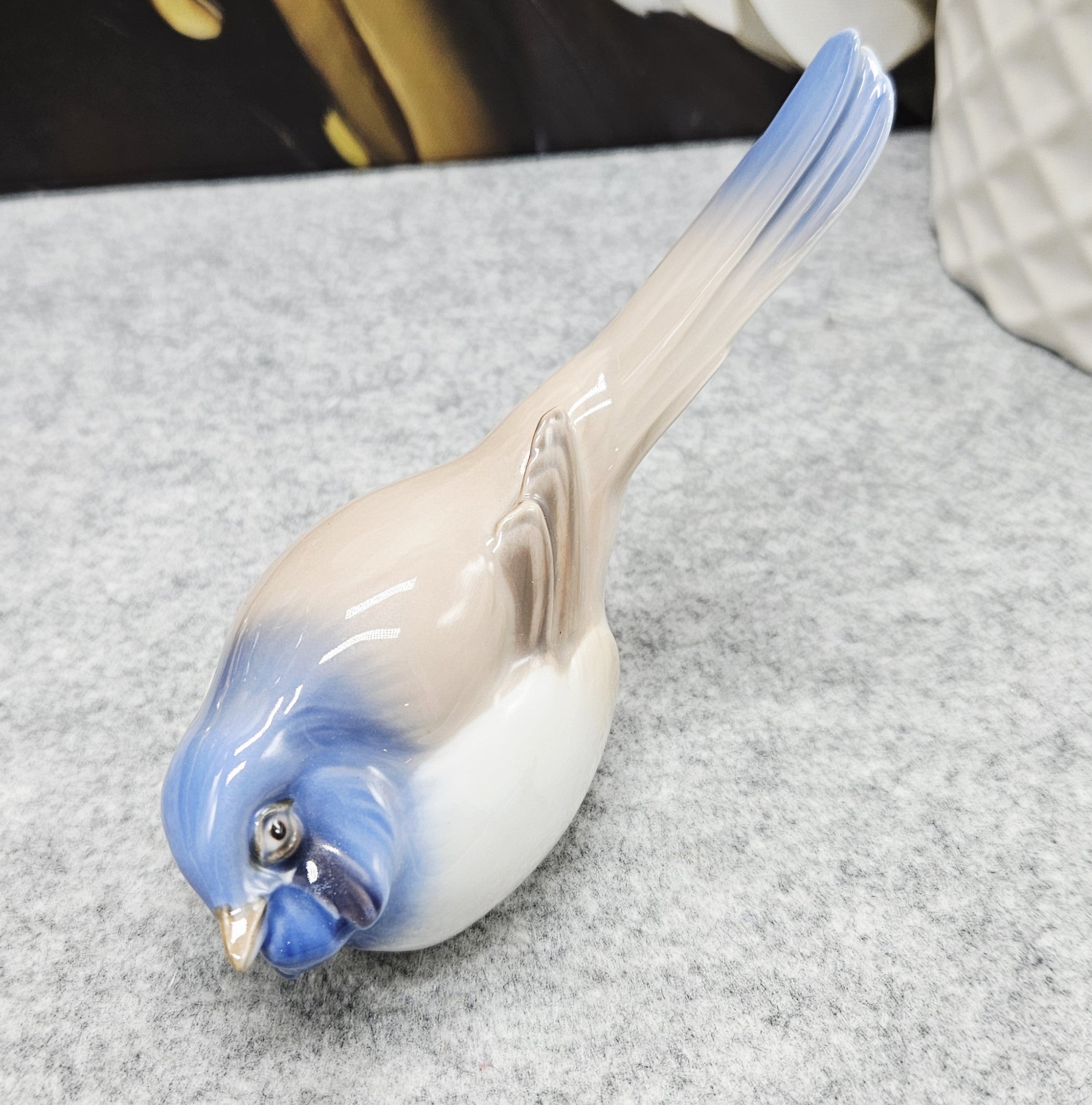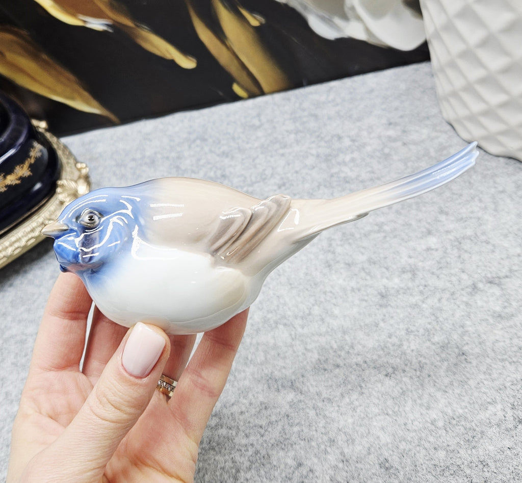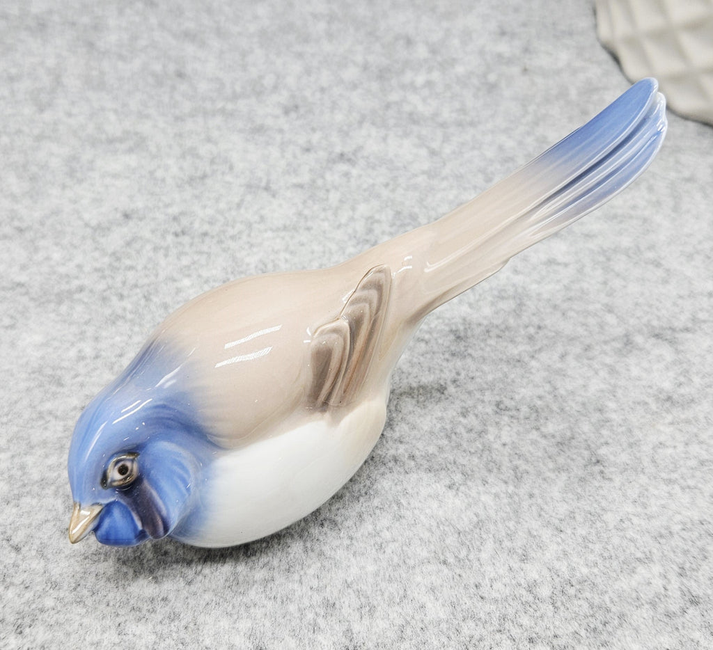 Eine schöne dänische Porzellanfigur, die von der berühmten Bing & Grøndahl Manufaktur in Kopenhagen hergestellt wurde. Dieser reizende, natürlich bemalte Vogel besticht durch seine sanfte Farbpalette aus Blau, bräunlichem Beige und Weiß, die der Figur einen lebendigen und subtilen Realismus verleiht.
