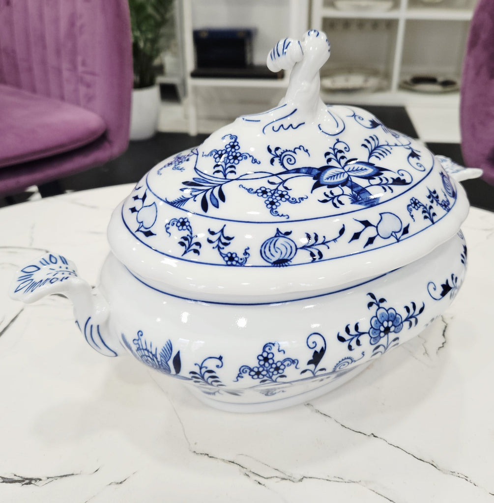 Das tschechoslowakische Porzellan-Zwiebelmuster (*blaues Zwiebelmuster*) ist ein klassisches Porzellandekor, das auf das 18. Jahrhundert. Es stammt ursprünglich aus der Manufaktur Meissen in Deutschland, wurde aber in der Tschechoslowakei sehr beliebt und weit verbreitet. Das Muster zeigt stilisierte Blumen, Früchte und Pflanzen, die in ihrer Komposition an Zwiebeln erinnern, obwohl sie in Wirklichkeit Granatäpfel und Pfirsiche darstellen. Traditionell sind die Motive in Blau auf weißem Porzellan gehalten. Das Porzellan mit Zwiebelmuster wird wegen seiner Eleganz und seines historischen Erbes geschätzt und ist auch heute noch eine beliebte Wahl für Sammler und Innenarchitekten.