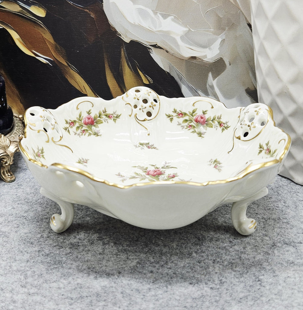 Eleganter deutscher Porzellanteller aus der Rosenthal Manufaktur, Serie Molière, Dekor Moosrose. Elfenbeinfarbenes Porzellan, verziert mit zarten Rosenblüten, Goldakzenten und durchbrochenen Ornamenten an den Rändern. Die geschwungene Form und die drei Zierfüße verleihen ihm eine unverwechselbare Raffinesse.Perfekt zum Servieren oder als Innendekoration.
