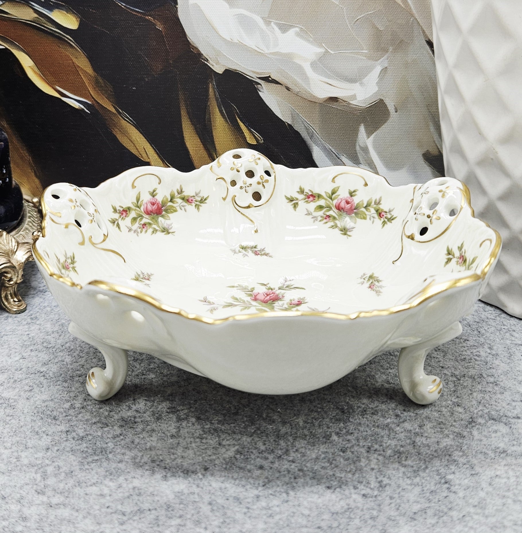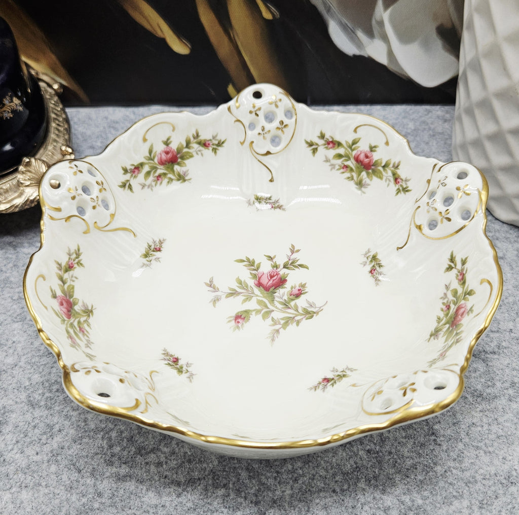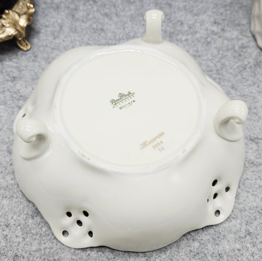 Eleganter deutscher Porzellanteller aus der Rosenthal Manufaktur, Serie Molière, Dekor Moosrose. Elfenbeinfarbenes Porzellan, verziert mit zarten Rosenblüten, Goldakzenten und durchbrochenen Ornamenten an den Rändern. Die geschwungene Form und die drei Zierfüße verleihen ihm eine unverwechselbare Raffinesse.