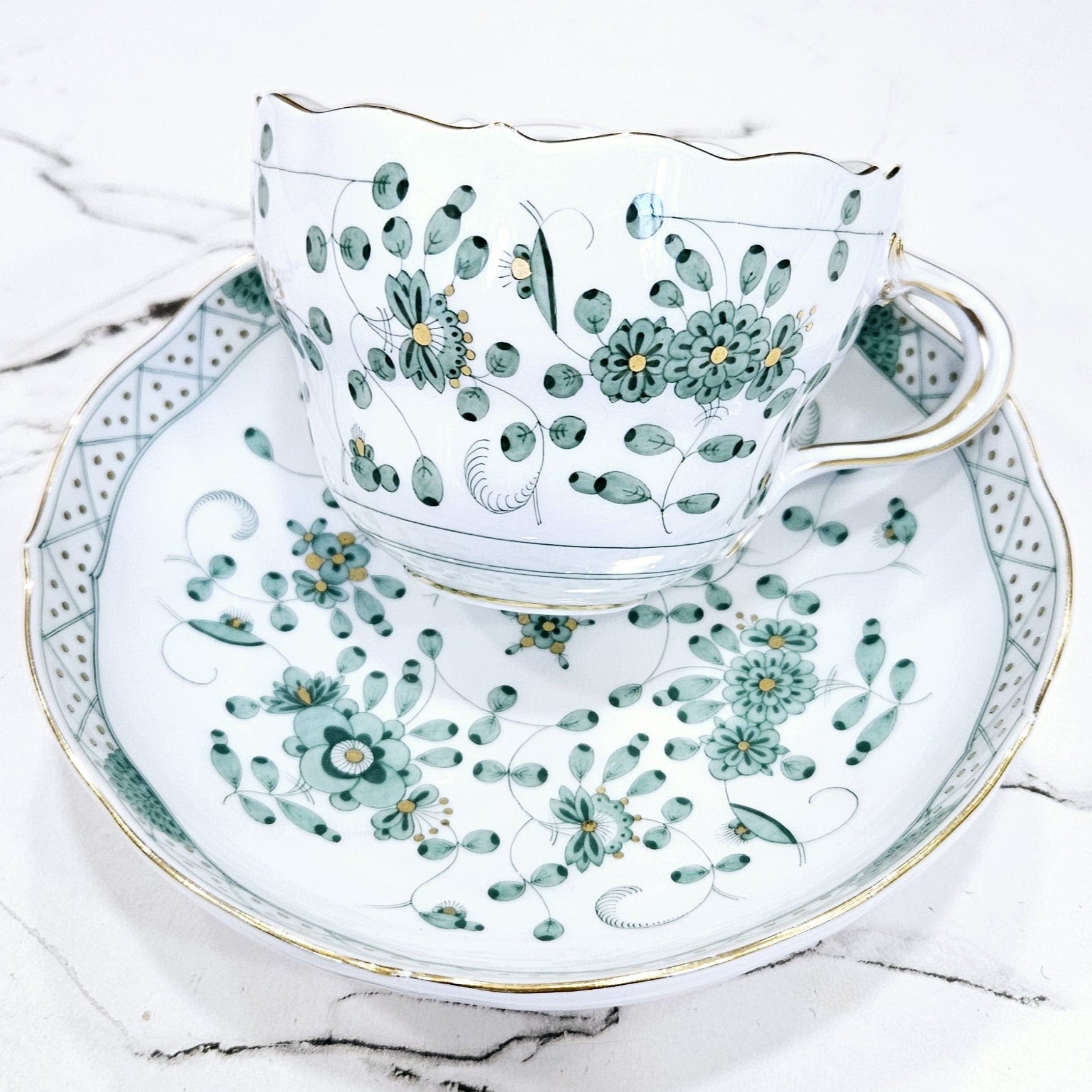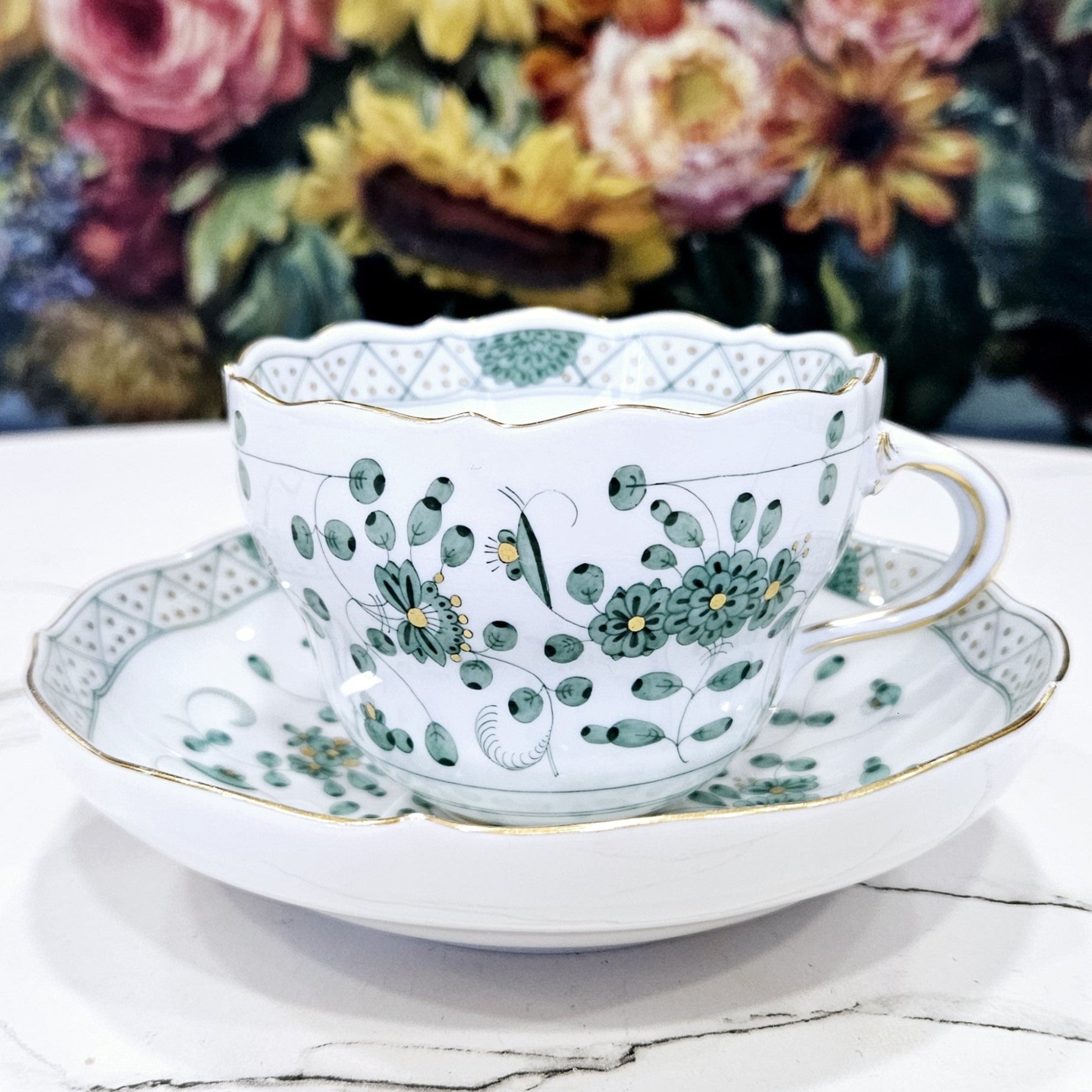 Königliche Meissener Porzellantasse. Handbemalt, vergoldet, Kollektion Green Indian.