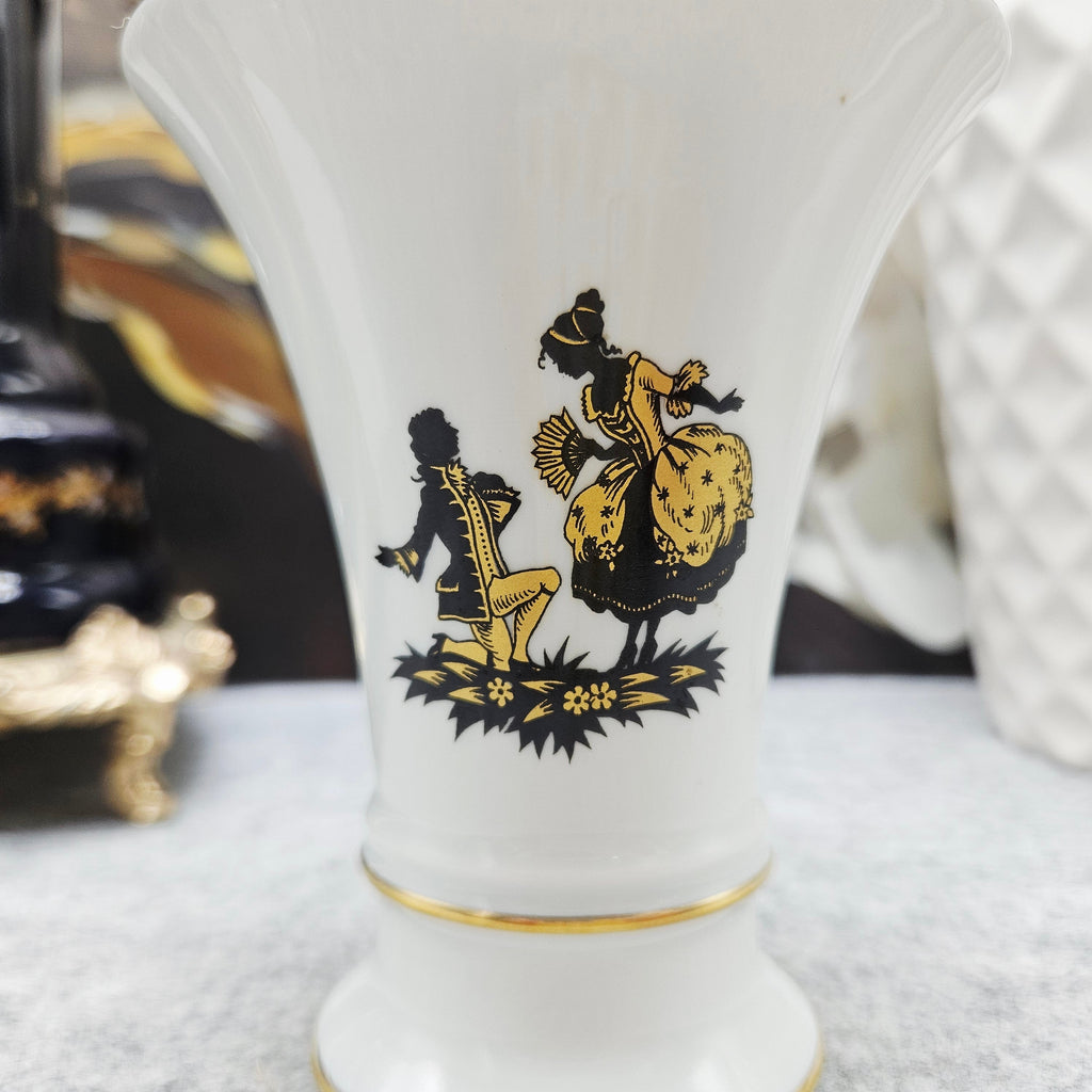 Eine dekorative Porzellanvase aus Fürstenberg (Westdeutschland), dekoriert mit einem eleganten Scherenschnittmotiv aus dem 18. Die Komposition zeigt ein Paar - eine Dame in einem weiten Kleid und einen Herrn im Frack. Das Dekor ist in einem schwarzen Scherenschnitt mit goldenen Akzenten ausgeführt, und der Rand ist mit einer prächtigen Goldbordüre eingefasst.