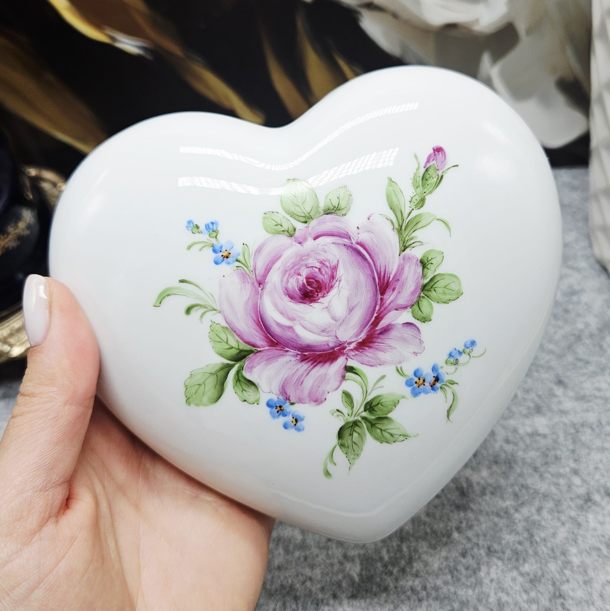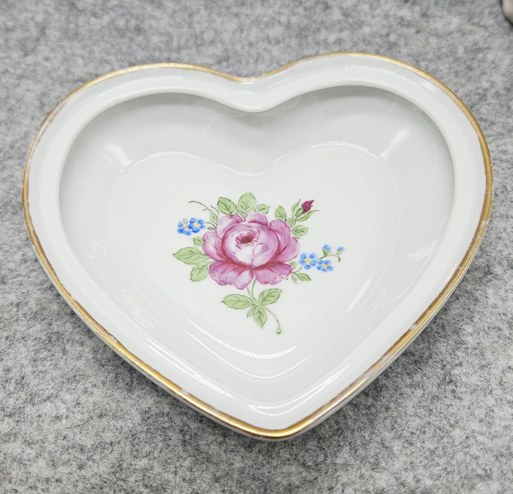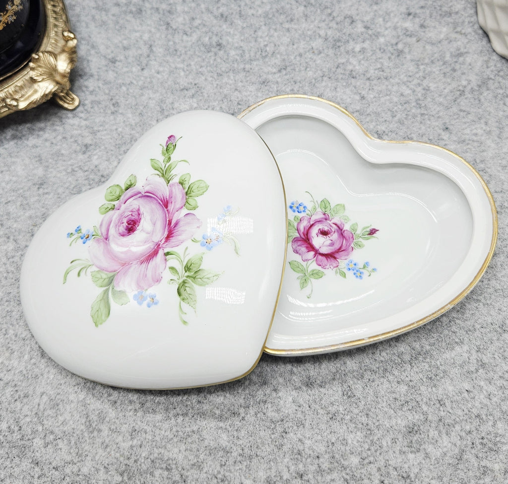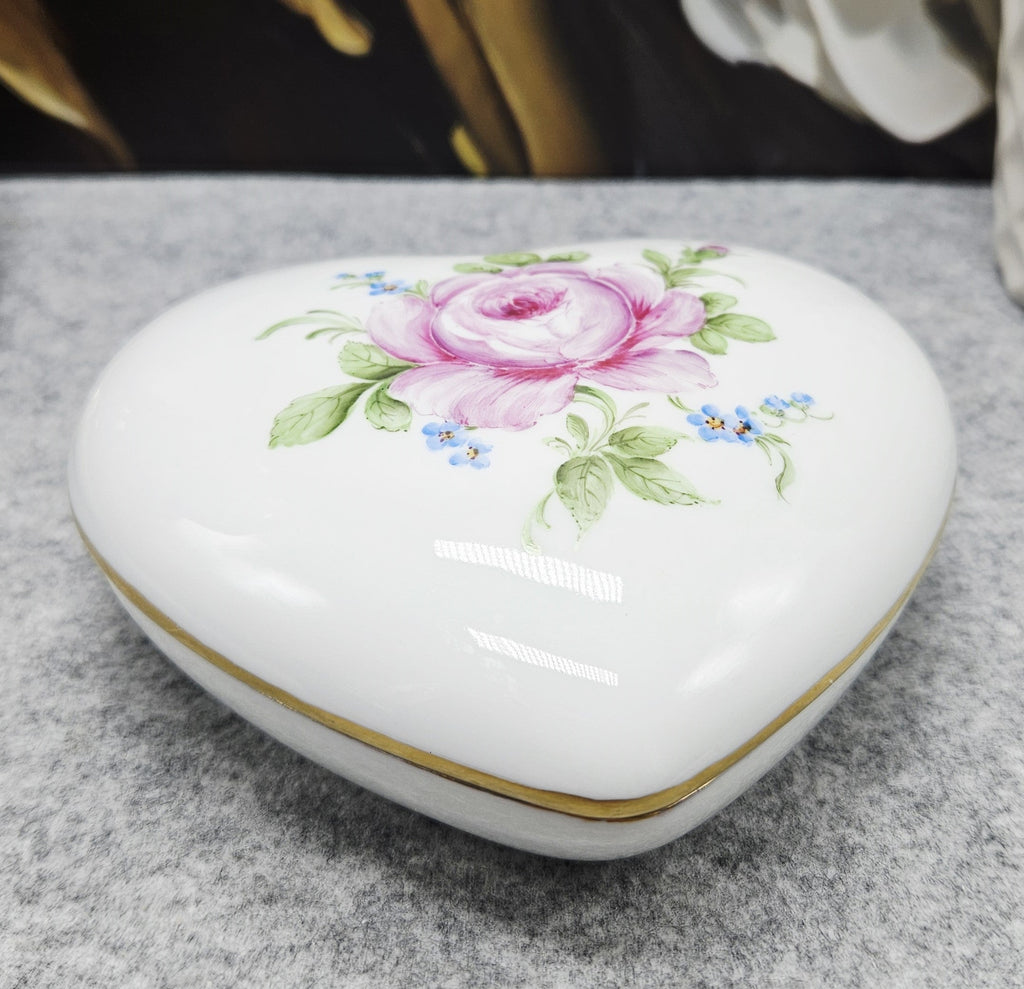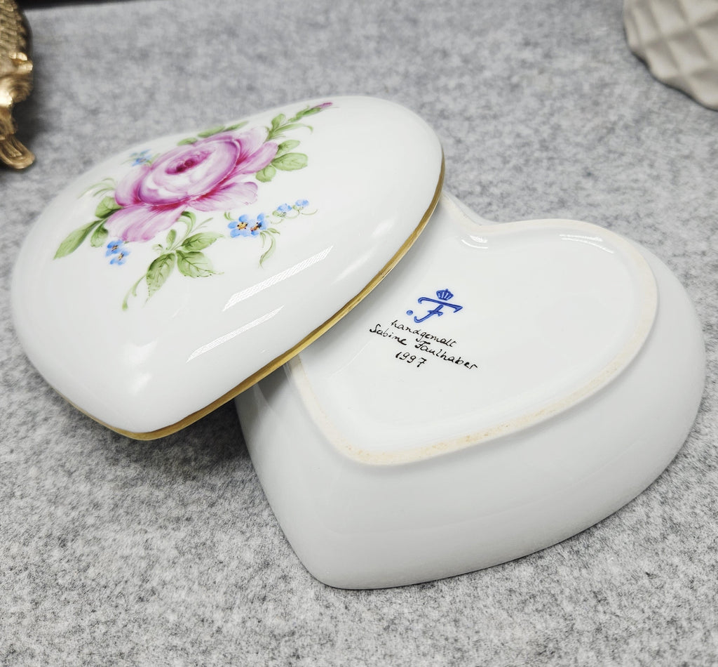 Elegante herzförmige Porzellandose aus der berühmten Manufaktur Fürstenberg. Dekoriert mit einer handgemalten Rose, umgeben von kleinen blauen Blumen, die Ränder mit einer zarten Goldbordüre verziert. Das Innere ist ebenfalls mit einem floralen Motiv verziert.