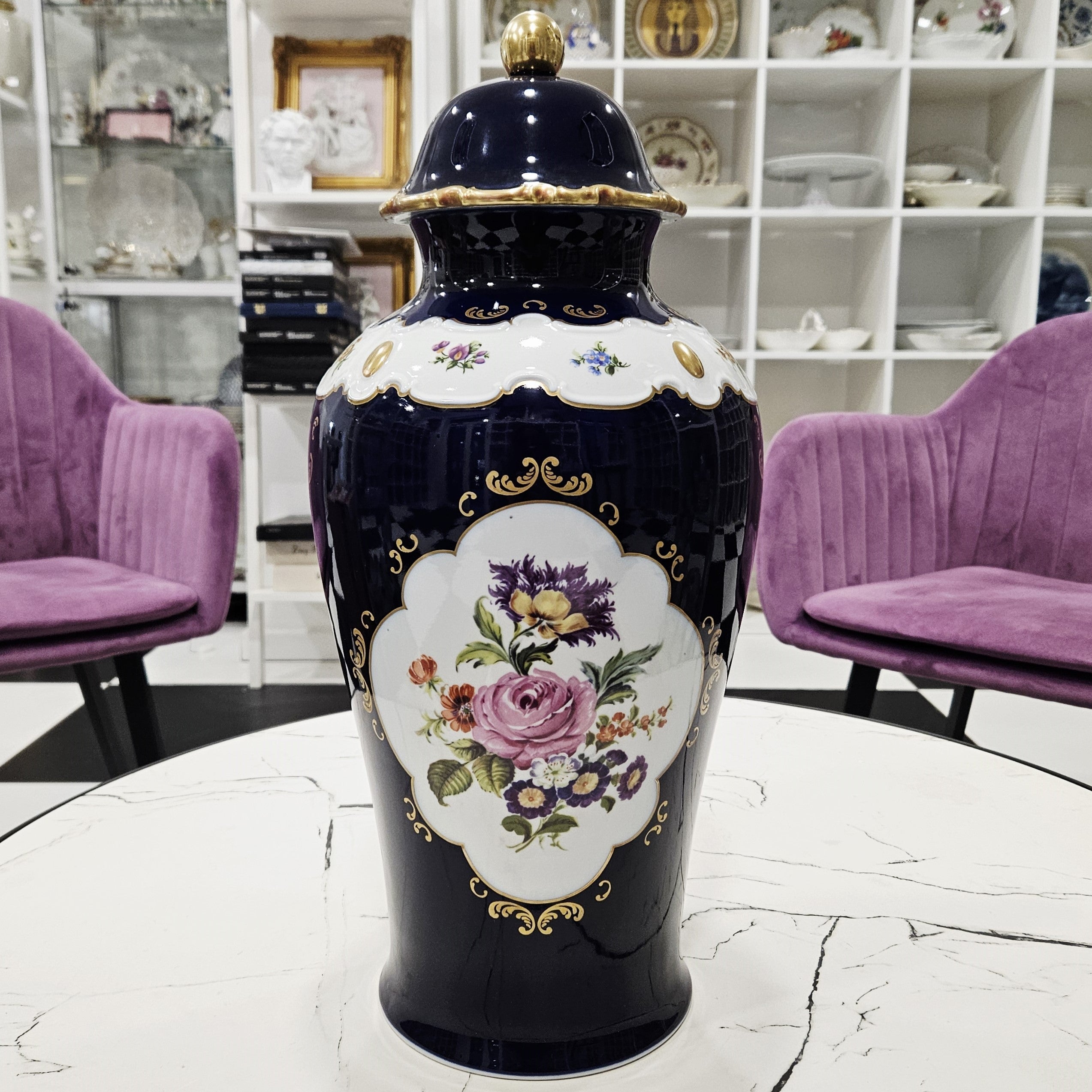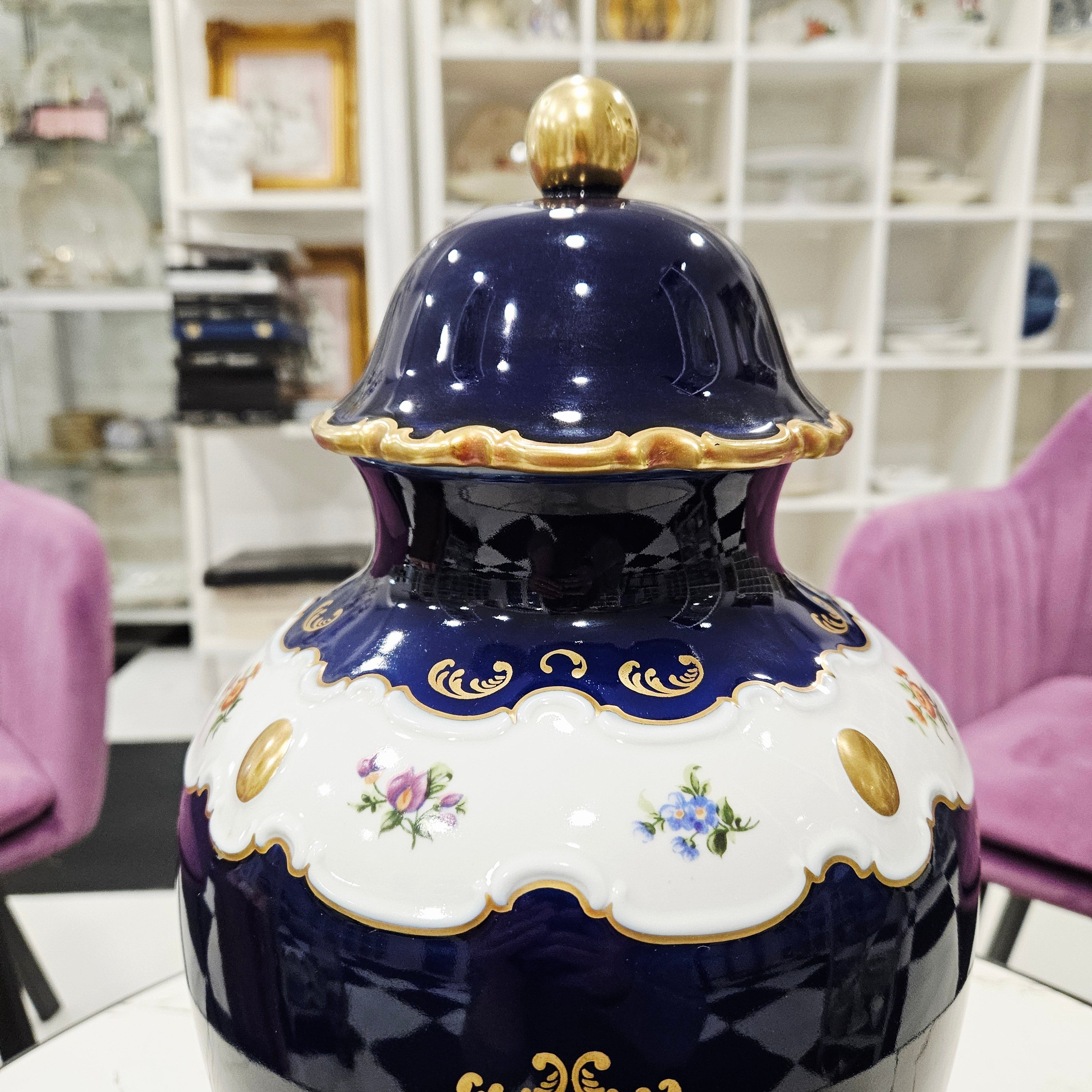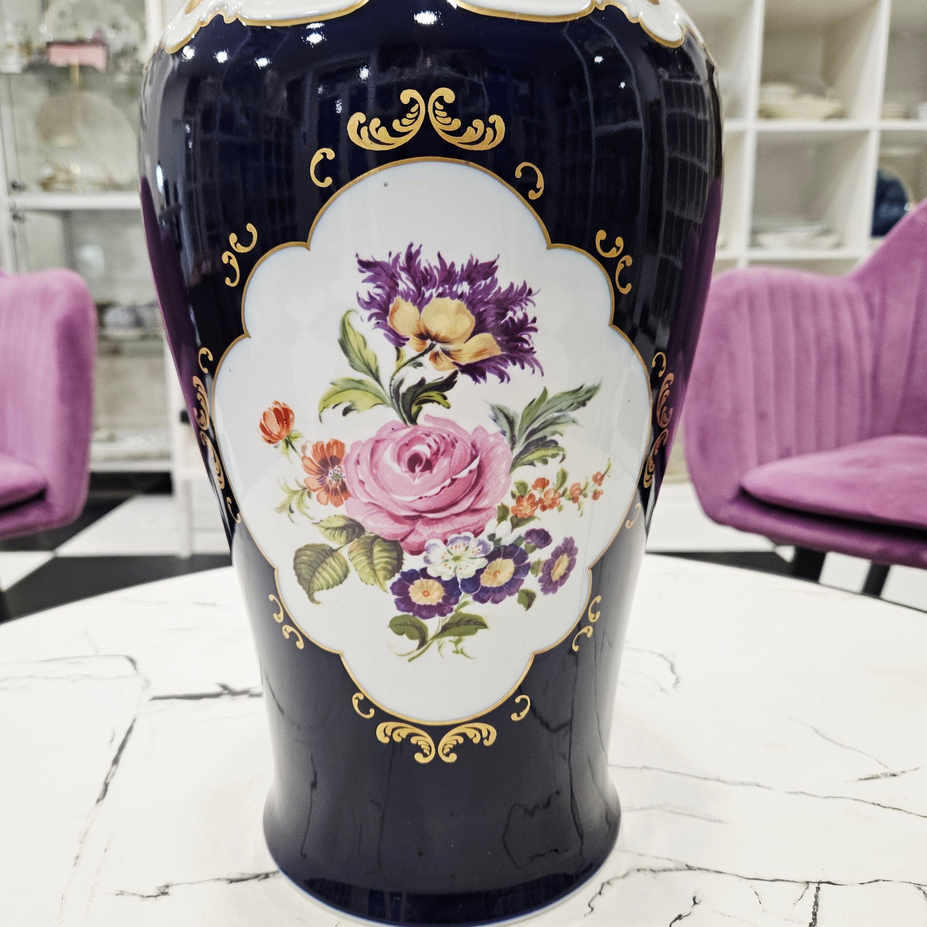 Eine exklusive, klassisch gestaltete Wallendorf-Porzellanvase mit Deckel, dekoriert in sattem Kobaltblau ("Echt Cobalt") und luxuriösen Goldakzenten. Den Mittelteil der Vase ziert ein elegantes Blumenarrangement aus Rosen und kleinen Blüten, das von dekorativen Ornamenten eingerahmt wird. Die glänzende Oberfläche und der tiefe Kobaltfarbton verleihen der Vase einen gediegenen und aristokratischen Charme.