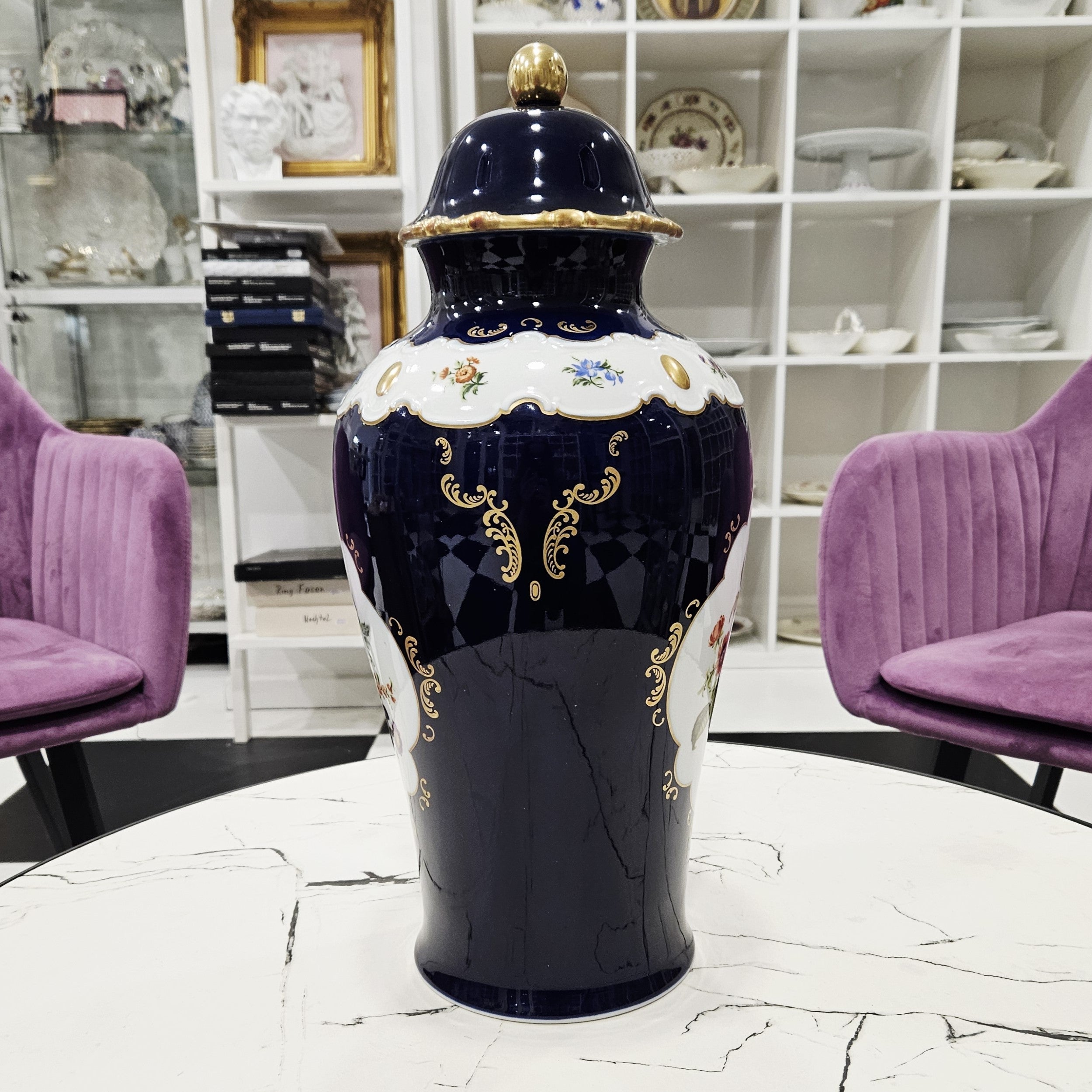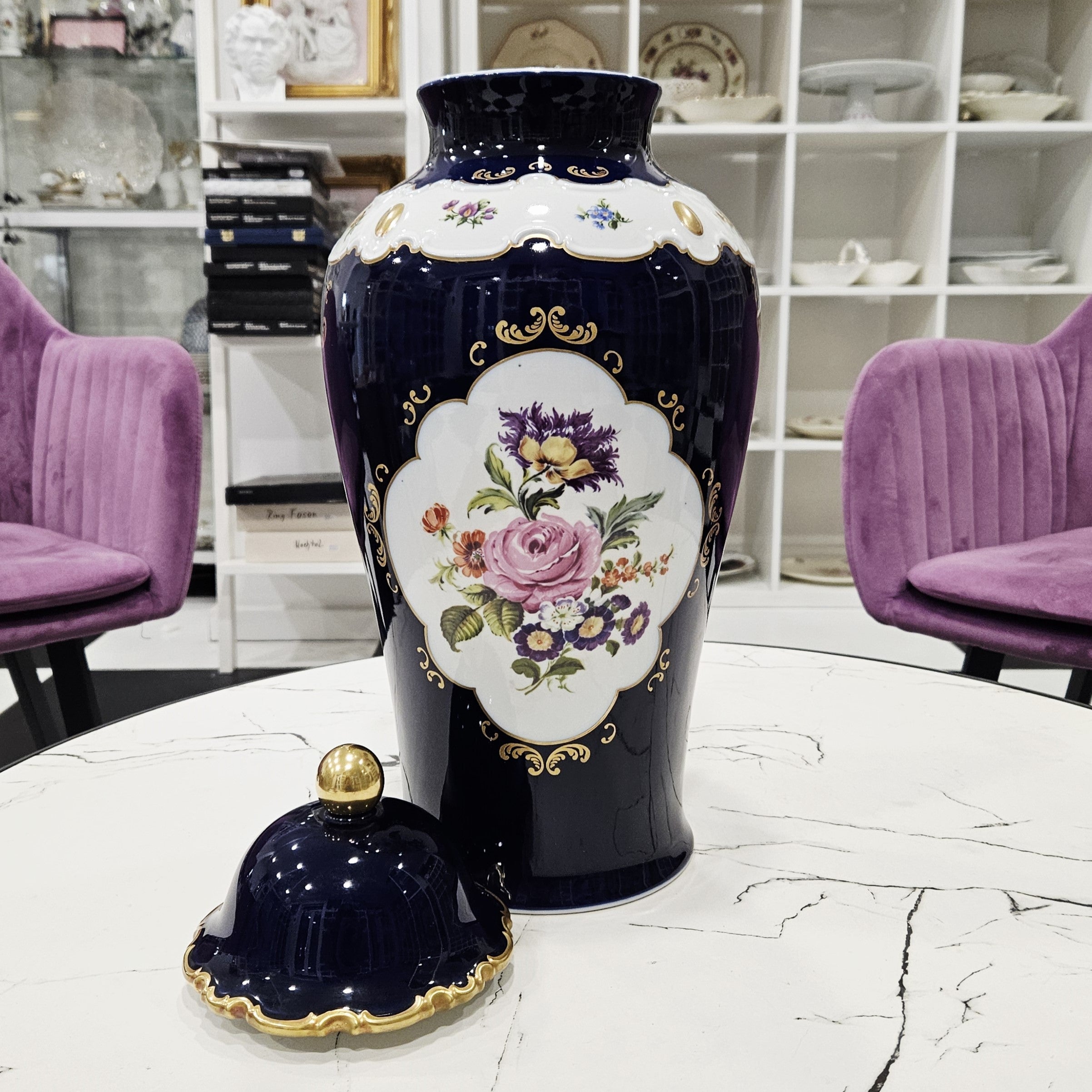 Der Deckel mit goldenem Henkel fügt sich harmonisch in das Gesamtdesign ein und unterstreicht den dekorativen Charakter des Stücks. Er ist nicht nur ein Ausstattungsdetail, sondern auch ein Porzellanstück mit Sammlerwert.