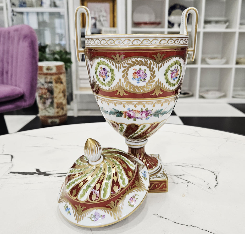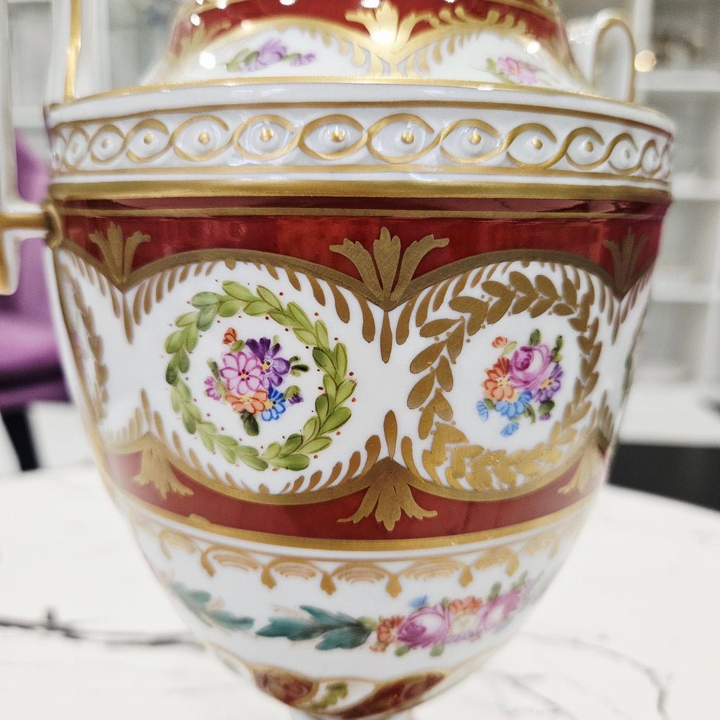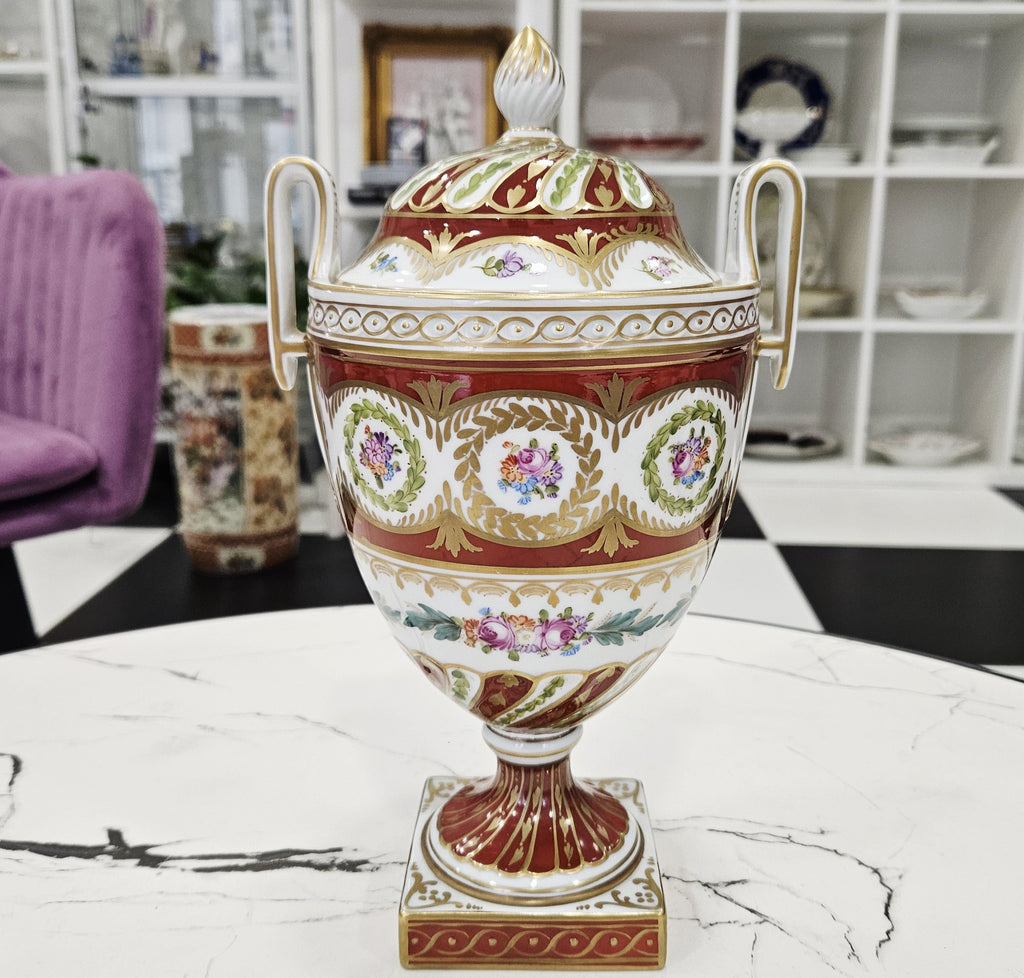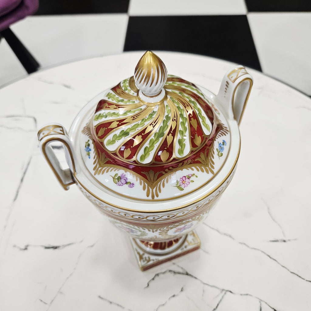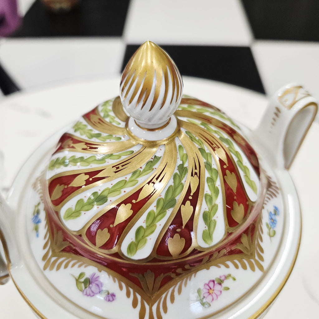 Sie ist mit exquisiten handgemalten polychromen Blumenmotiven verziert, die mit üppigem Golddekor und roten und grünen Farbkombinationen verziert sind. Der Deckel ist mit einem dekorativen gold-weißen Zierknauf gekrönt. Die Seiten sind mit ovalen Kompositionen mit Blumengirlanden und goldenen Lorbeerkränzen verziert, die den aristokratischen Charakter dieses Stücks unterstreichen.