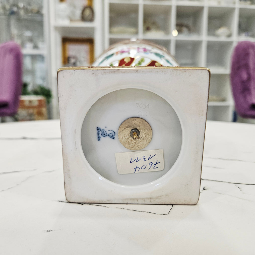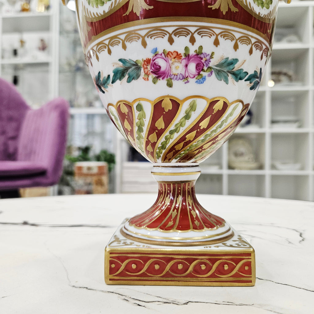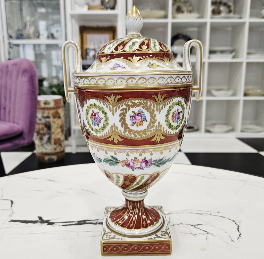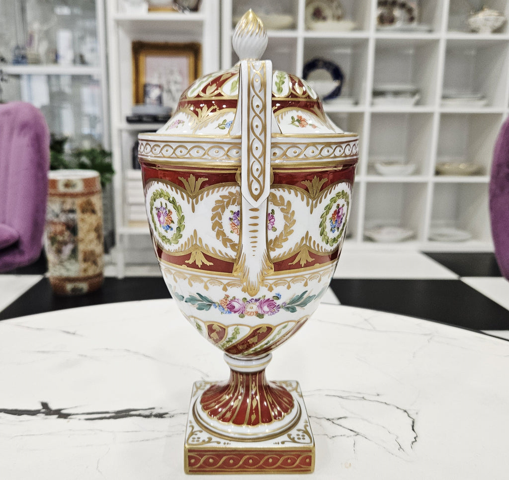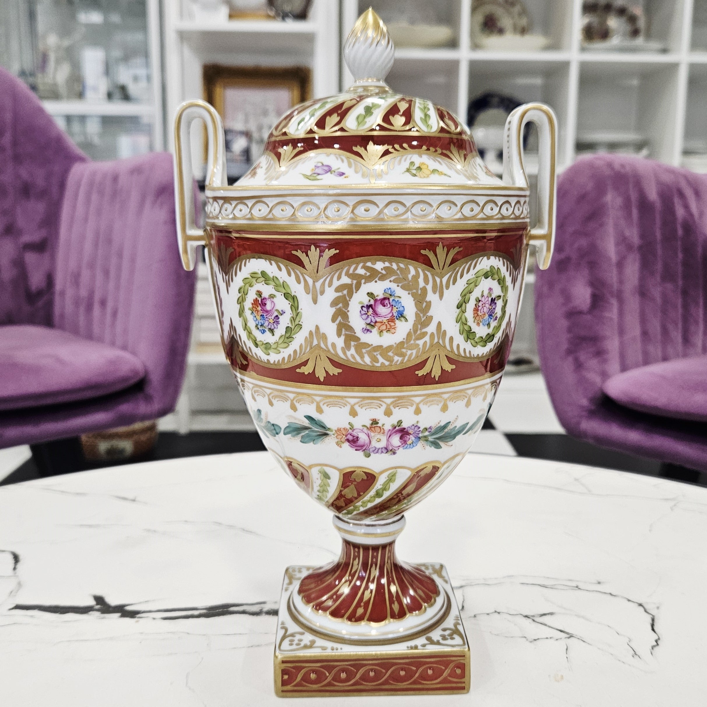 Sie ist mit exquisiten handgemalten polychromen Blumenmotiven verziert, die mit üppigem Golddekor und roten und grünen Farbkombinationen verziert sind. Der Deckel ist mit einem dekorativen gold-weißen Zierknauf gekrönt. Die Seiten sind mit ovalen Kompositionen mit Blumengirlanden und goldenen Lorbeerkränzen verziert, die den aristokratischen Charakter dieses Stücks unterstreichen.