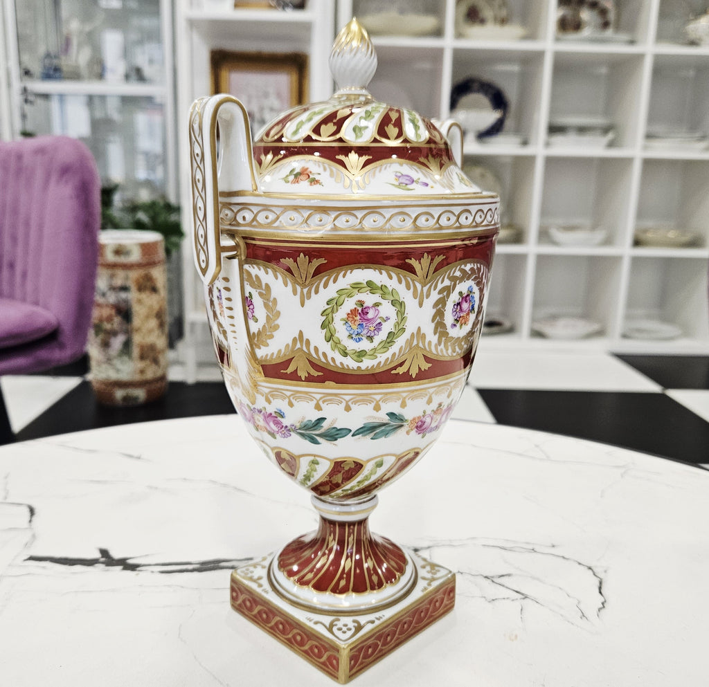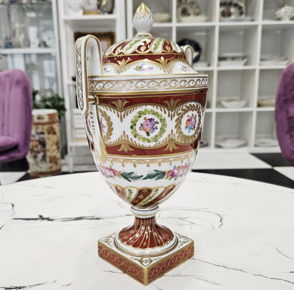 Luxuriöse Potschappel Dresden Porzellanvase mit Deckel, hergestellt in Deutschland. Die Vase ist amphorenförmig, hat zwei stilisierte Henkel an den Seiten und steht auf einem quadratischen Sockel.