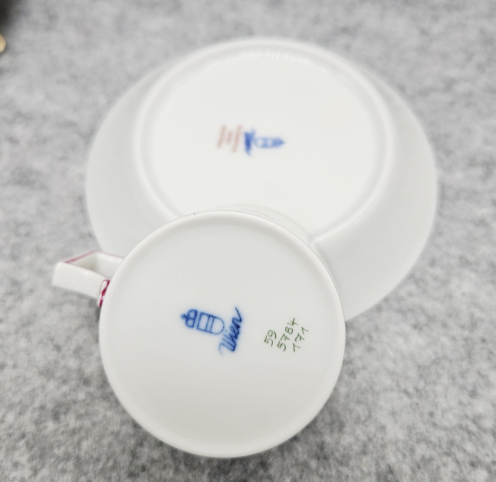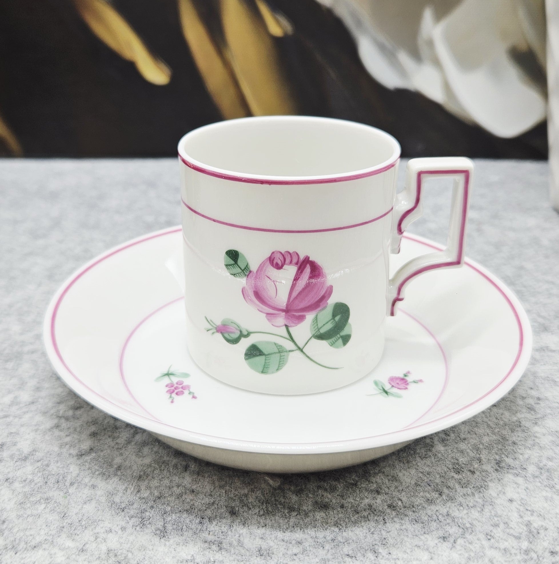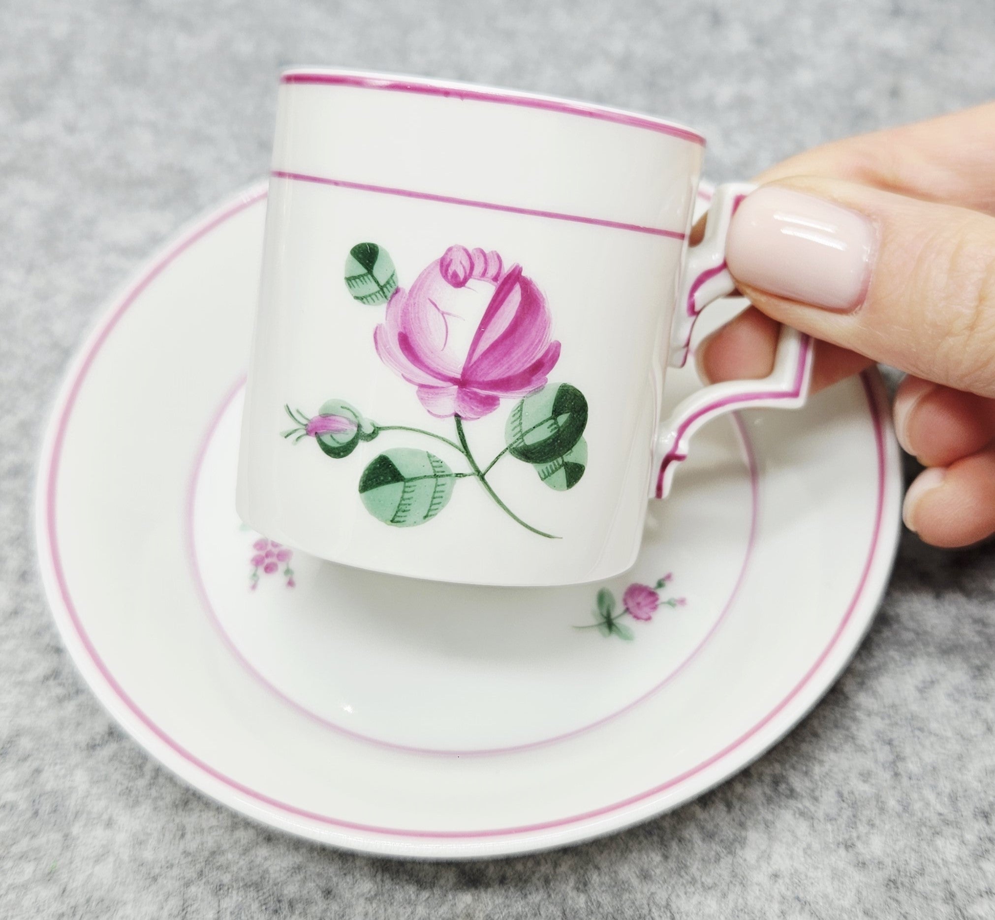 Schöner Porzellanbecher von Augarten Wien Austria mit handgemalter Blumenblüte. Das Design wird durch die geometrischen Formen des Henkels und die beiden rosafarbenen Linien, die das Bild einrahmen, hervorgehoben.