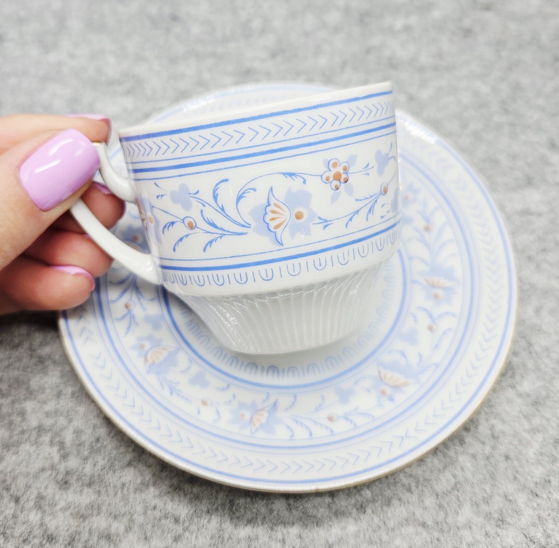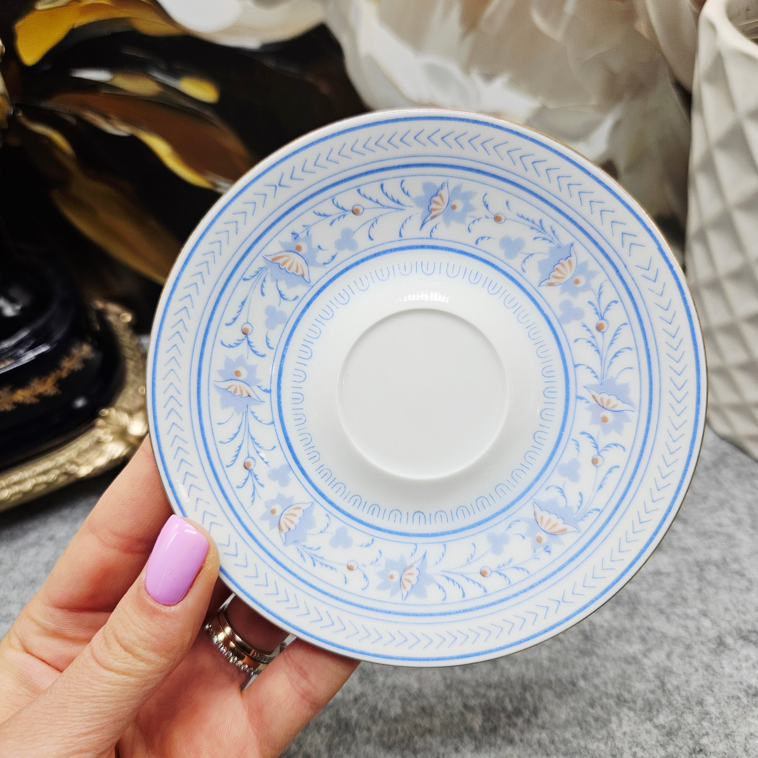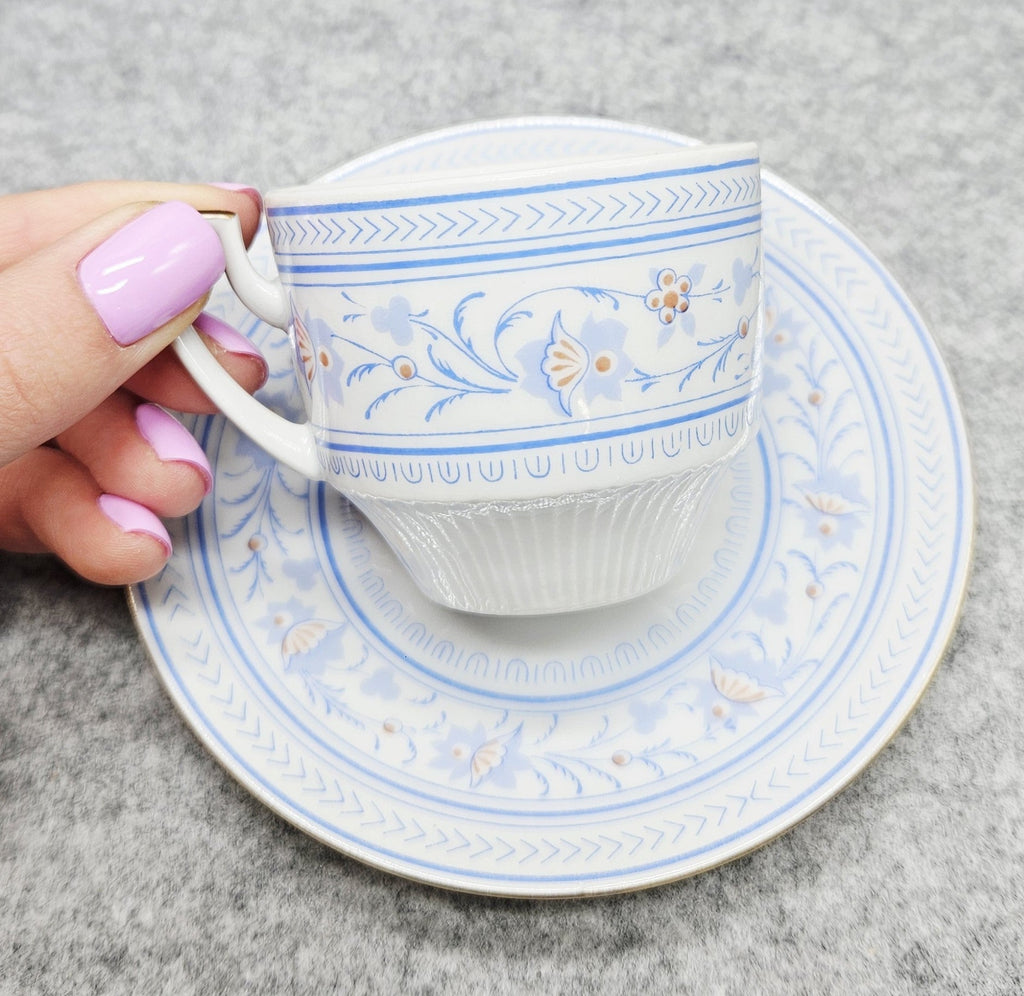 Die Oberfläche von Tasse und Untertasse ist mit feinen floralen Motiven, geometrischen Bordüren und einem eleganten Goldrand verziert. Das geprägte Muster auf dem Boden verleiht dem Set einen unverwechselbaren und leichten Touch.