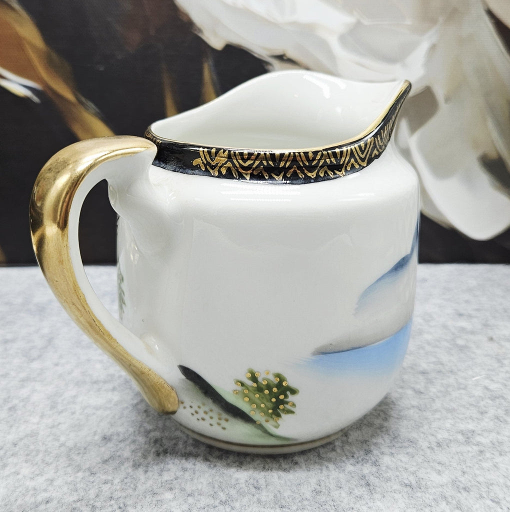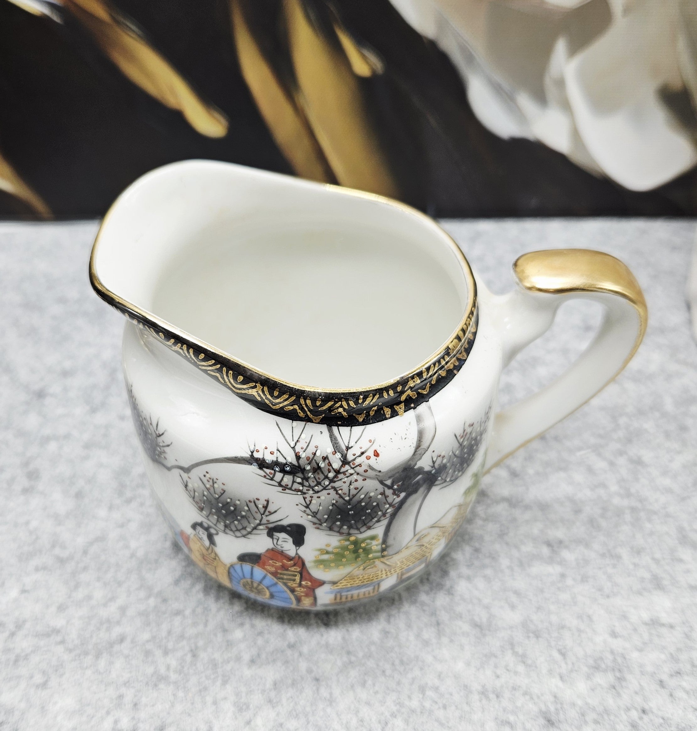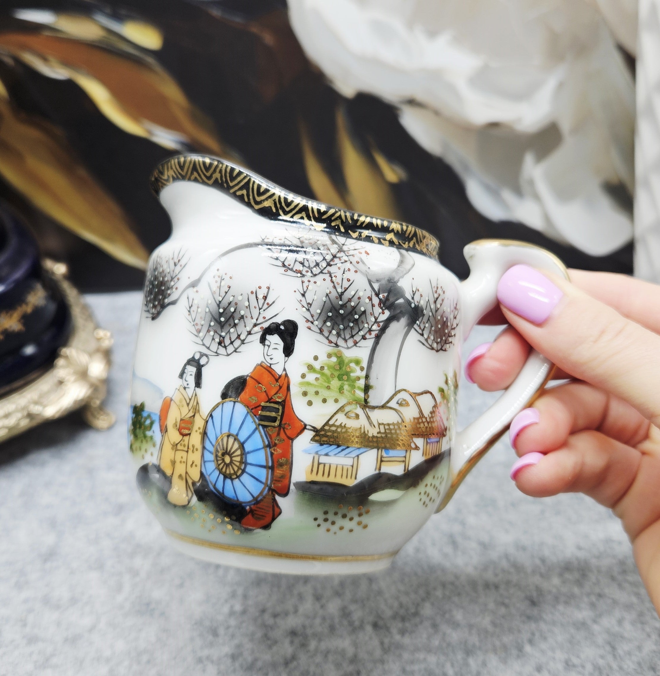 Eine exquisite japanische Porzellankanne, handbemalt mit einer traditionellen Szene: elegant gekleidete Geishas, blühende Bäume und zarte Landschaftsmotive. Die schwarz-goldenen Details verleihen einen Hauch von Luxus.