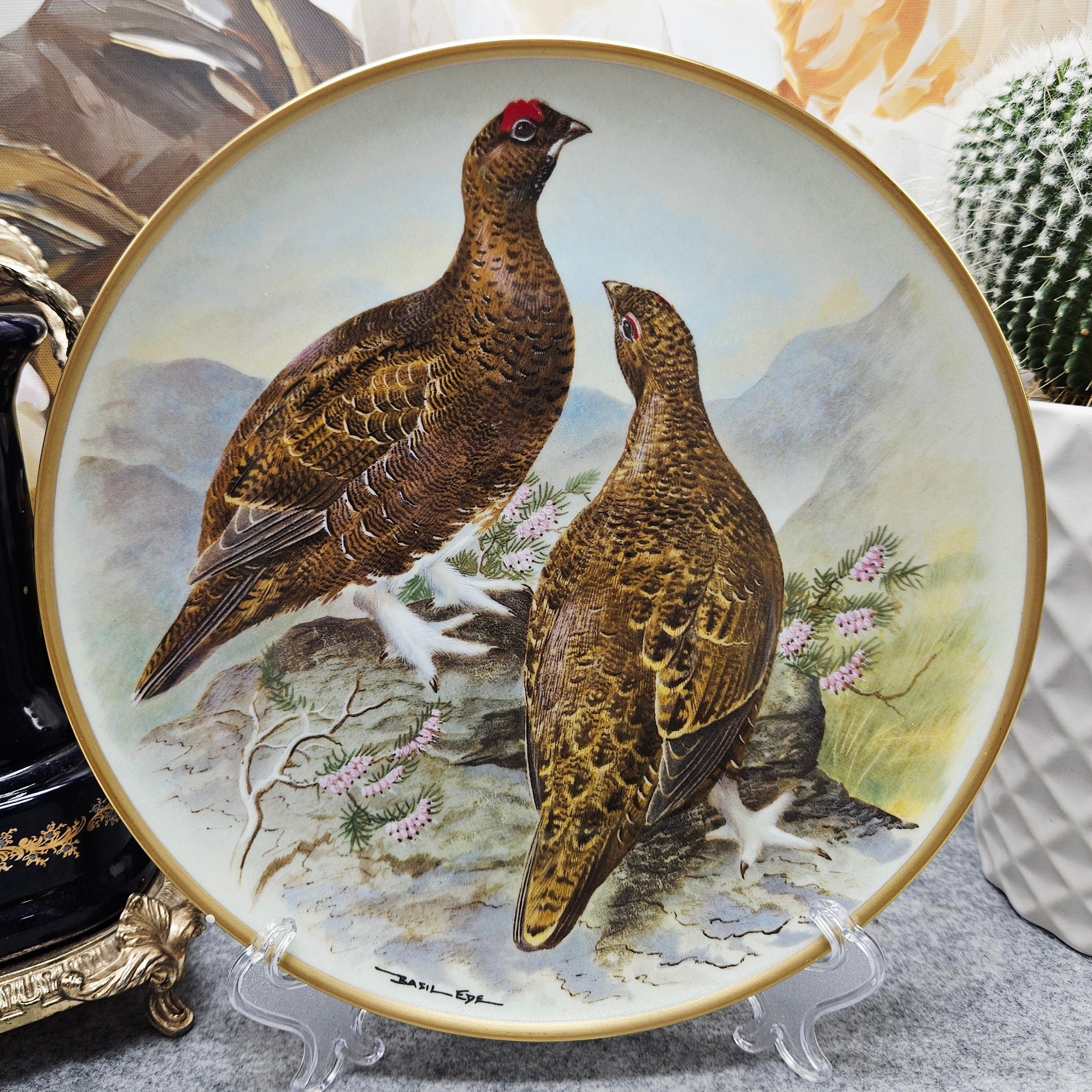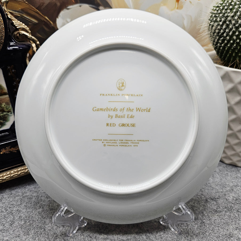 Sammelteller von Franklin Porcelain aus der berühmten Serie "Gamebirds of the World" von 1979, die auf dem Gemälde "Red Grouse" des berühmten Naturmalers Basil Ede basiert. Der Teller zeigt die beiden Vögel in einer natürlichen Gebirgslandschaft, mit subtilen Braun-, Kupfer- und Erdtönen, exquisiten Details, präzisen Federmustern und Texturen. Es handelt sich um dekoratives Porzellan, das wie ein echtes kleines Gemälde auf Porzellan aussieht.