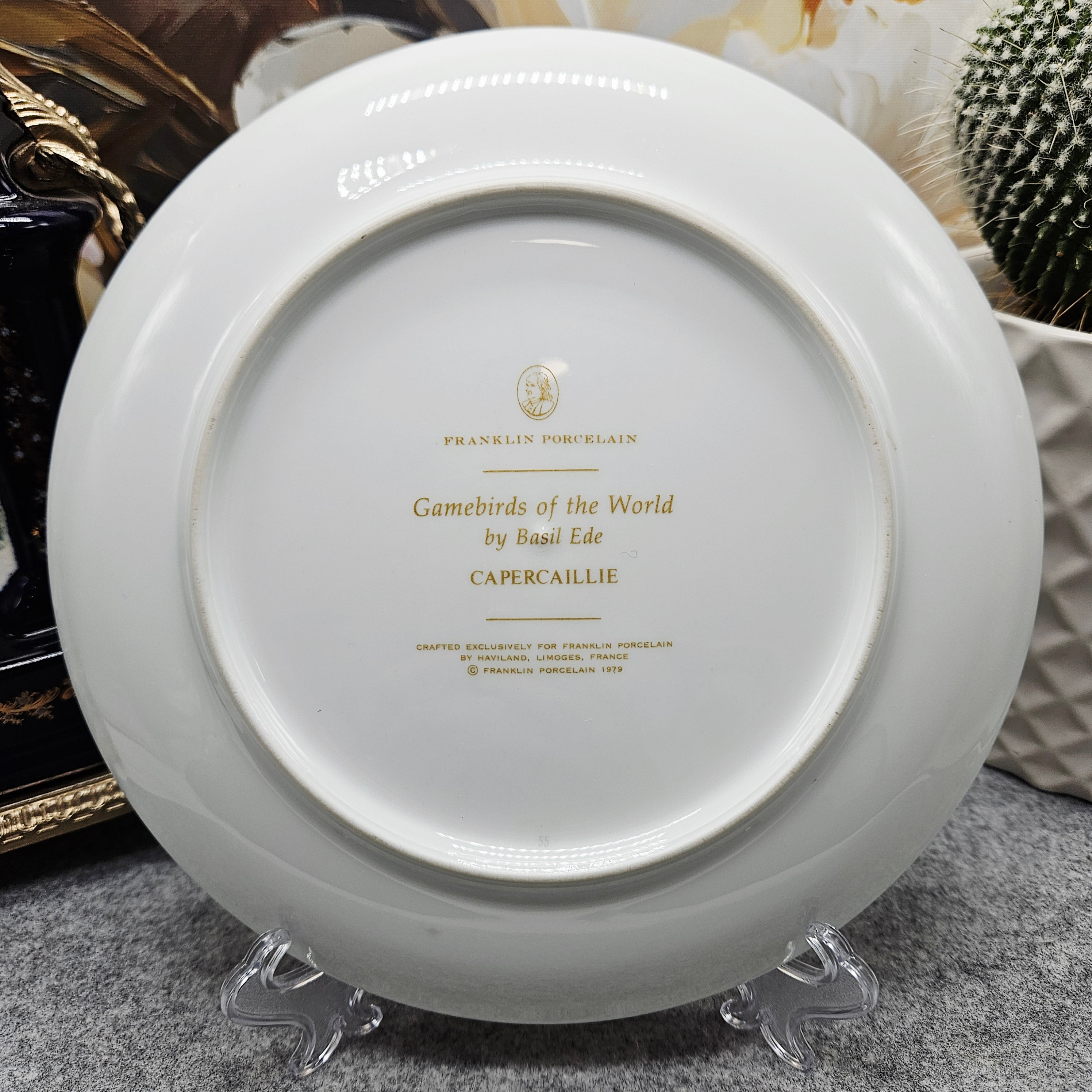 Sammelteller von Franklin Porcelain aus der Serie "Gamebirds of the World", 1979, mit dem Werk "Capercaillie" des berühmten Tierillustrators Basil Ede (Raufußhuhn). Der Teller zeigt einen spektakulären, majestätischen Vogel vor einer natürlichen Kulisse mit ausgebreiteten Flügeln und leuchtenden, satten Farben. Die Komposition zeichnet sich durch ihre Detailgenauigkeit, die reiche Farbtiefe und die realistische malerische Ausführung aus - ein wahres Kunstwerk aus Porzellan.