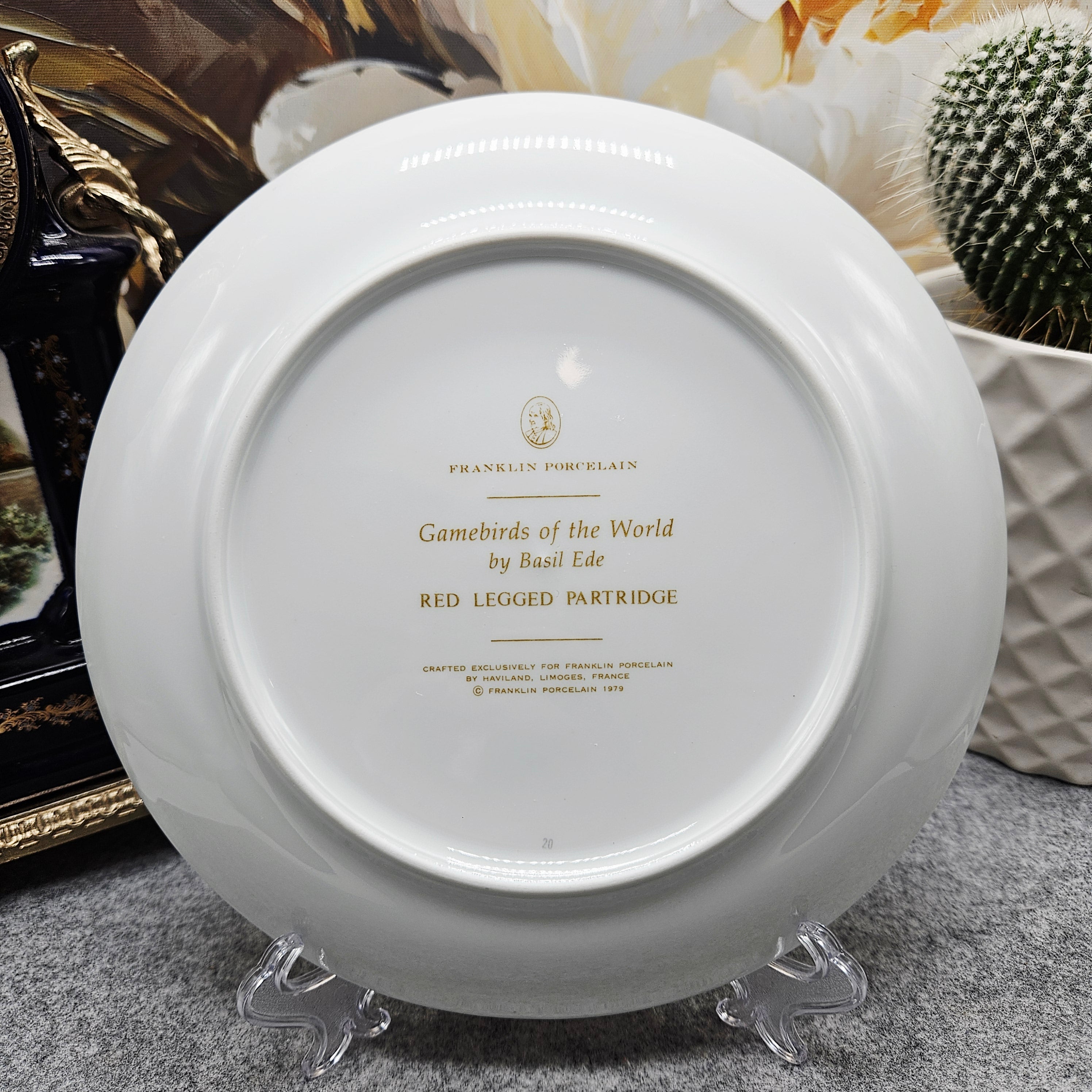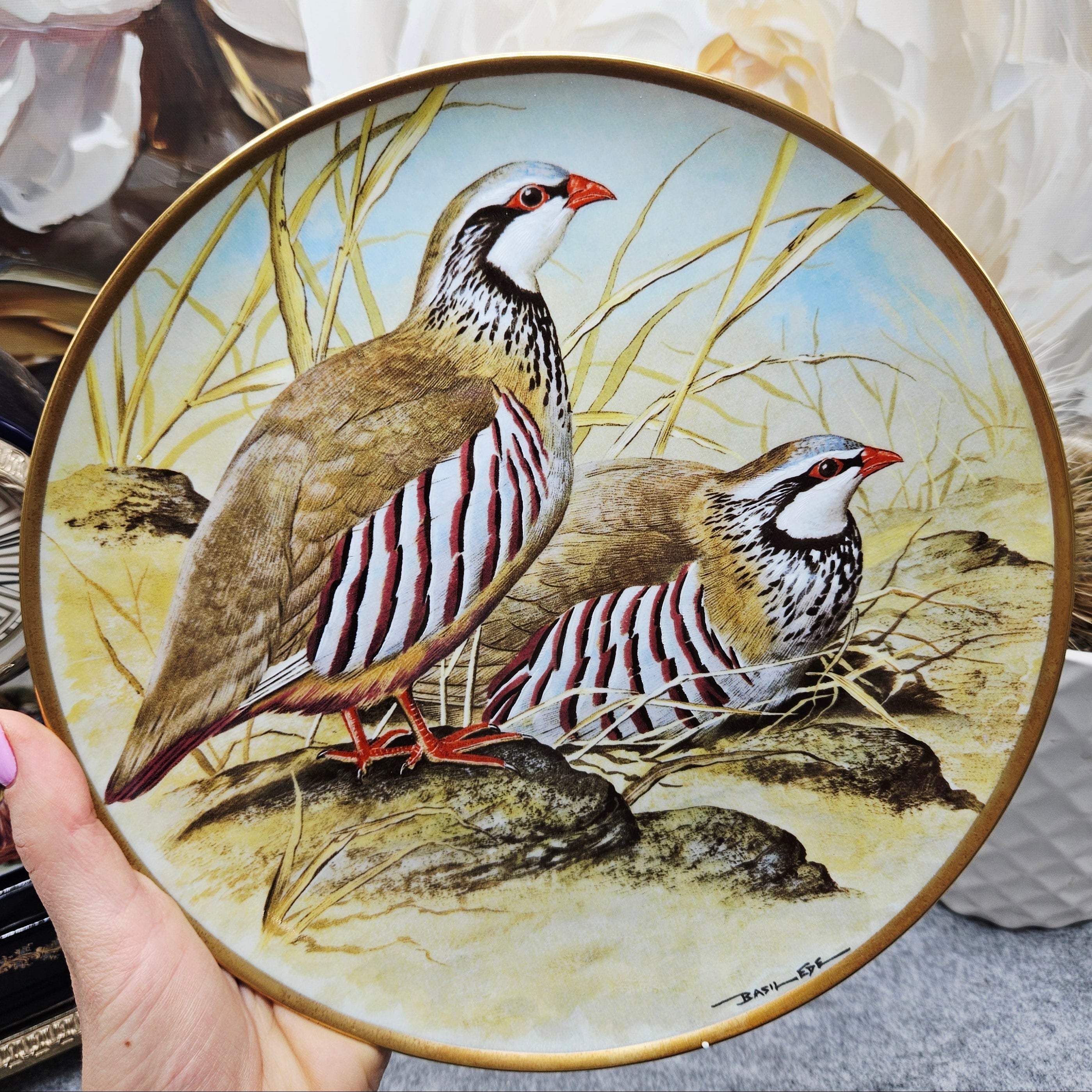 Sammelteller von Franklin Porcelain aus der Serie "Gamebirds of the World", 1979, nach dem Motiv des Rothuhns des berühmten Tiermalers Basil Ede. Diese Komposition zeichnet sich durch ihre lebhaften Farben, kontrastreichen Muster und die außergewöhnliche Detailtreue der Federn aus. Die Vögel sind vor einem natürlichen Hintergrund dargestellt, umgeben von warmen Beige- und Erdtönen, während die roten Details dem Werk Charakter und einen starken visuellen Akzent verleihen.