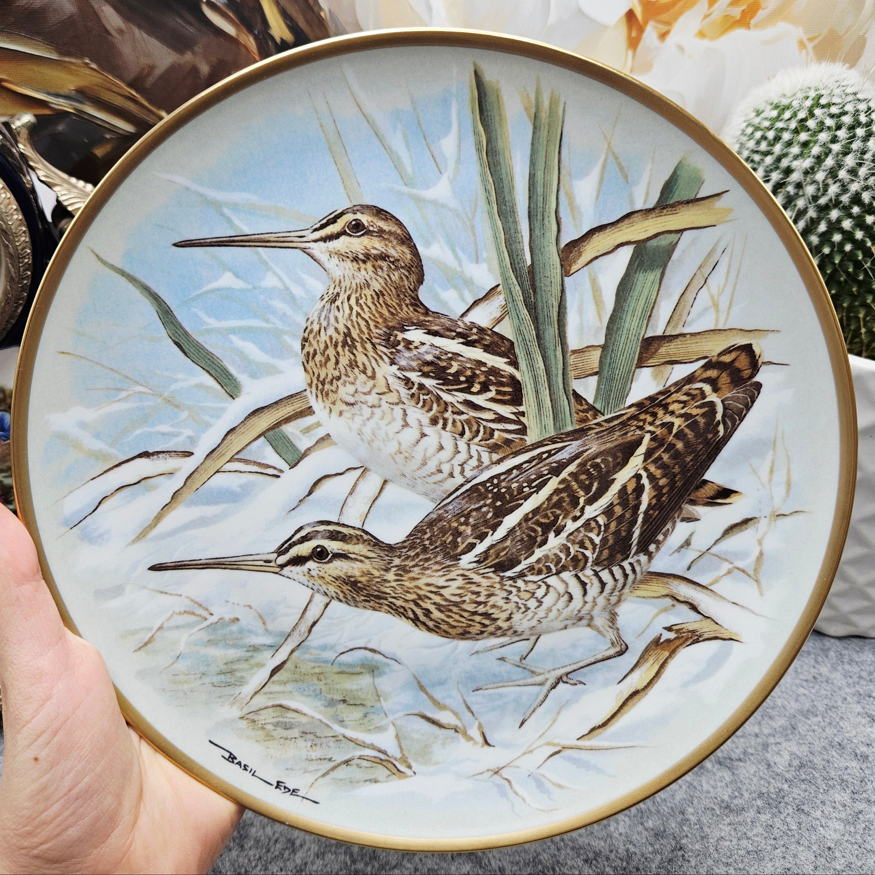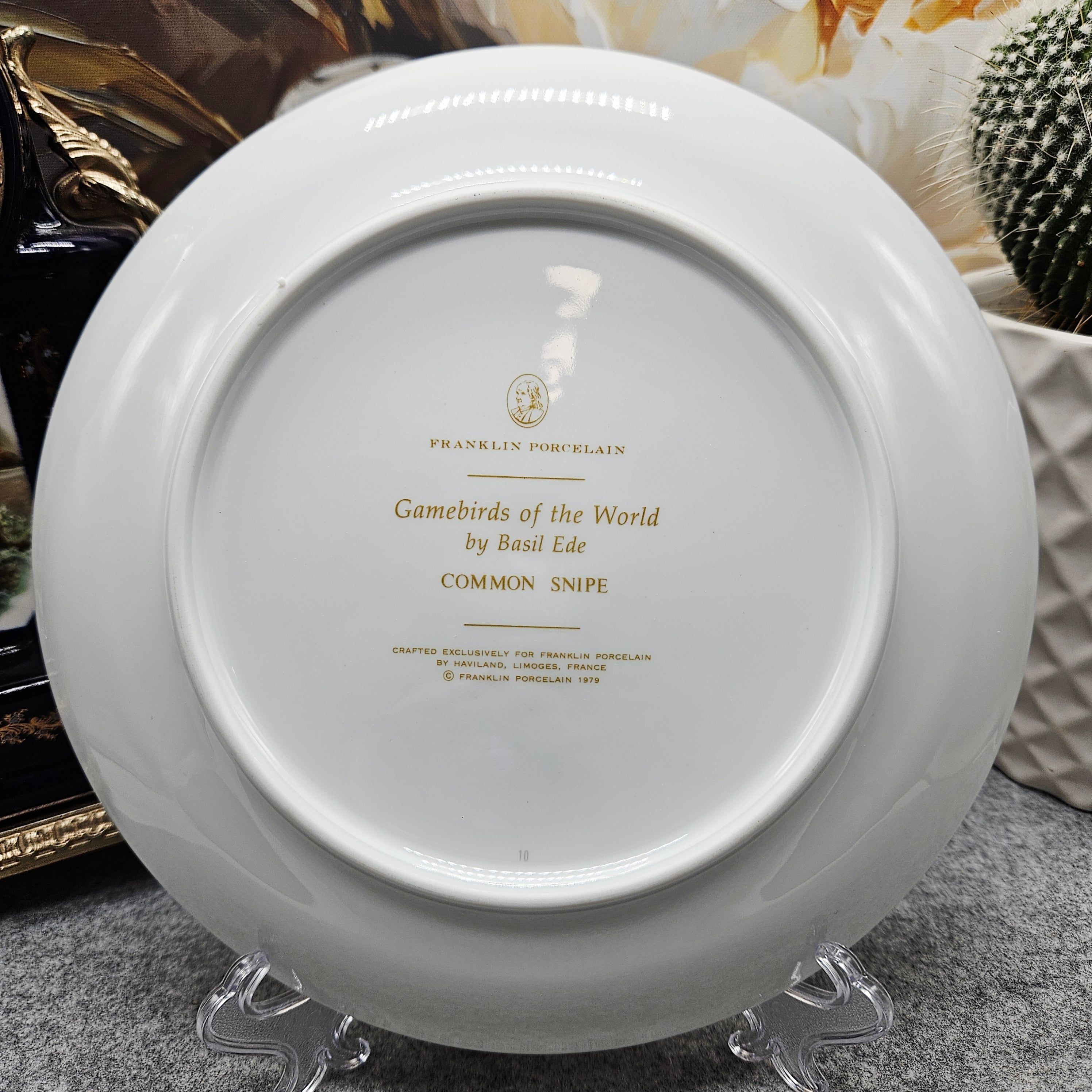 Franklin Porcelain Sammelteller aus der Serie "Gamebirds of the World", 1979, mit dem Gemälde "Common Snipe" des berühmten britischen Naturmalers Basil Ede. Die Komposition zeigt zwei Vögel in einer Winterlandschaft - die zarten Pastellfarben, die präzisen Details, die natürlichen Texturen von Schnee, Gräsern und Federn erwecken den Eindruck einer echten, lebendigen Naturkulisse.