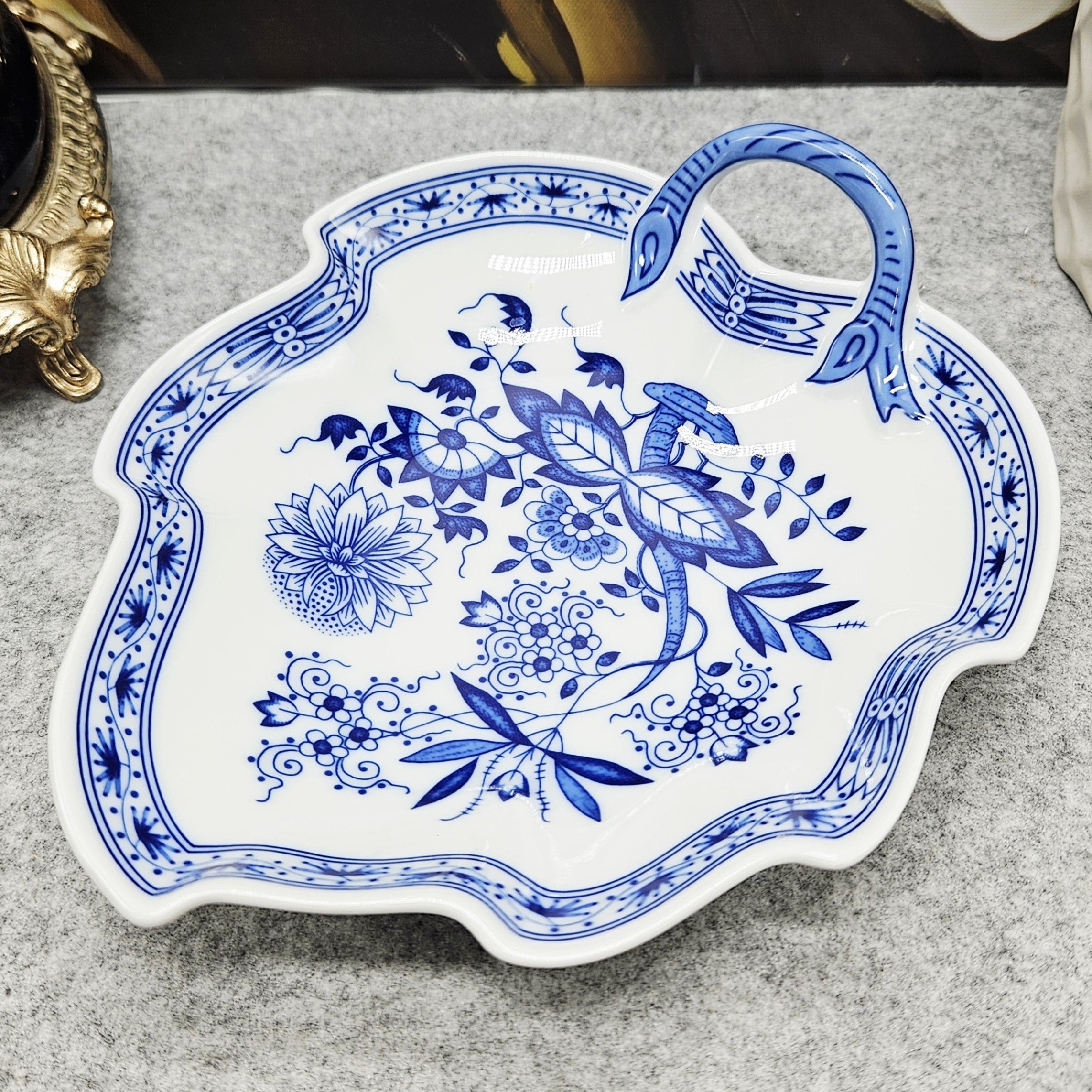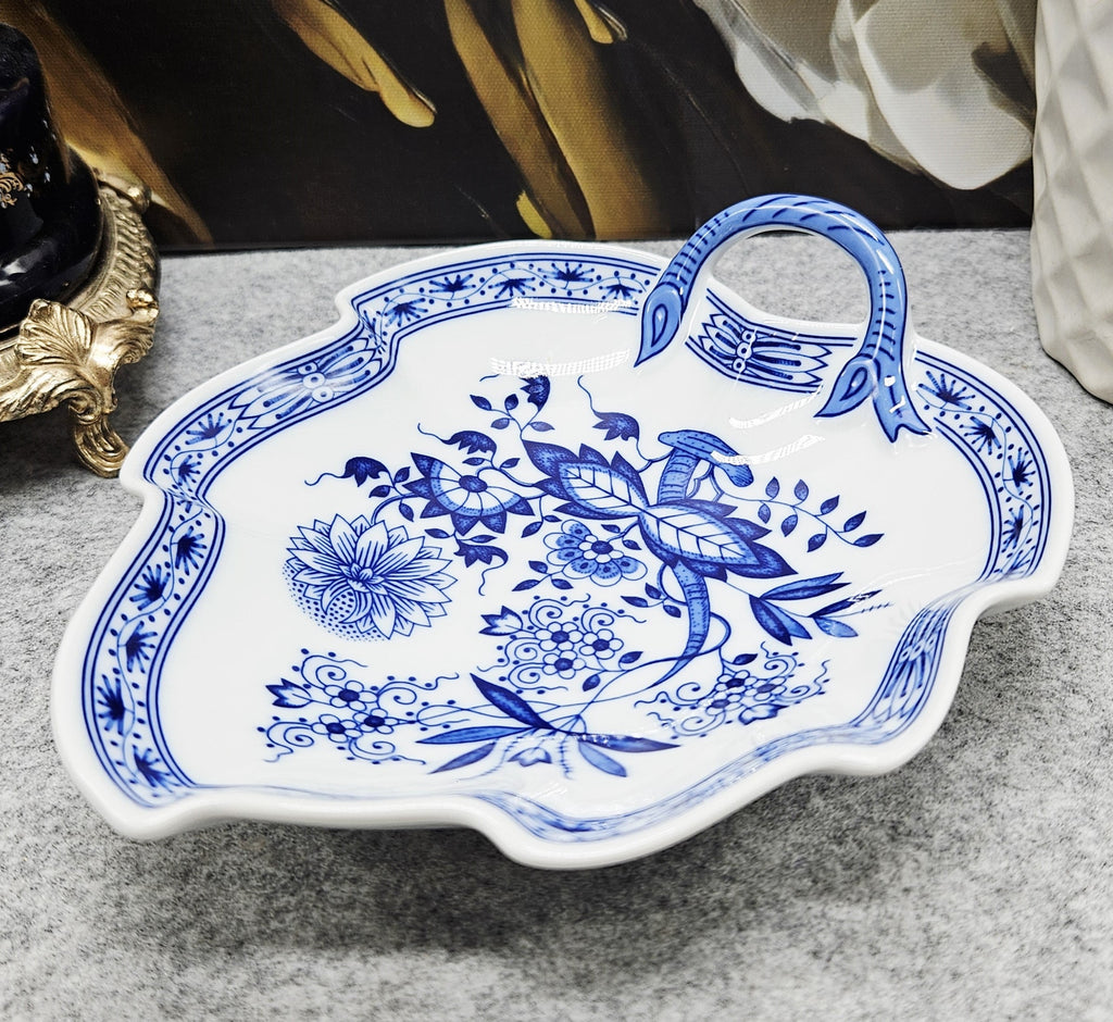 Diese Servierplatte aus weißem Porzellan mit Zwiebelmuster ist ein klassisches Beispiel für deutsche Porzellankunst. Sein elegantes Design, das jahrhundertelange Tradition und tadellose Handwerkskunst vereint, wird Ihren Tisch mit exquisitem Stil und Raffinesse bereichern.
