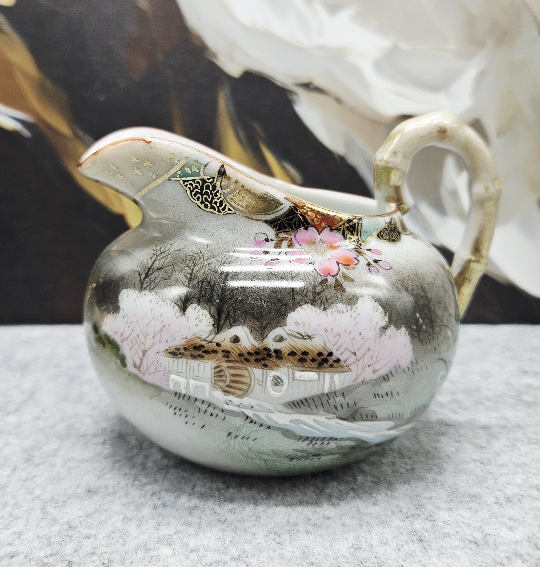 Diese Kanne ist mit einer zarten japanischen Landschaft verziert: ein Bach, Häuser, blühende Sakura und Berge. Pastellfarbene Grün- und Grautöne werden mit rosa Blumen und goldenen Akzenten kombiniert.