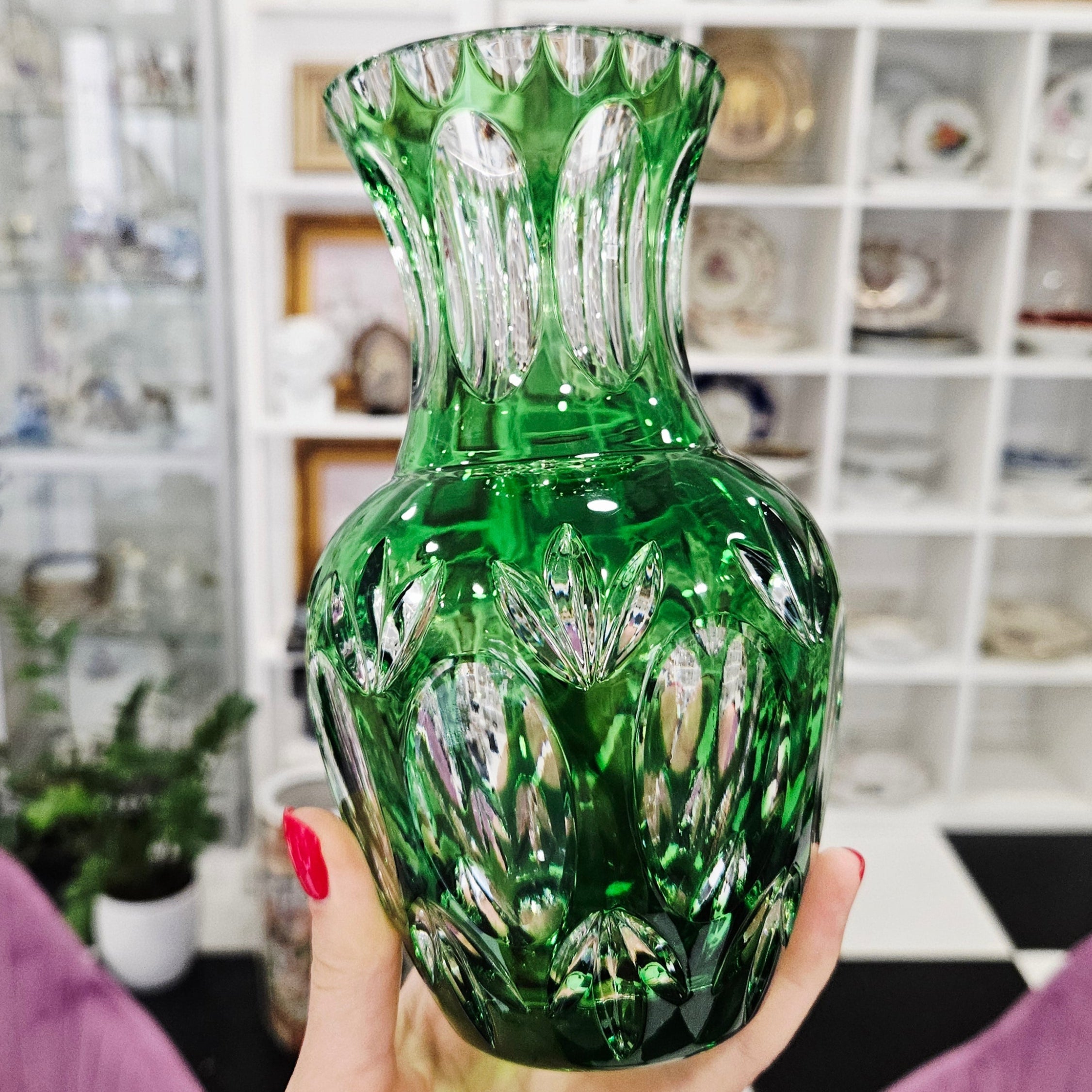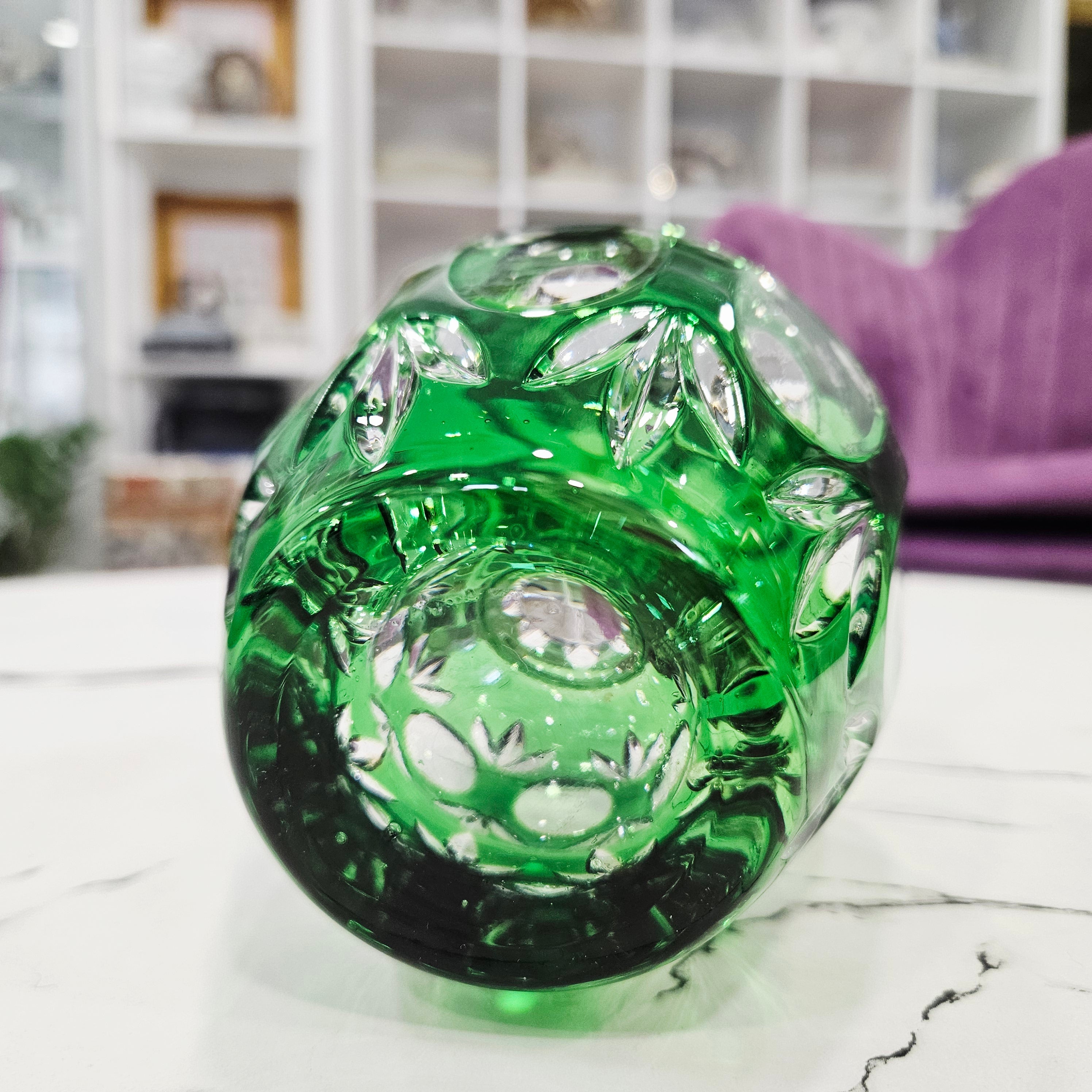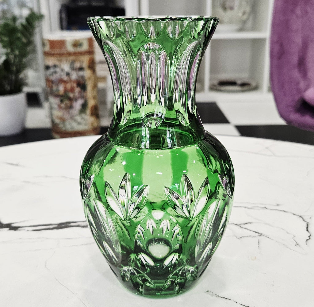 Das sattgrüne Kristall funkelt anmutig im Licht, während die tief geschliffenen Muster ein spektakuläres Spiel von Licht und Reflexen erzeugen. Diese Vase zeichnet sich durch ihre harmonischen Proportionen und ihre ausdrucksstarke Form aus, die auch ohne Blumen ein Blickfang ist.