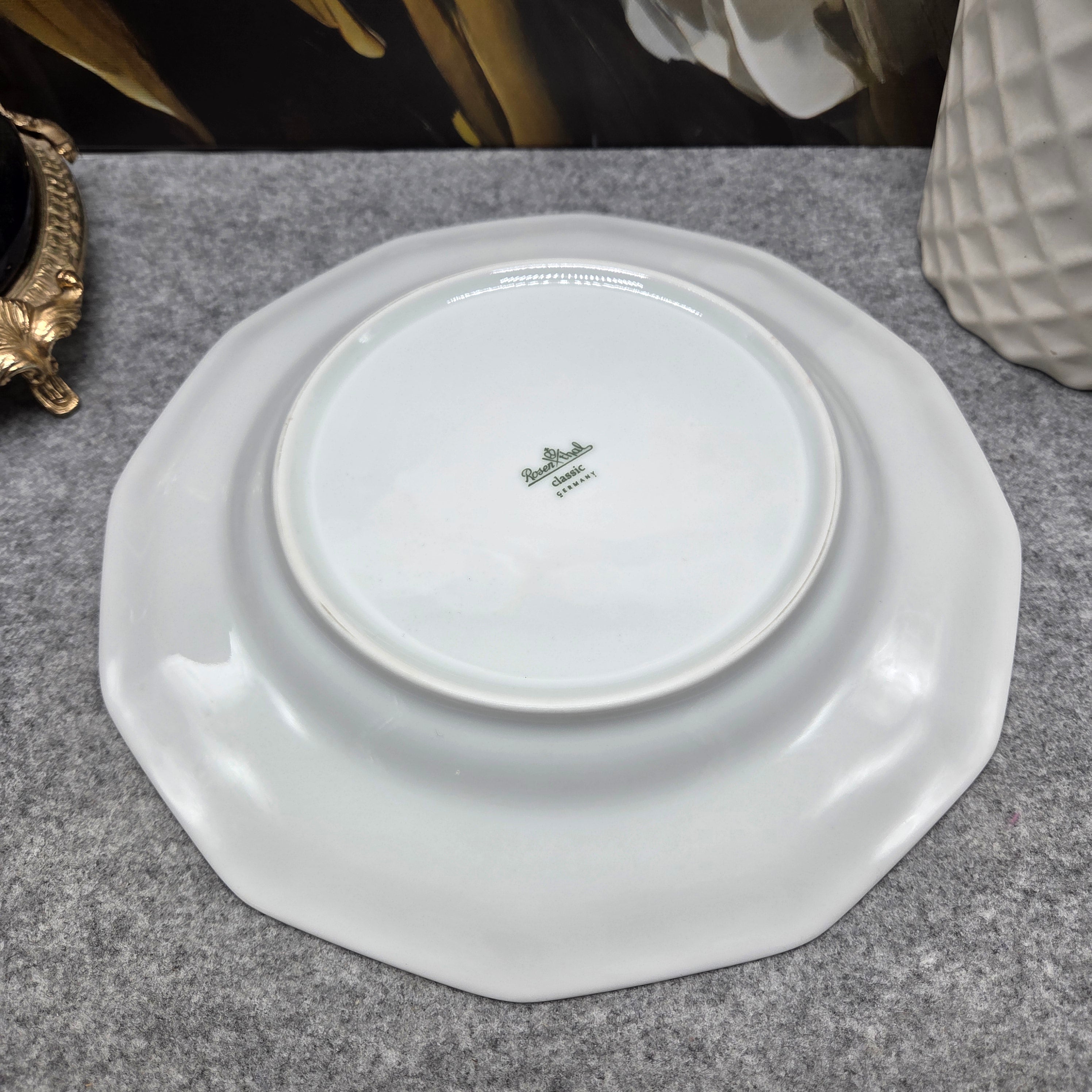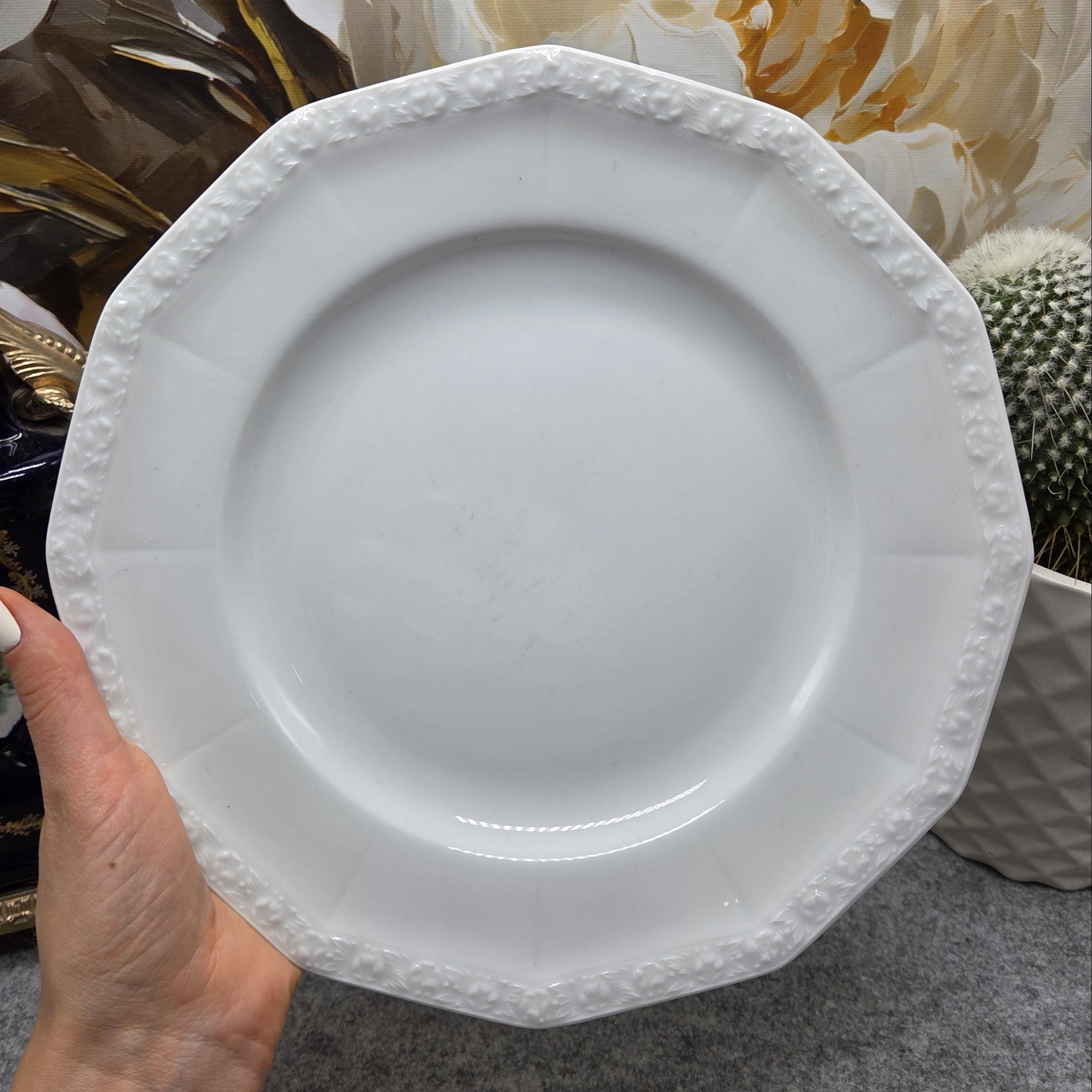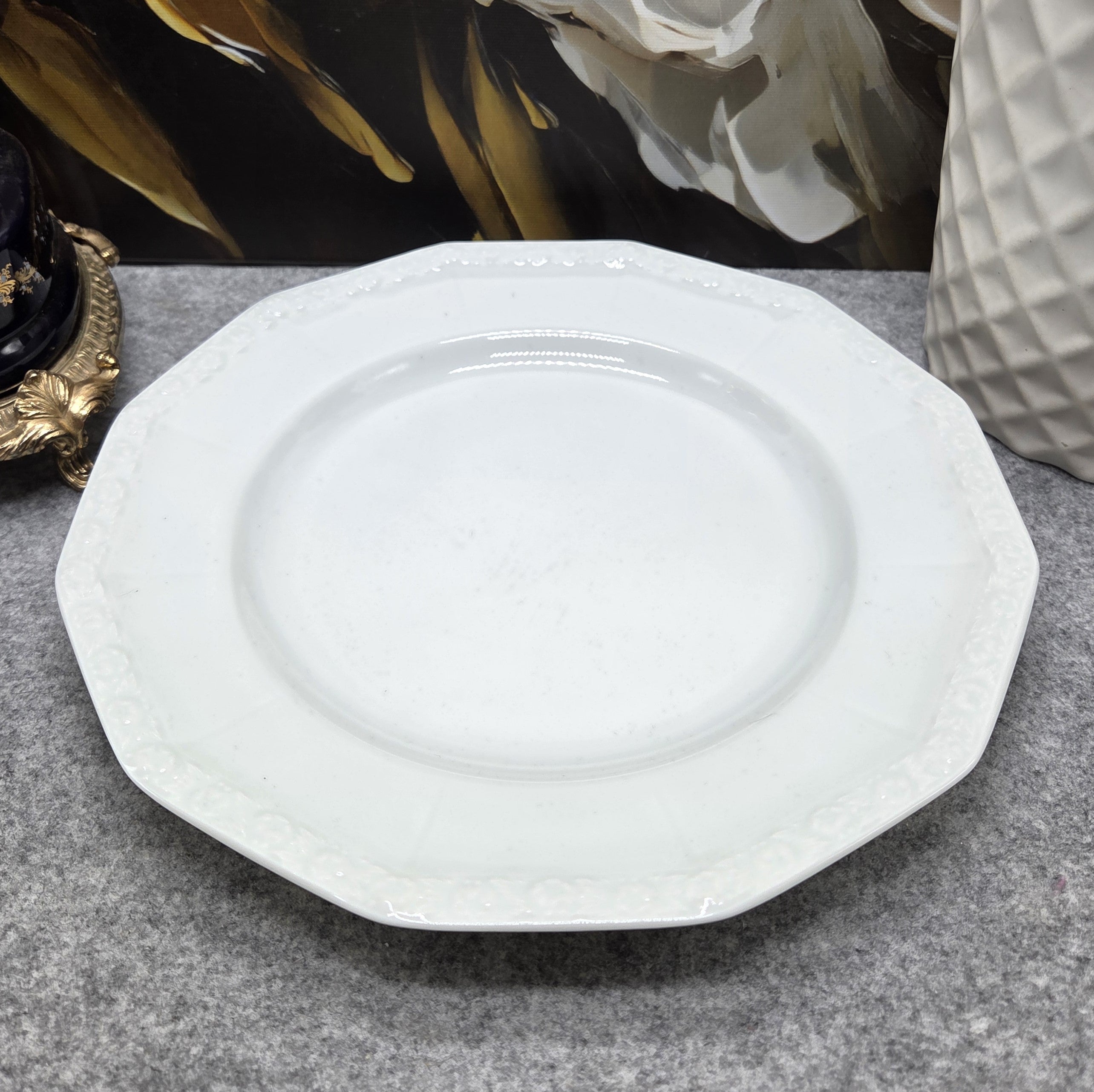 Der elegante, hochwertige Porzellanteller von Rosenthal Classic Germany hat ein minimalistisches und doch raffiniertes Design. Die Teller haben eine achteckige Form und sind an den Rändern mit einem zarten, geprägten Blumenmuster verziert, das sich von dem weißen Porzellanhintergrund abhebt.