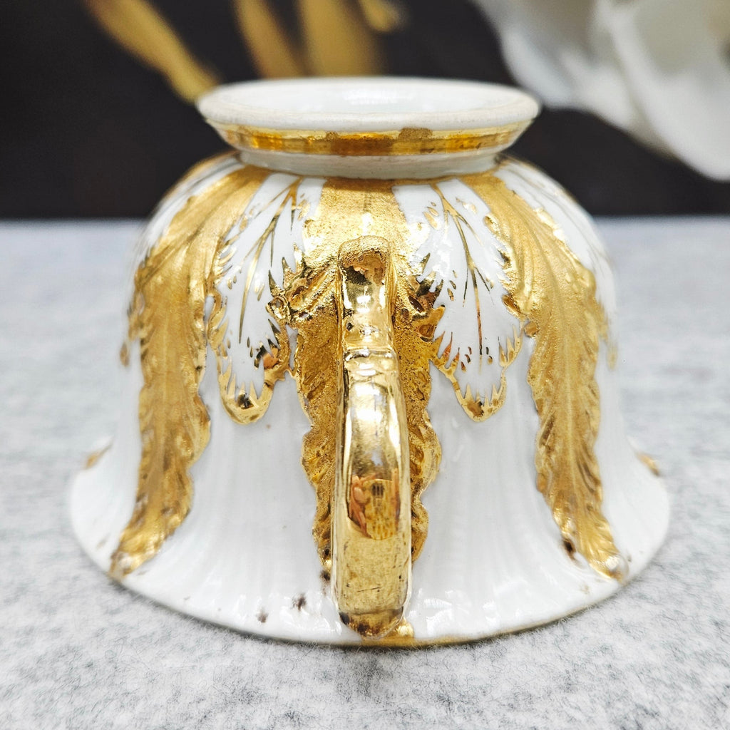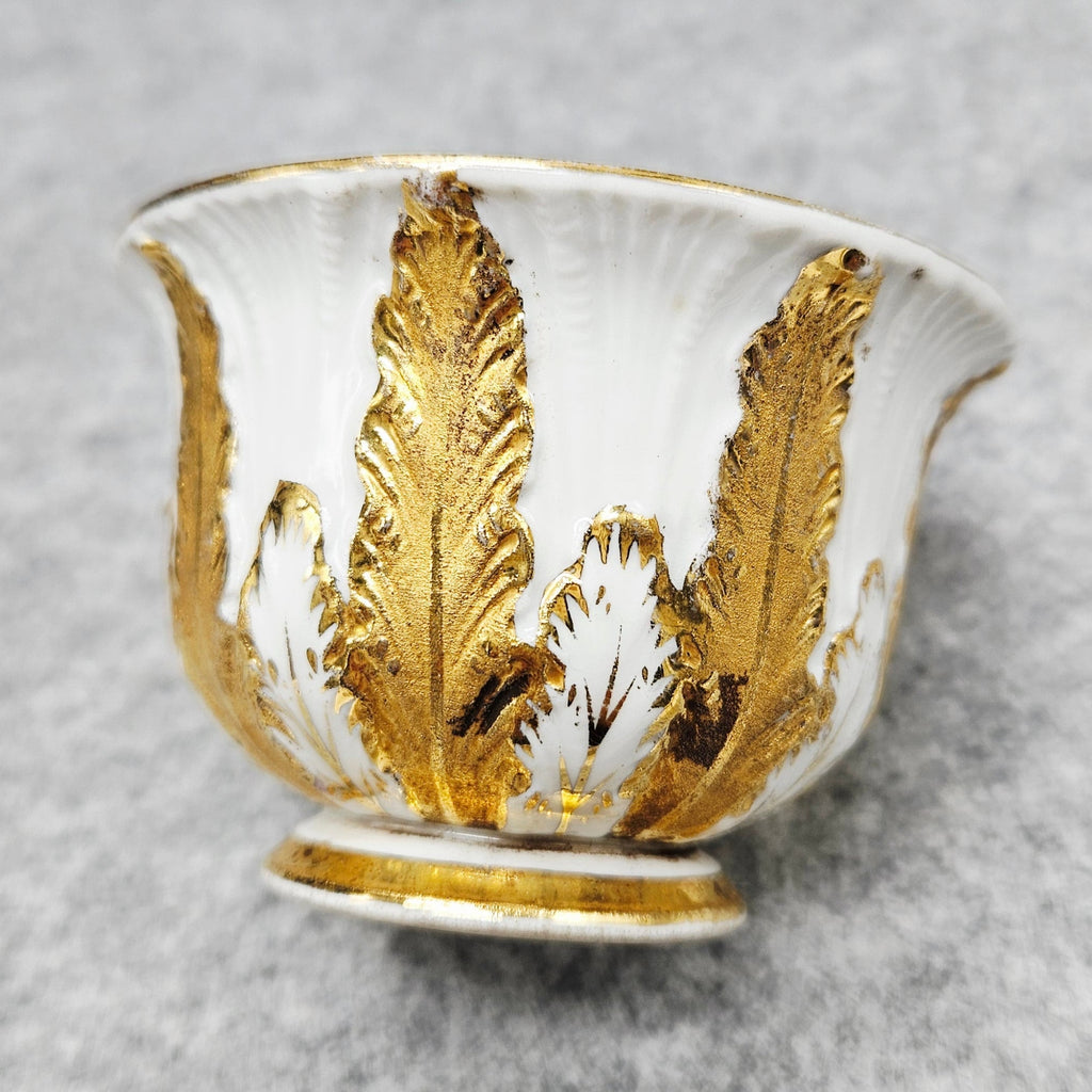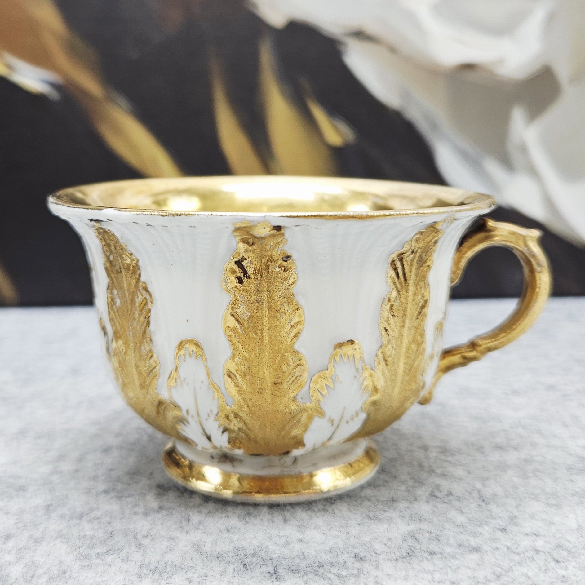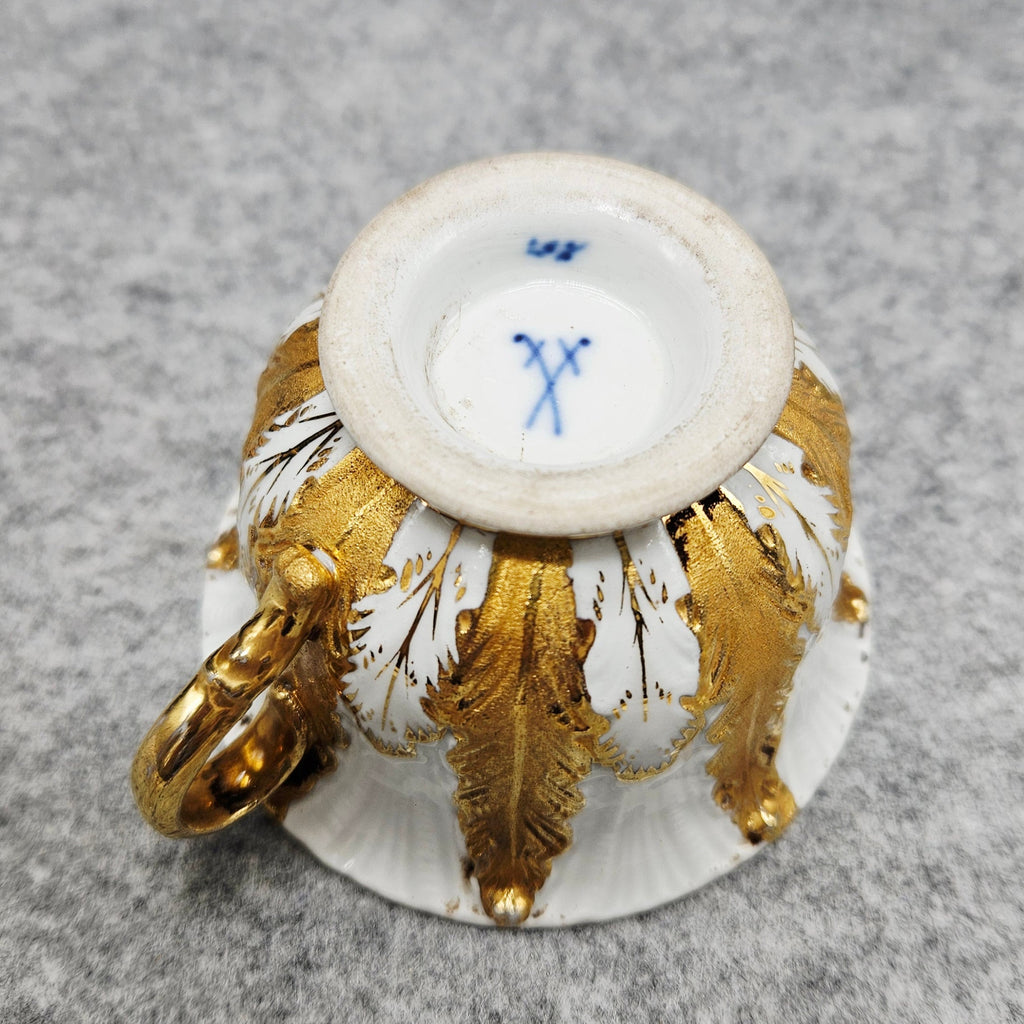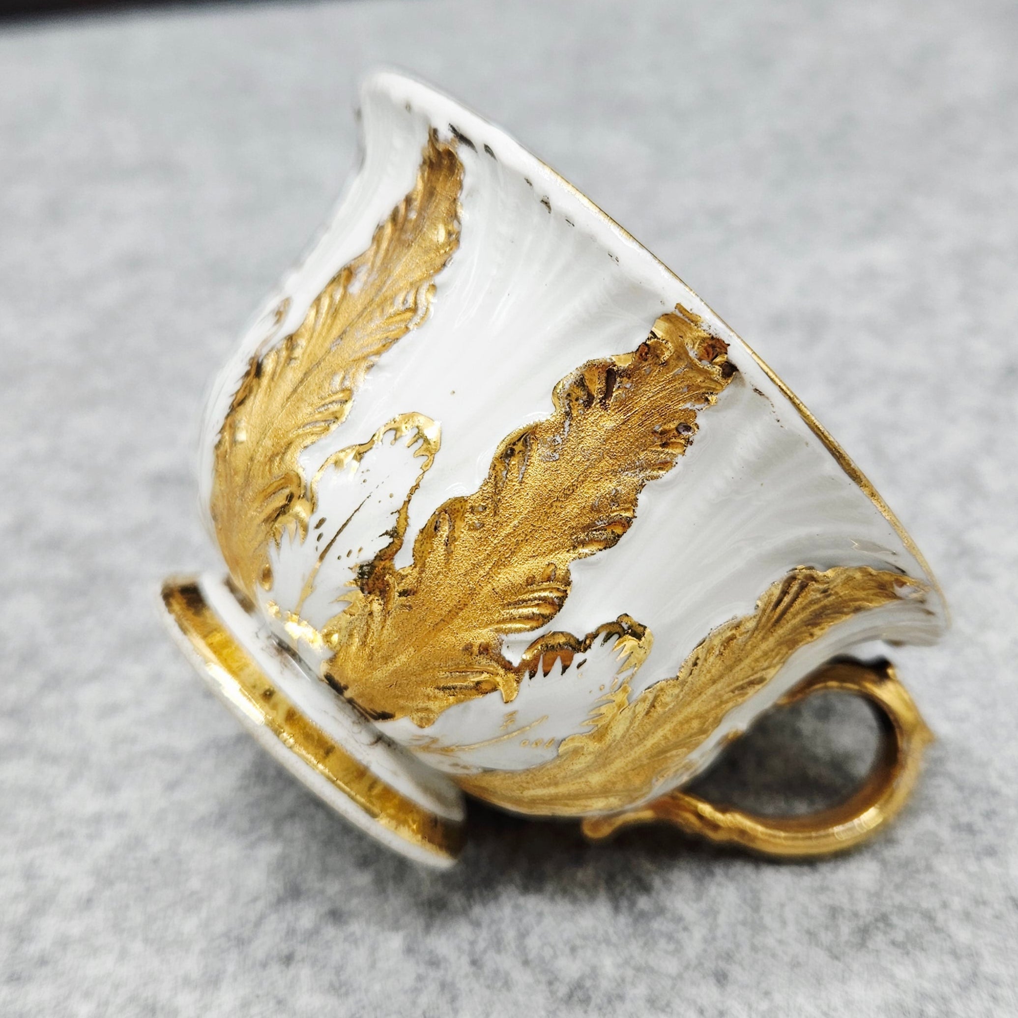 Ein luxuriöser deutscher Porzellanbecher, hergestellt in der berühmten Meissener Manufaktur. Verziert mit exquisiten Reliefs und handgemalten, vergoldeten Akanthusblattmotiven, strahlt dieser Becher barocke Eleganz und Handwerkskunst aus. Die sanft gewellte Silhouette, die fein profilierte Oberfläche und das ausdrucksstarke Golddekor spiegeln den außergewöhnlichen Qualitätsstandard der Meissener Ware wider.