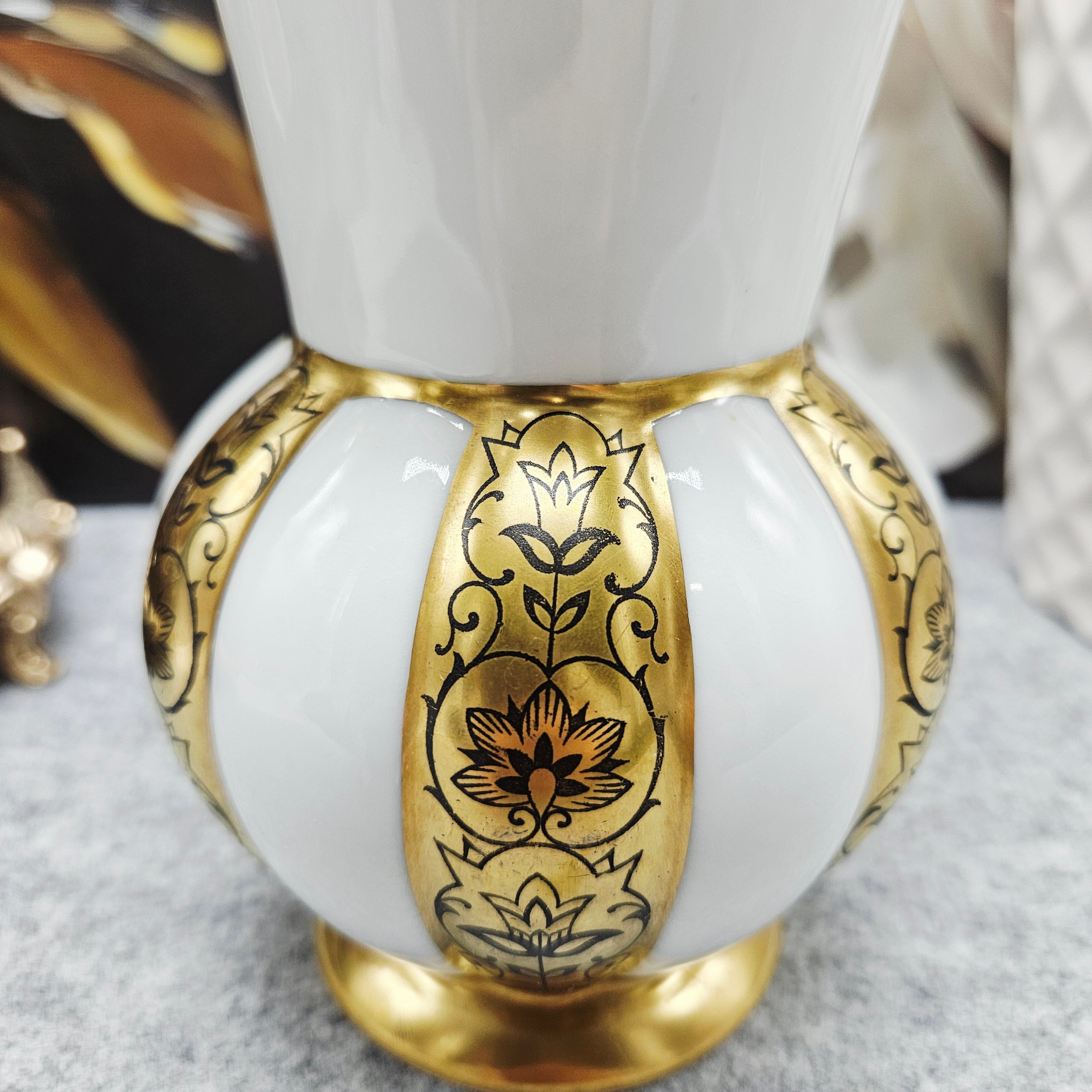 "PMR Bavaria Jaeger & co Porzellanvase mit Goldbändern und schwarzen Blumen verziert (16cm)