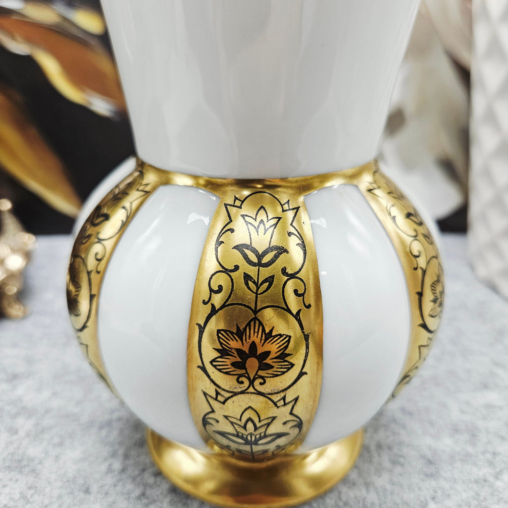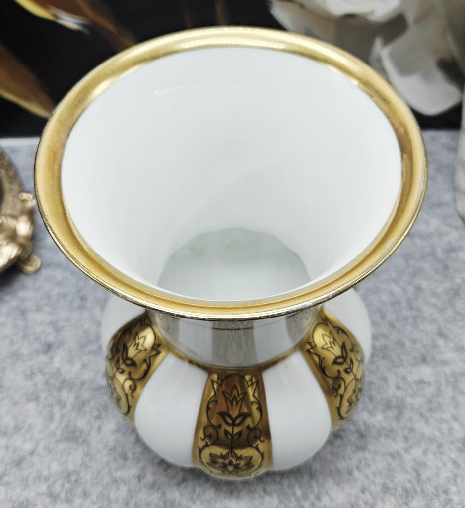 Diese elegante Porzellanvase von PMR Bavaria Jaeger & Co ist ein Beispiel für das klassische bayerische Porzellan, das sich durch seinen Luxus und sein meisterhaftes Dekor auszeichnet. Das weiße, glänzende Porzellan ist mit goldfarbenen, geprägten Bändern kombiniert, die mit zarten schwarzen Blumenmotiven verziert sind. Die Vase zeichnet sich durch ihre leicht ausgestellte Form aus, und die goldene Verzierung von Rand und Boden verleiht ihr einen Hauch von Raffinesse. Es handelt sich um ein dekoratives und repräsentatives Gefäß, das sich perfekt in ein klassisches Interieur oder eine Sammlung einfügt.