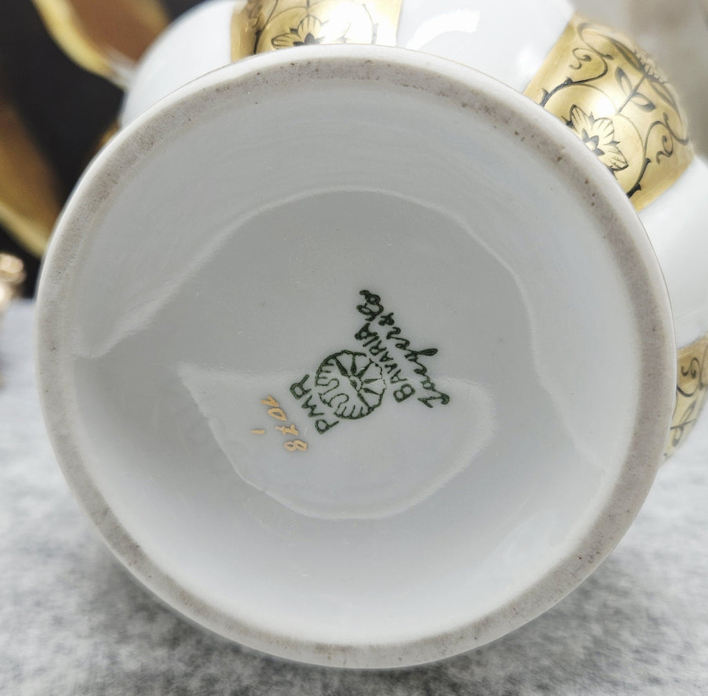 Diese elegante Porzellanvase von PMR Bavaria Jaeger & Co ist ein Beispiel für das klassische bayerische Porzellan, das sich durch seinen Luxus und sein meisterhaftes Dekor auszeichnet. Das weiße, glänzende Porzellan ist mit goldfarbenen, geprägten Bändern kombiniert, die mit zarten schwarzen Blumenmotiven verziert sind. Die Vase zeichnet sich durch ihre leicht ausgestellte Form aus, und die goldene Verzierung von Rand und Boden verleiht ihr einen Hauch von Raffinesse. Es handelt sich um ein dekoratives und repräsentatives Gefäß, das sich perfekt in ein klassisches Interieur oder eine Sammlung einfügt.