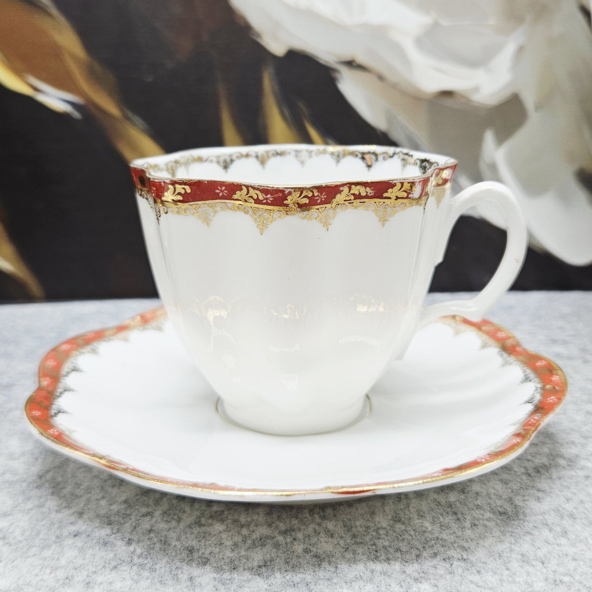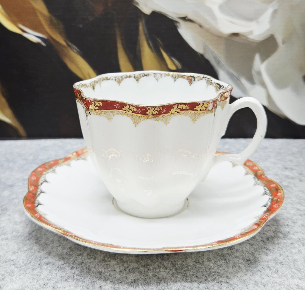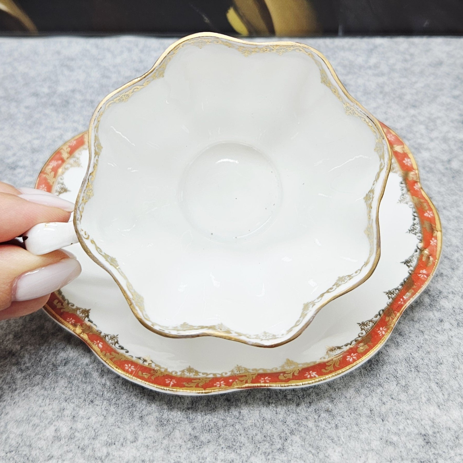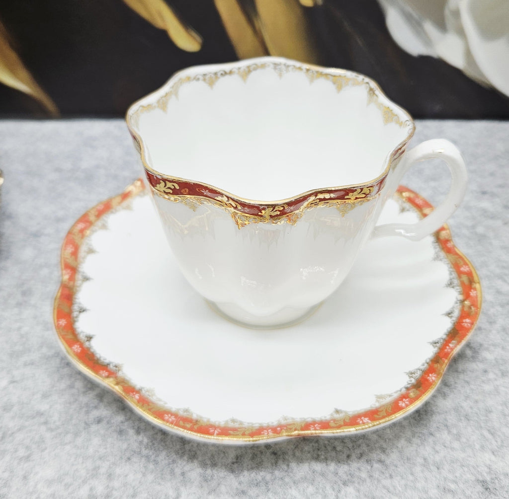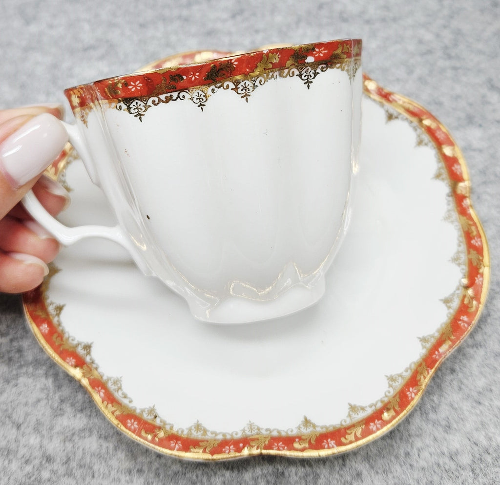 Elegante Kaffeetasse mit Untertasse aus antikem Porzellan, verziert mit einem satten orangefarbenen Band und zarten goldenen Ornamenten. Die gewellten Ränder sind mit Gold akzentuiert und verleihen ihr eine unverwechselbare Raffinesse. Das Set zeichnet sich durch seine anmutige Form und seinen kunstvollen, klassischen Dekorationsstil aus.