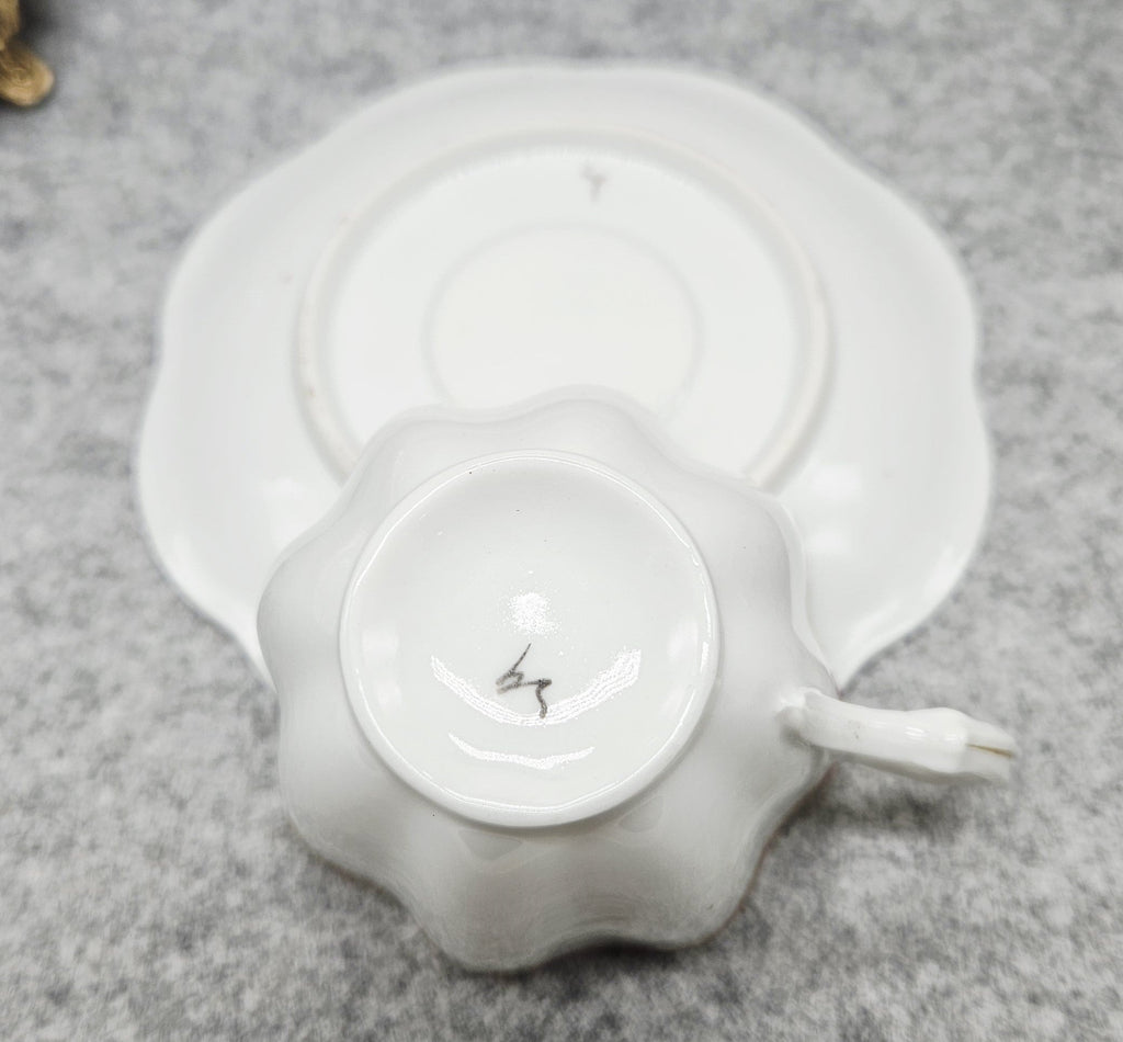 Porzellan-Kaffeebecher mit Untertasse, gewelltem Rand und goldenen Ornamenten (130ml.) ist auf Lager und wird versandt, sobald es wieder verfügbar ist