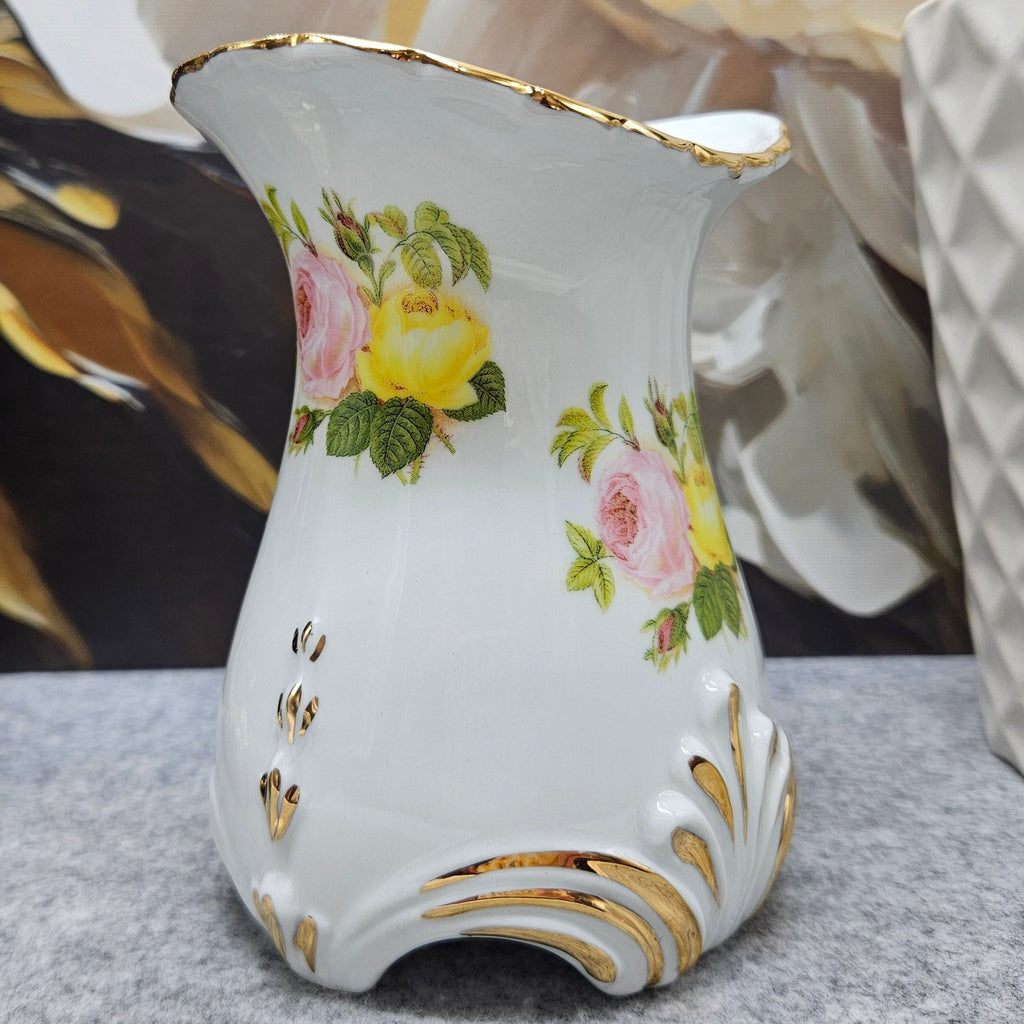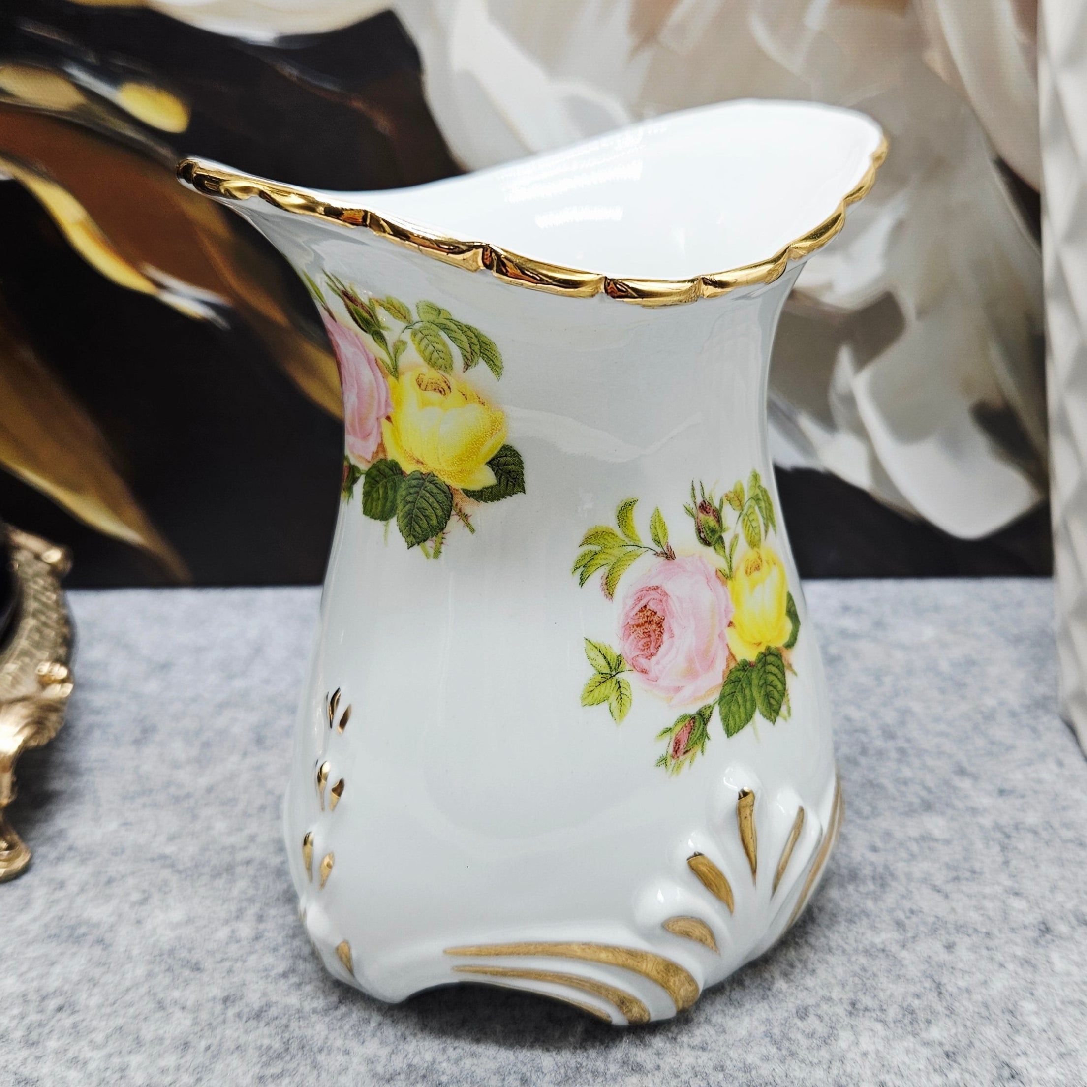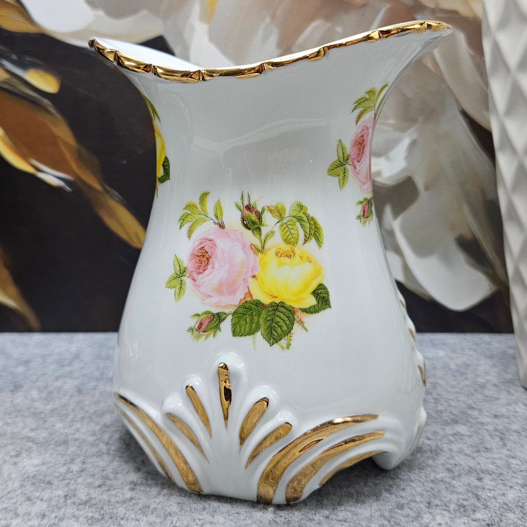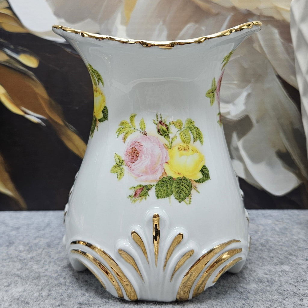 Französische Vase aus Limoges-Porzellan mit der Aufschrift "AR Pâte Limoges". Sie hat eine elegante, gewellte Form und ist mit einem zarten Blumenmotiv aus zartrosa und gelben Rosen verziert, die von grünen Blättern umgeben sind. Der obere Rand und die geprägten Elemente sind mit luxuriösen goldenen Akzenten verziert und verleihen der Vase eine einzigartige Raffinesse und Eleganz.