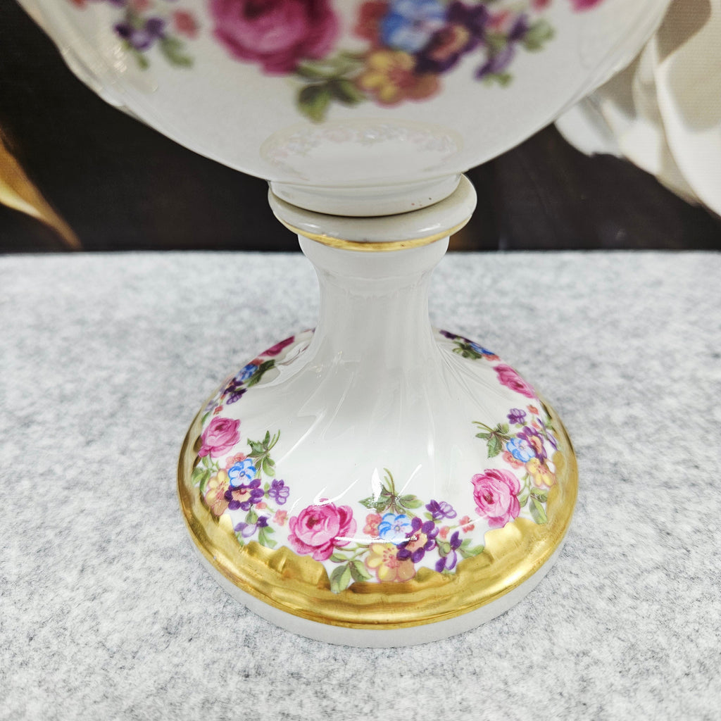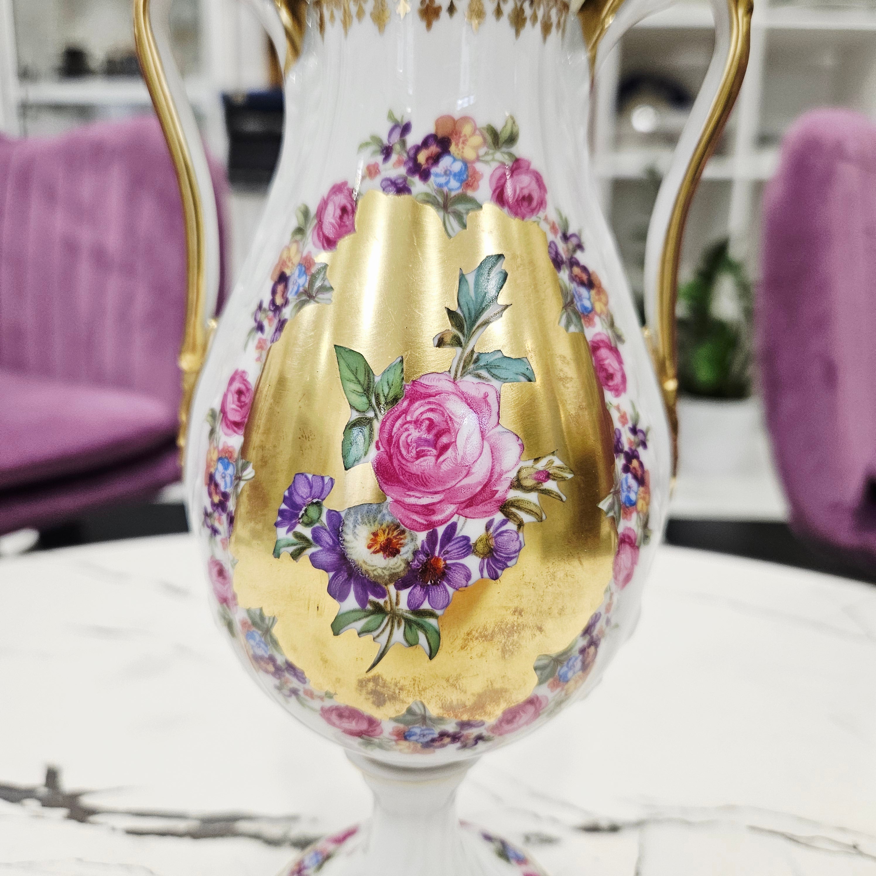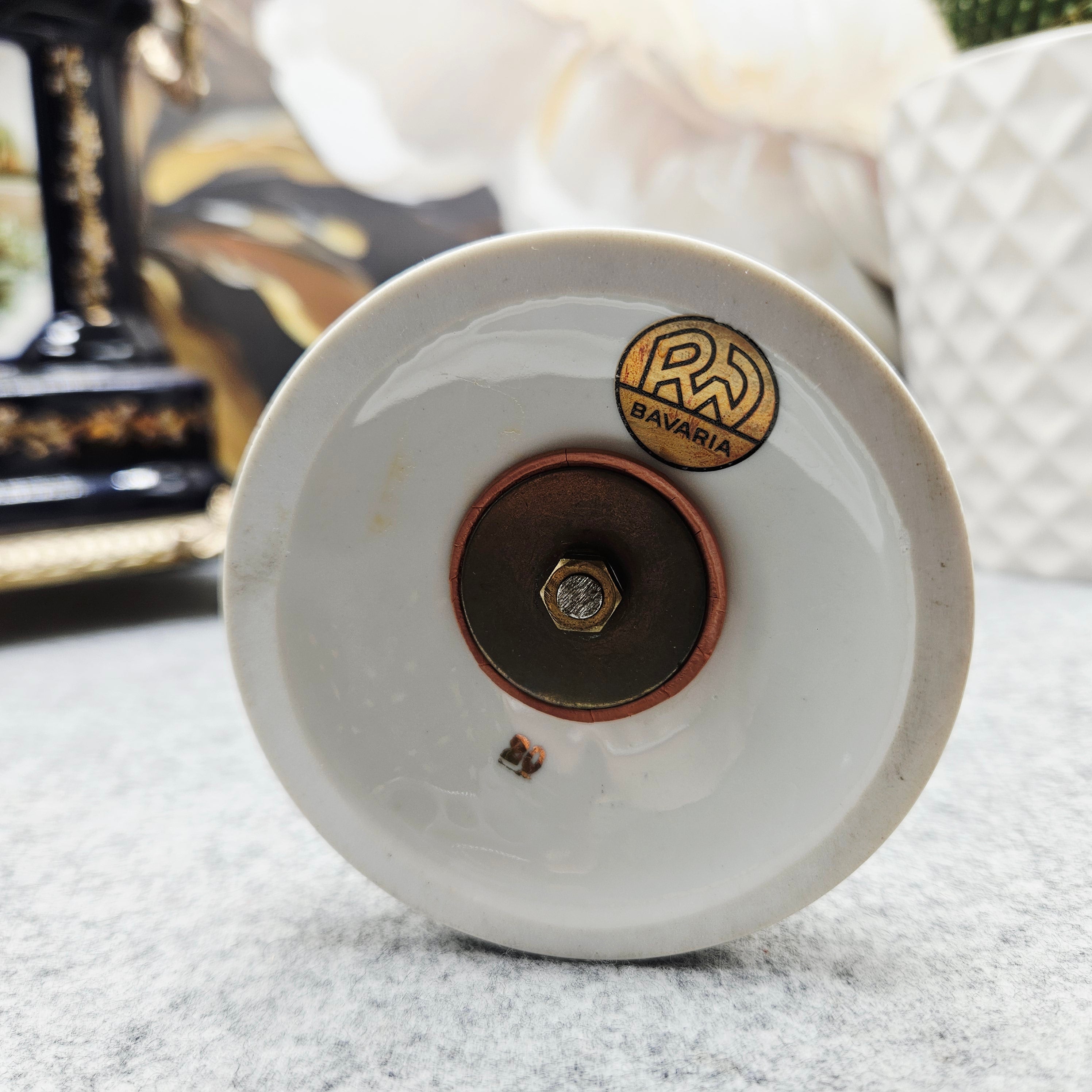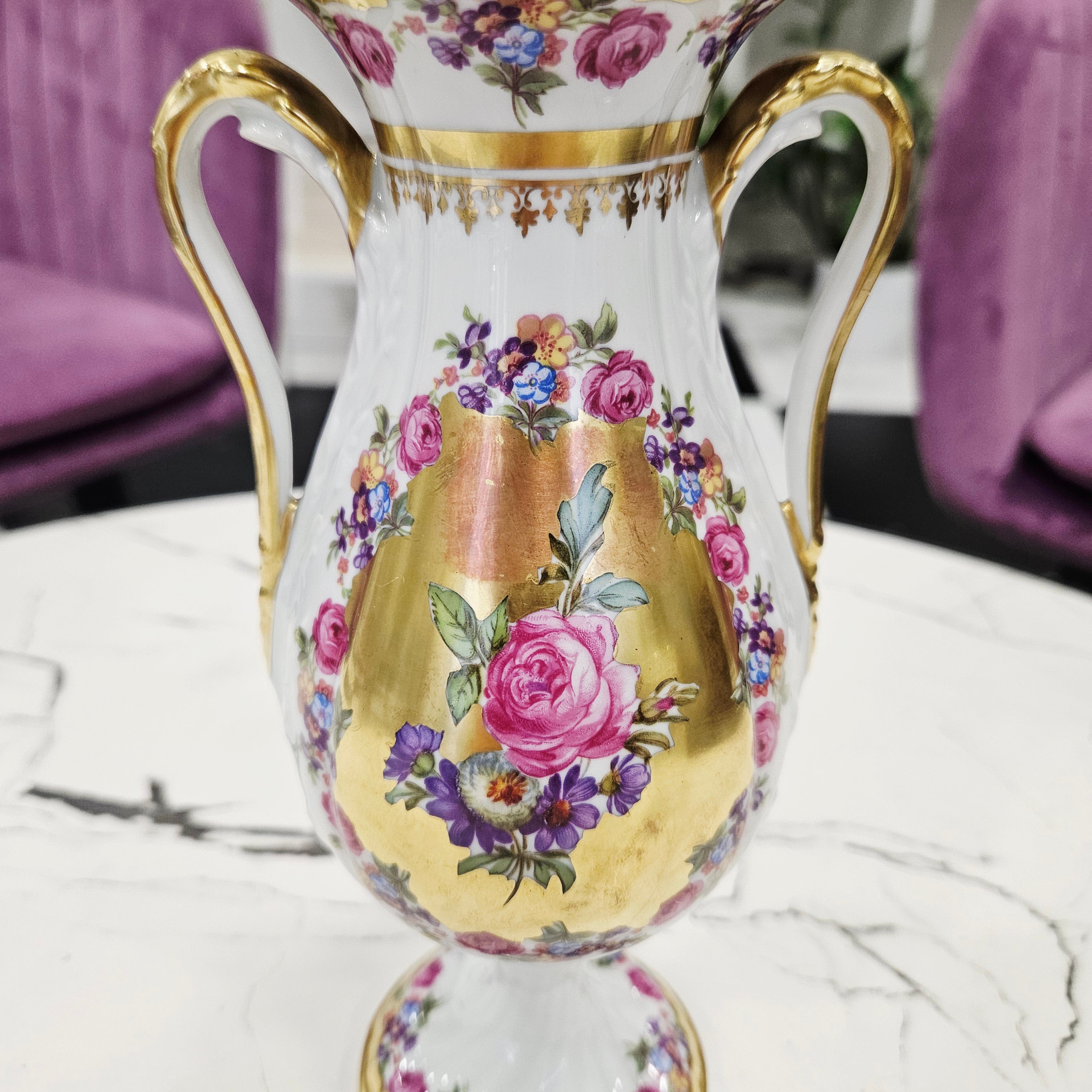 Die dekorative Rudolf Wachter (RW) Bavaria Porzellanvase mit Deckel ist ein elegantes und markantes Beispiel für klassisches bayerisches Porzellan. Die Vase ist mit Blumenbouquets in prächtigen, mattgoldenen Feldern verziert, die durch zarte Rosen, violette Blüten und eine Zierbordüre ergänzt werden. Das zart geprägte weiße Porzellan verleiht der Form eine lebendige und luxuriöse Ausstrahlung.
