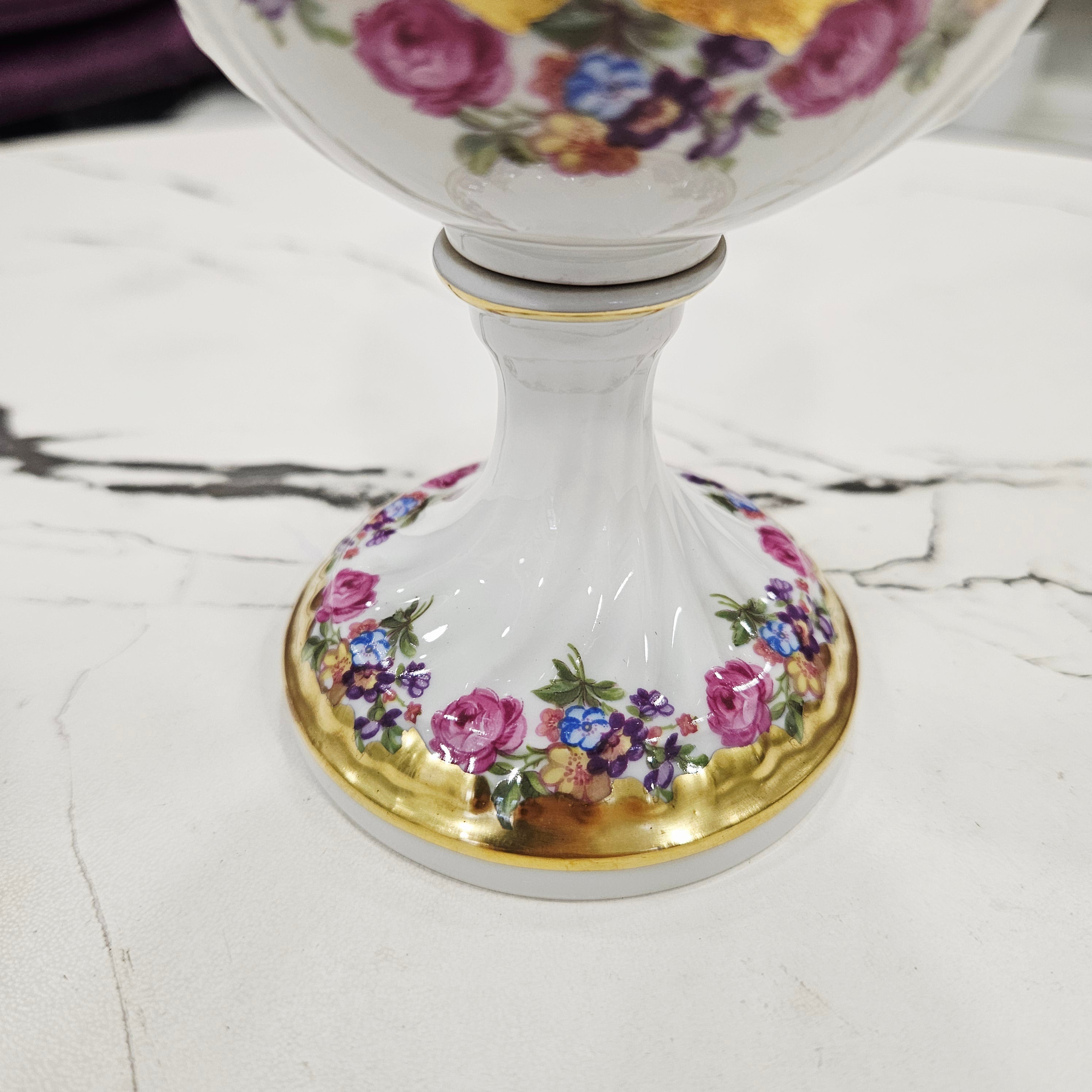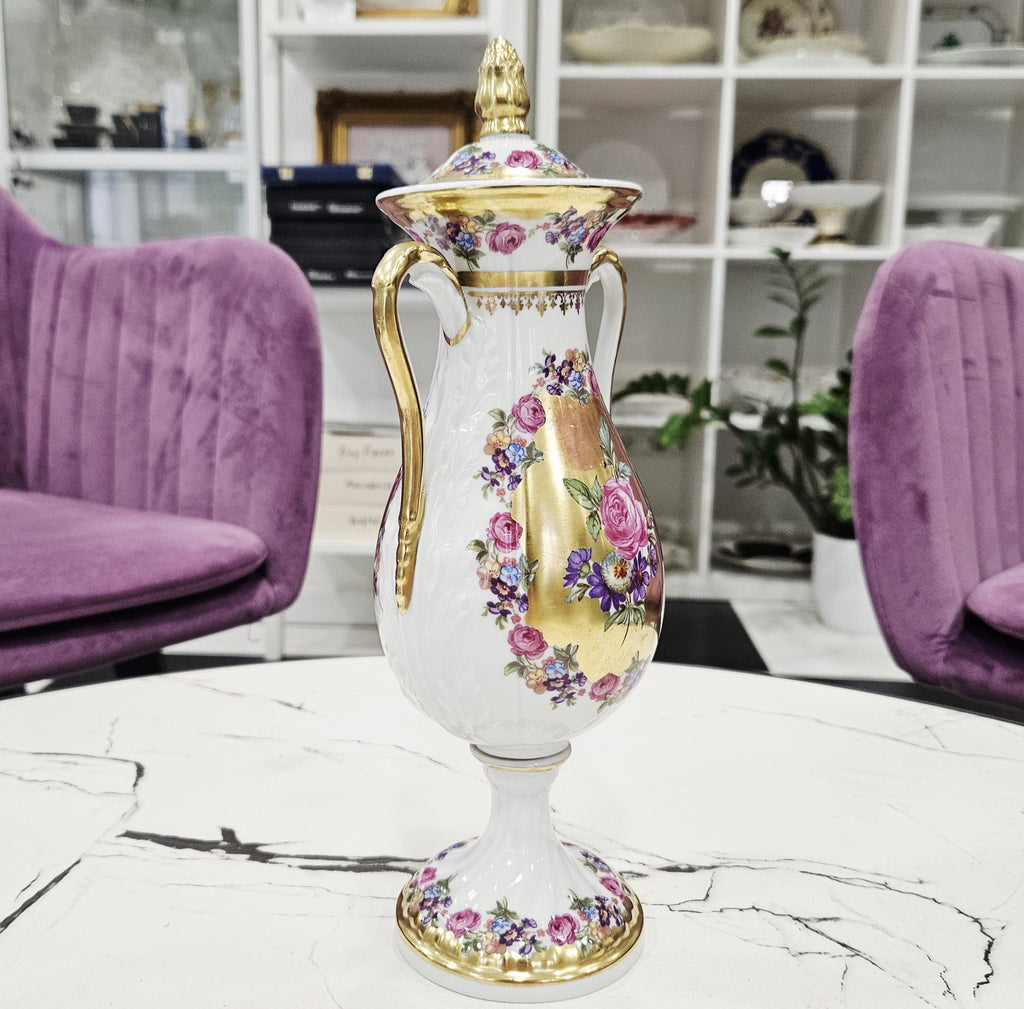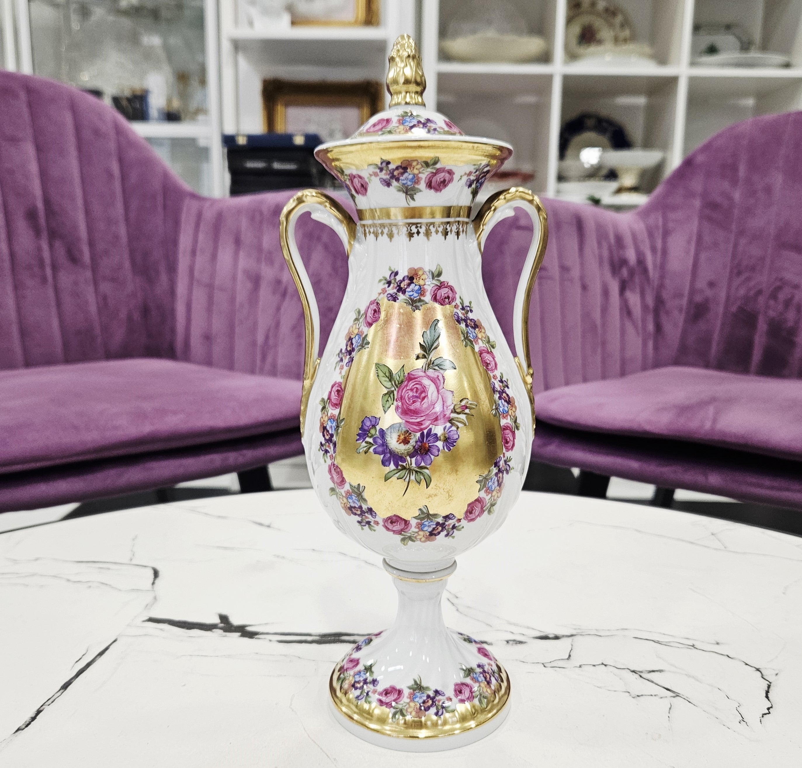 Vasen mit Deckel wurden nicht nur aus Gründen der Schönheit geschaffen, sondern auch für einen klaren Zweck. In diesen Vasen wurden oft aromatische Kräuter oder Potpourri (eine duftende Mischung aus getrockneten Blumen, Kräutern, Schalen und Gewürzen) aufbewahrt, damit das Haus gut duftete. Dazu gehörten in der Regel Rosenblüten, Lavendel, Zitrusschalen, Anis, Zimt, Nelken und ähnliche aromatische Zutaten), mit einem Deckel, um den Duft länger zu erhalten und den Inhalt vor Staub zu schützen. Sie dienten auch als elegante Behältnisse für kleine Wertsachen oder Süßigkeiten, mancherorts sogar für rituelle Öle oder Weihrauch. Darüber hinaus verlieh der Deckel der Vase eine vollständige, symmetrische und luxuriöse Silhouette, was sie zu einem wichtigen dekorativen Element in der bayerischen Manufaktur des 20. Jahrhunderts machte, auch wenn die Vase nur als Innendekoration gedacht war.