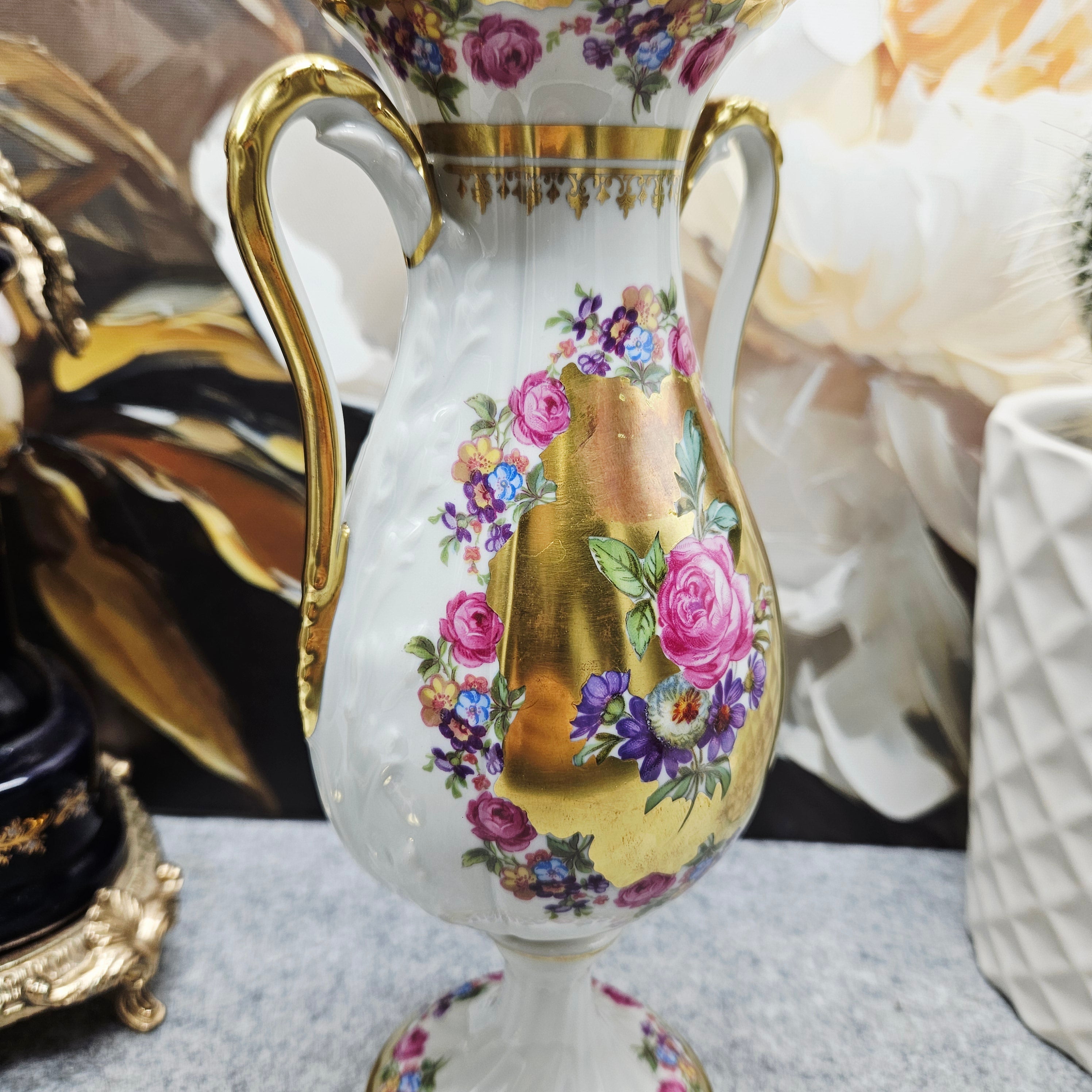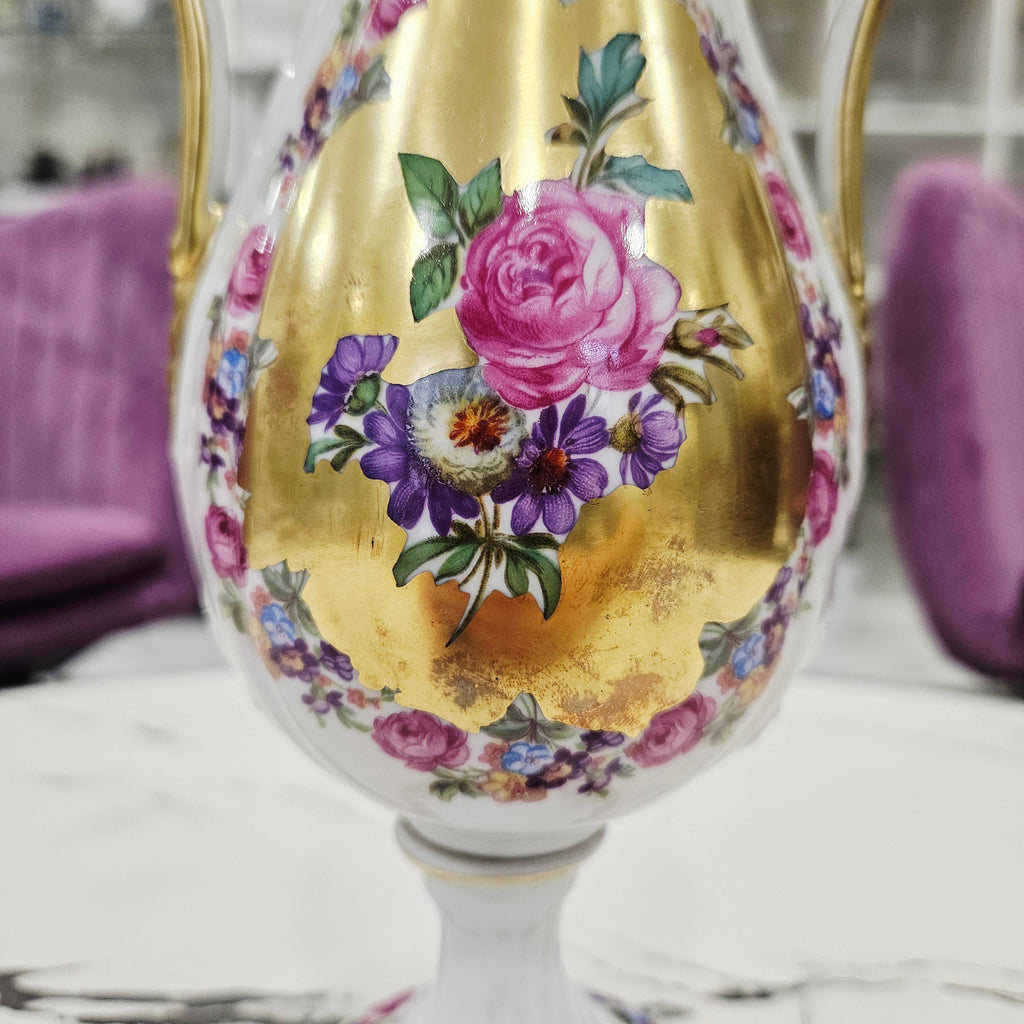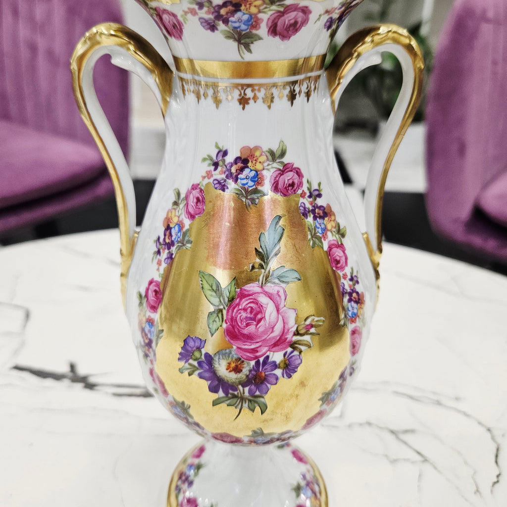 Vasen mit Deckel wurden nicht nur aus Gründen der Schönheit geschaffen, sondern auch für einen klaren Zweck. In diesen Vasen wurden oft aromatische Kräuter oder Potpourri (eine duftende Mischung aus getrockneten Blumen, Kräutern, Schalen und Gewürzen) aufbewahrt, damit das Haus gut duftete. Dazu gehörten in der Regel Rosenblüten, Lavendel, Zitrusschalen, Anis, Zimt, Nelken und ähnliche aromatische Zutaten), mit einem Deckel, um den Duft länger zu erhalten und den Inhalt vor Staub zu schützen. Sie dienten auch als elegante Behältnisse für kleine Wertsachen oder Süßigkeiten, mancherorts sogar für rituelle Öle oder Weihrauch. Darüber hinaus verlieh der Deckel der Vase eine vollständige, symmetrische und luxuriöse Silhouette, was sie zu einem wichtigen dekorativen Element in der bayerischen Manufaktur des 20. Jahrhunderts machte, auch wenn die Vase nur als Innendekoration gedacht war.