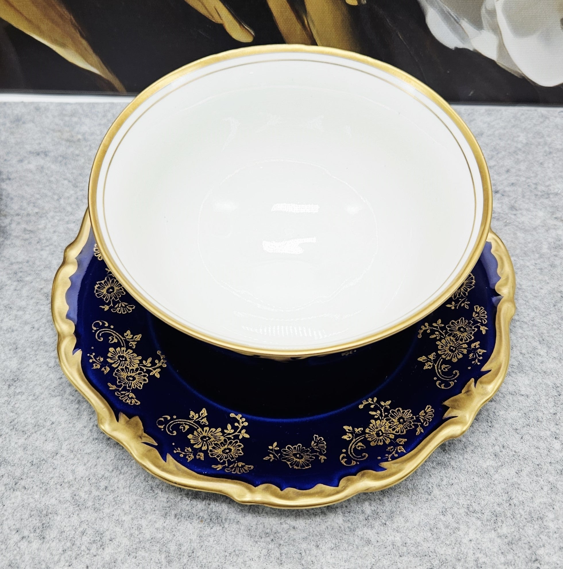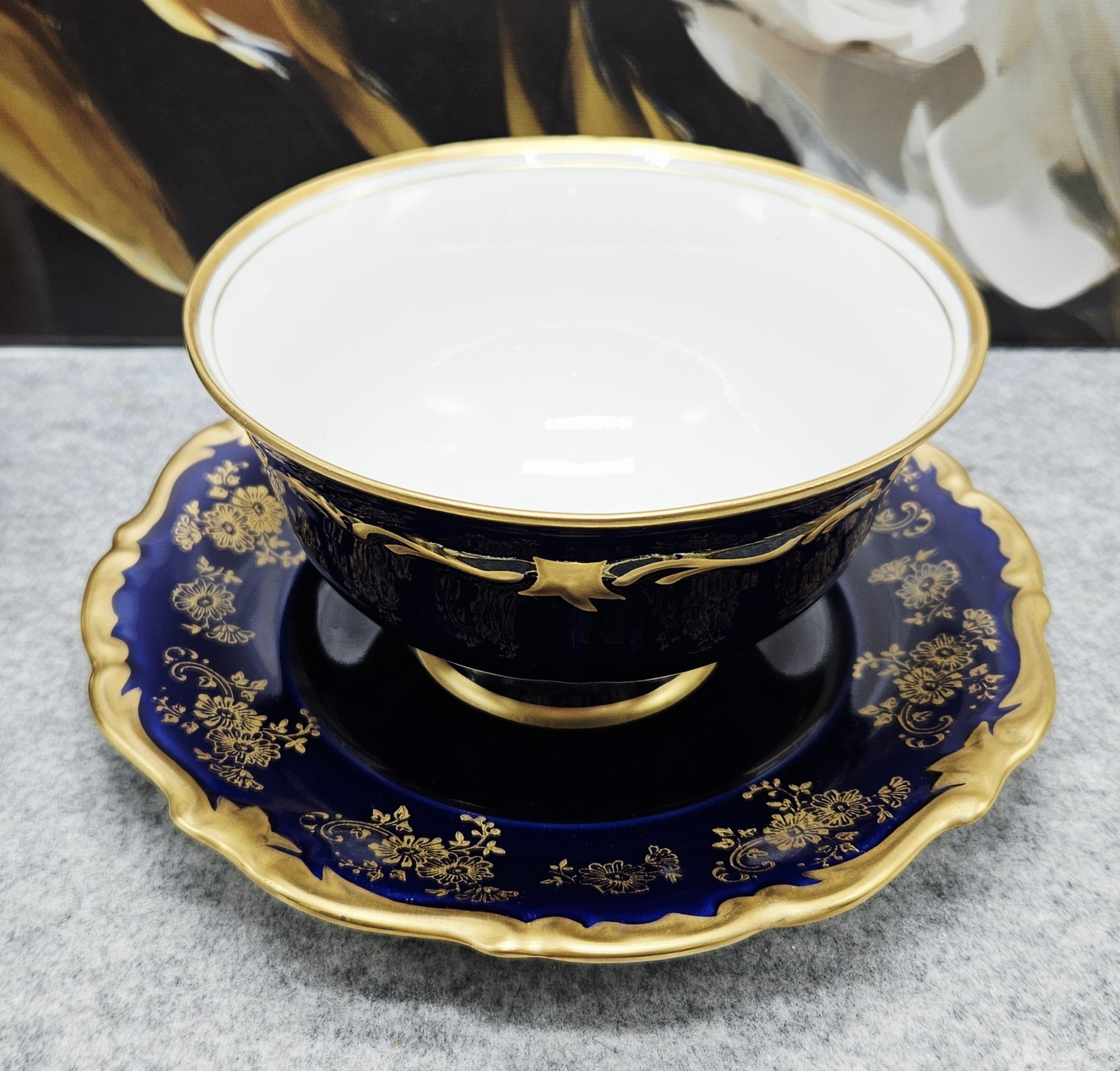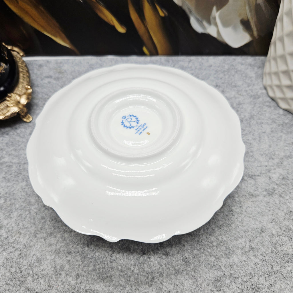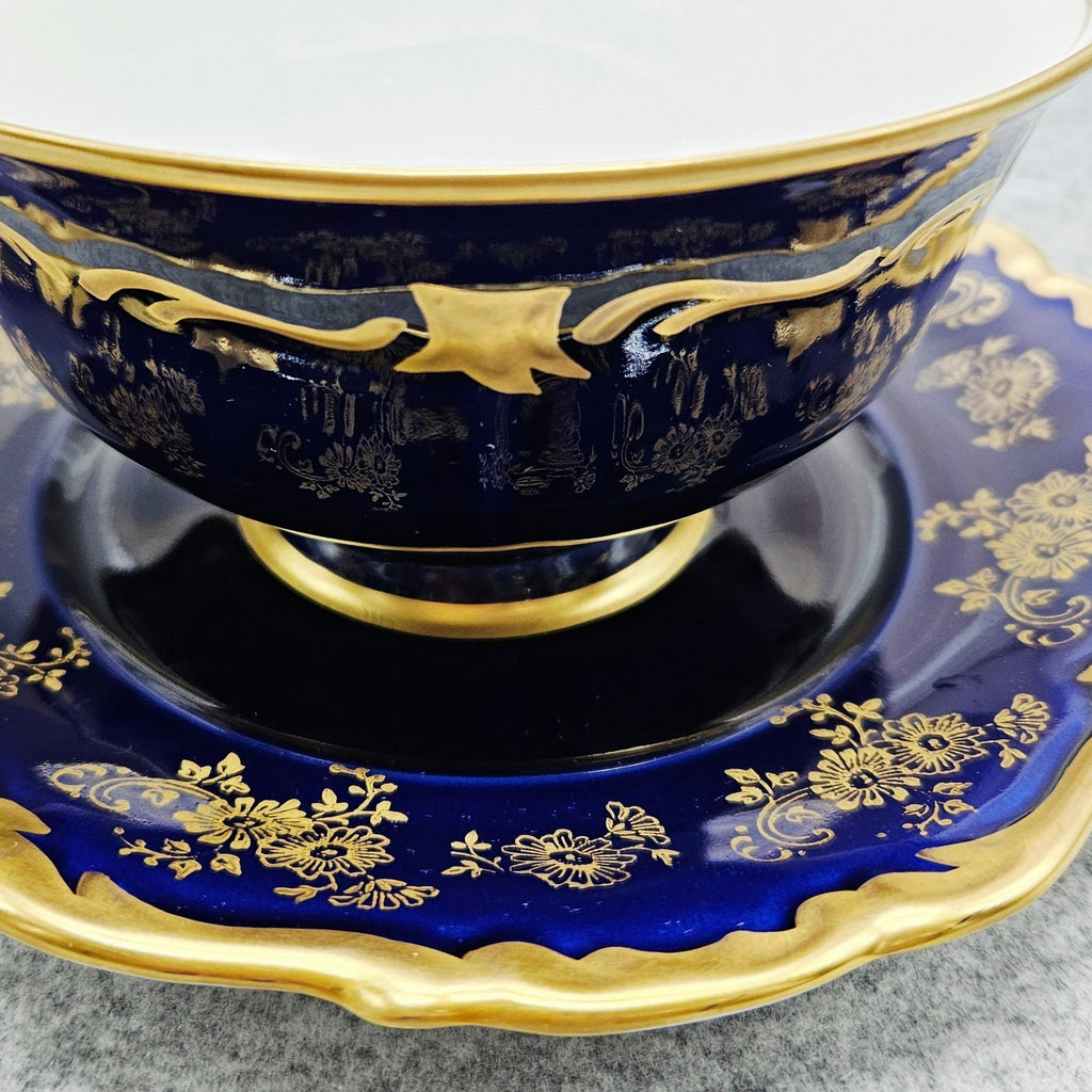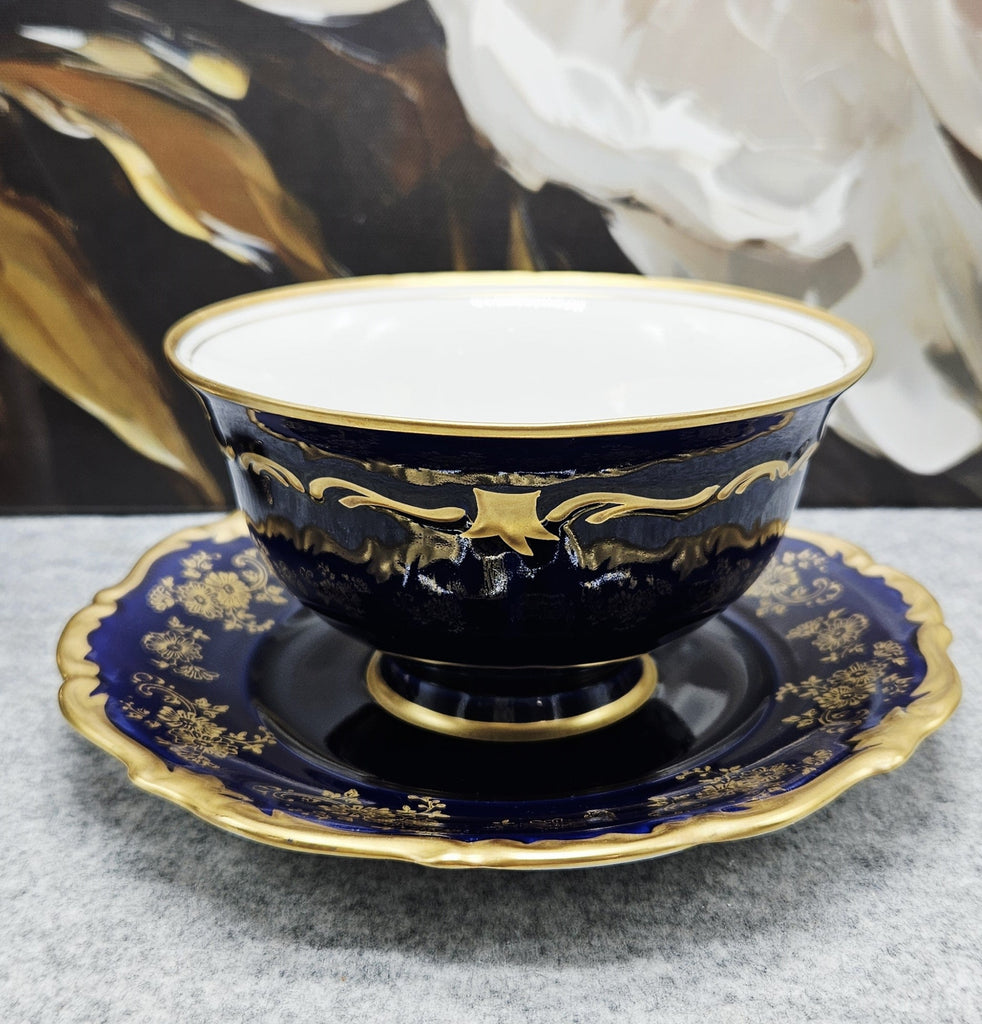 Die Schale ist mit einem satten dunkelblauen Band verziert, das mit luxuriösen 24-karätigen Goldornamenten und einem gewellten Rand verziert ist. Der klassische Reichenbach-Stil unterstreicht die raffinierte Form und das hochwertige Porzellan.
