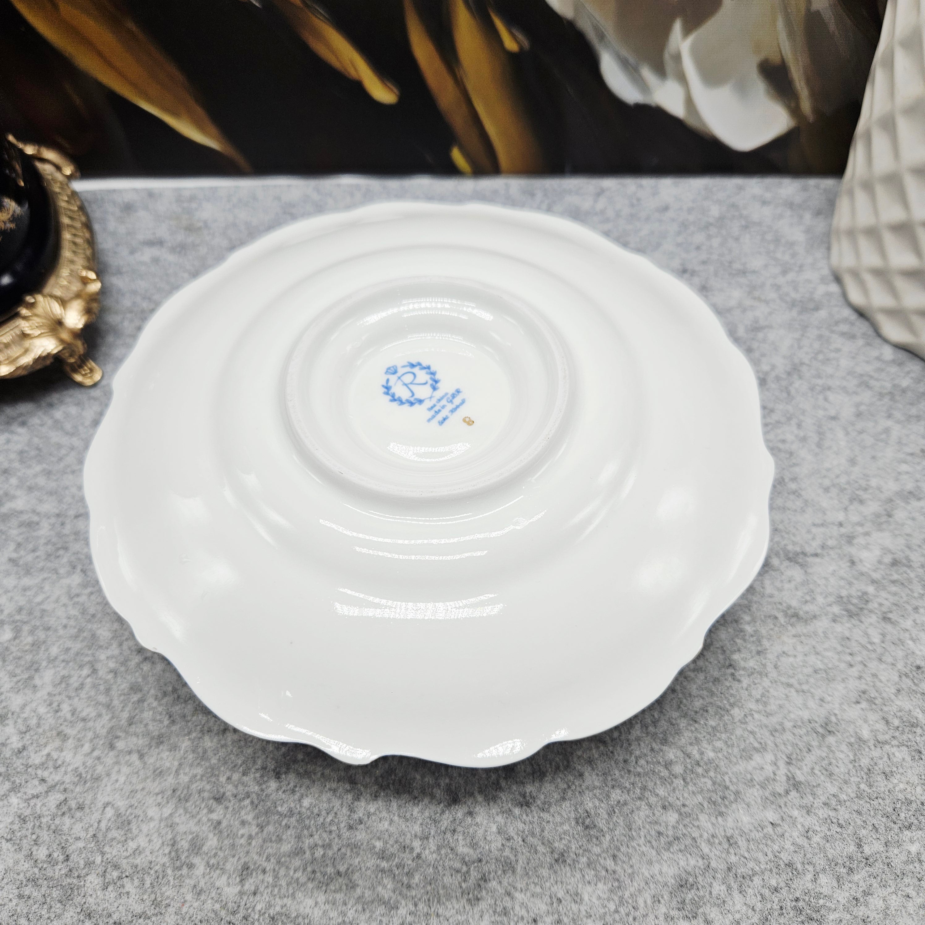 Elegante tiefe Schale aus Reichenbach-Porzellan mit aufgesetztem Teller aus der Fine China-Kollektion, gekennzeichnet mit "Made in German Democratic Republic".