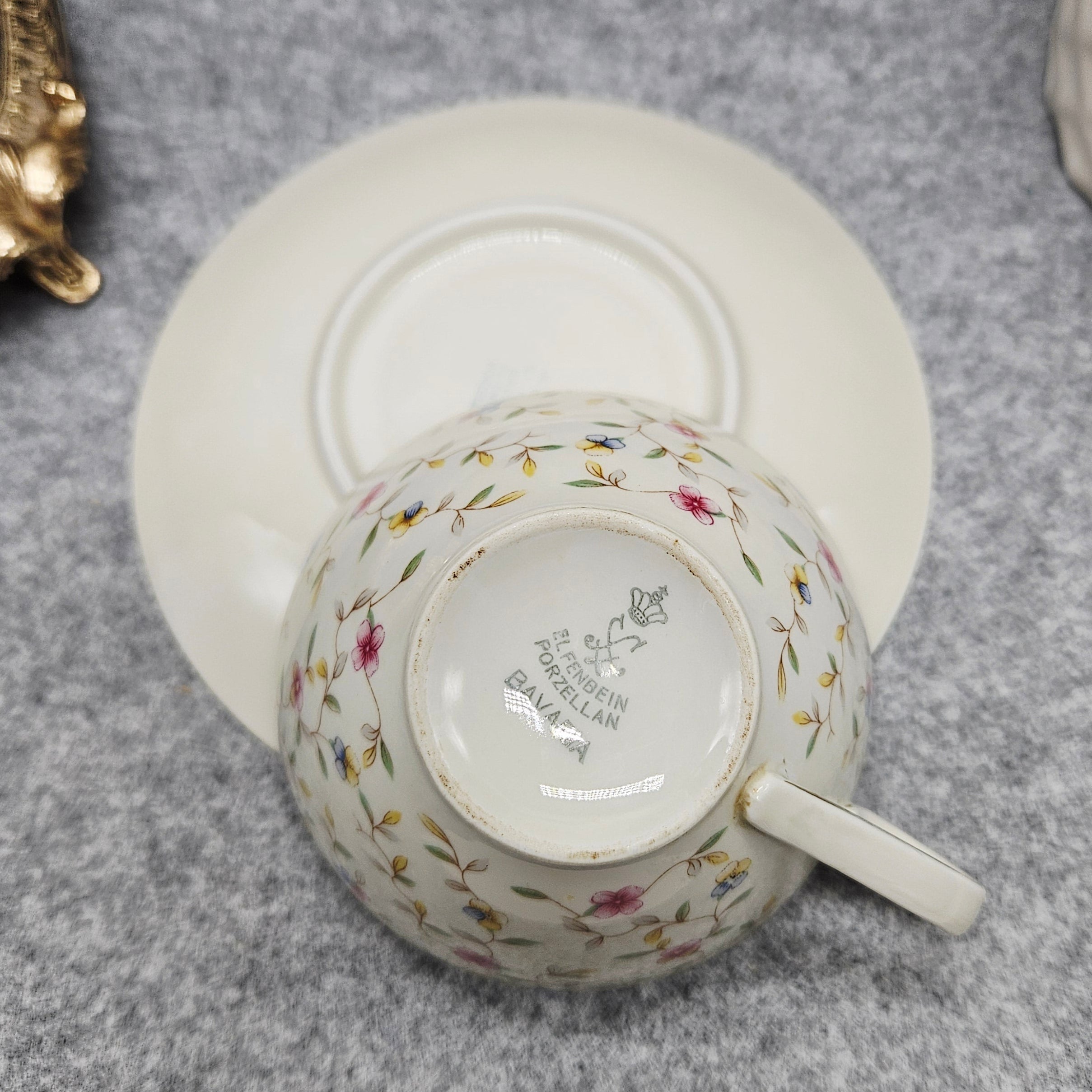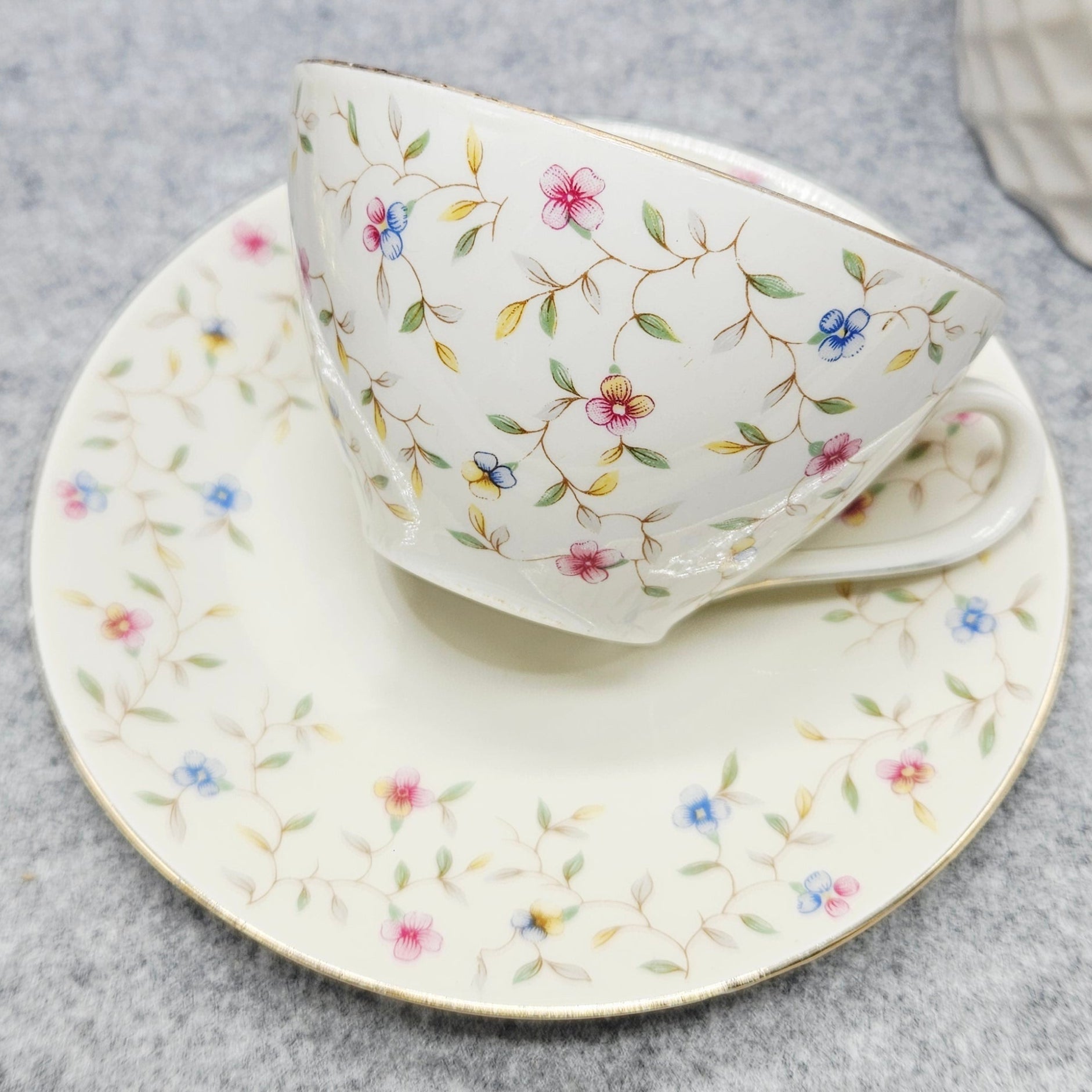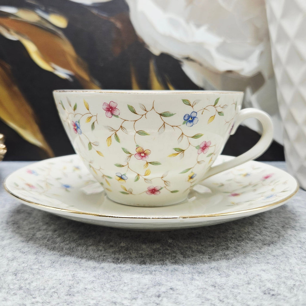 Die Form des Sets ist elegant geschwungen, die Seiten der Tasse verbreitern sich leicht nach oben und die Untertasse passt sowohl zu den Farben als auch zum dekorativen Motiv. Der goldverzierte Rand rundet das Gesamtbild ab und sorgt für eine sanfte Nostalgie.
