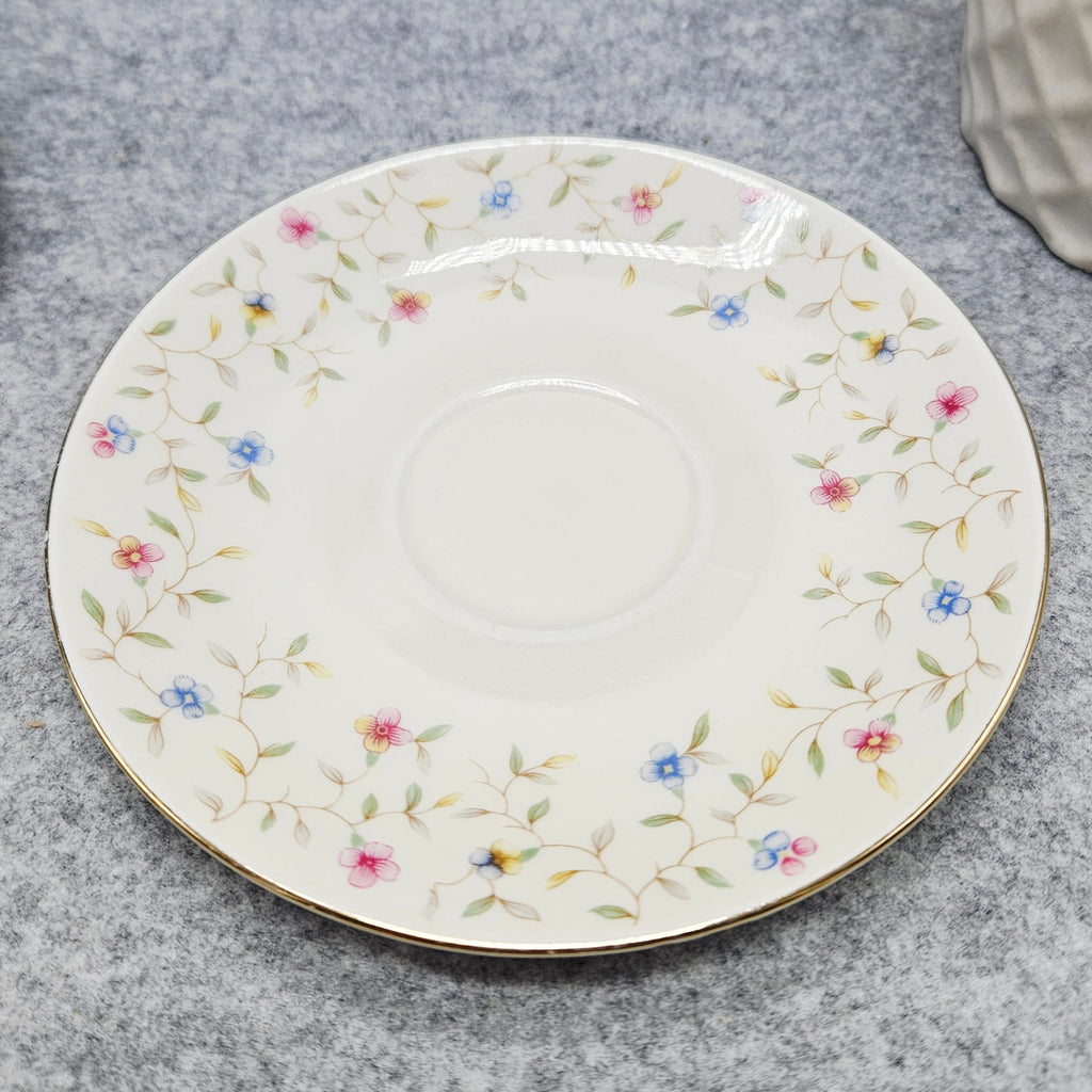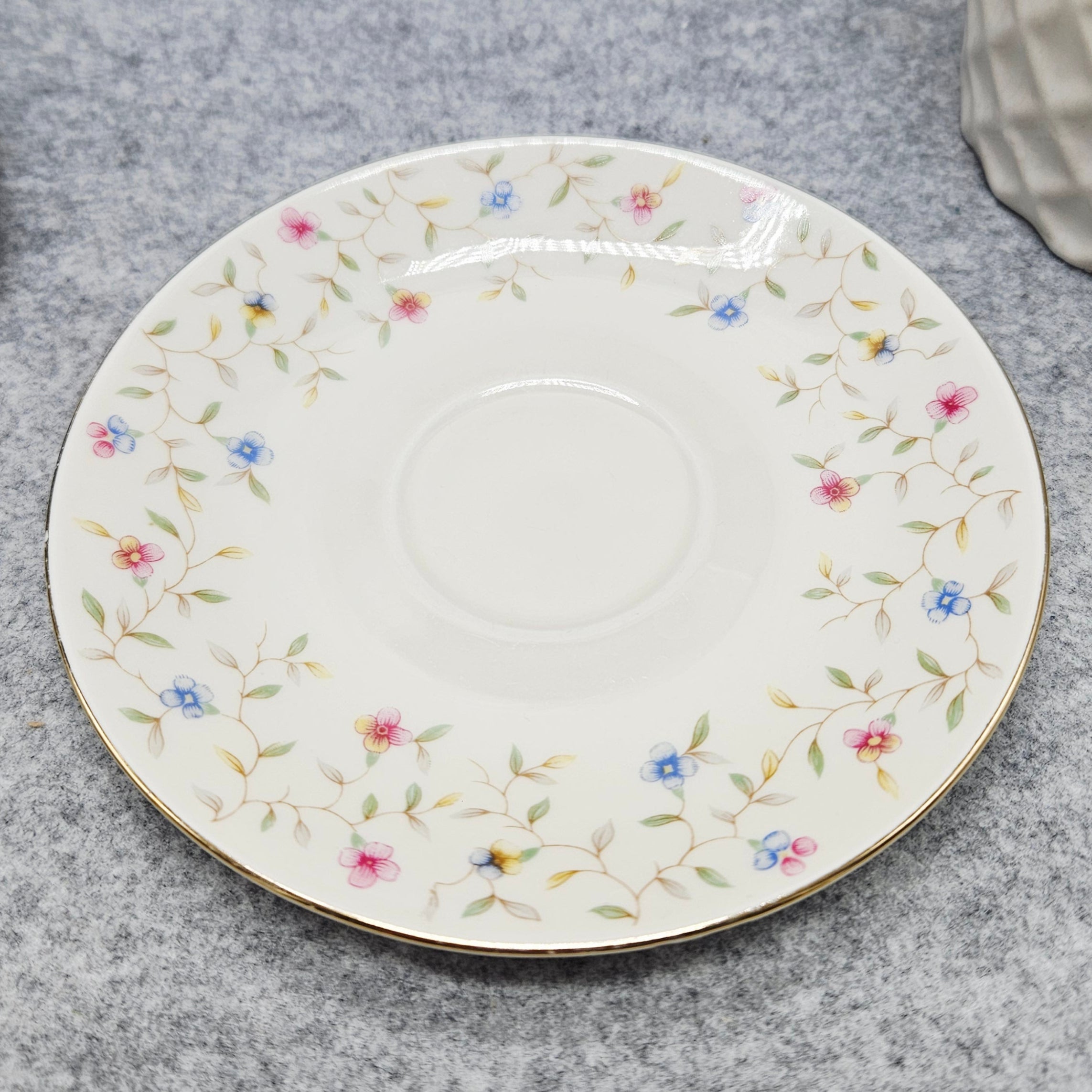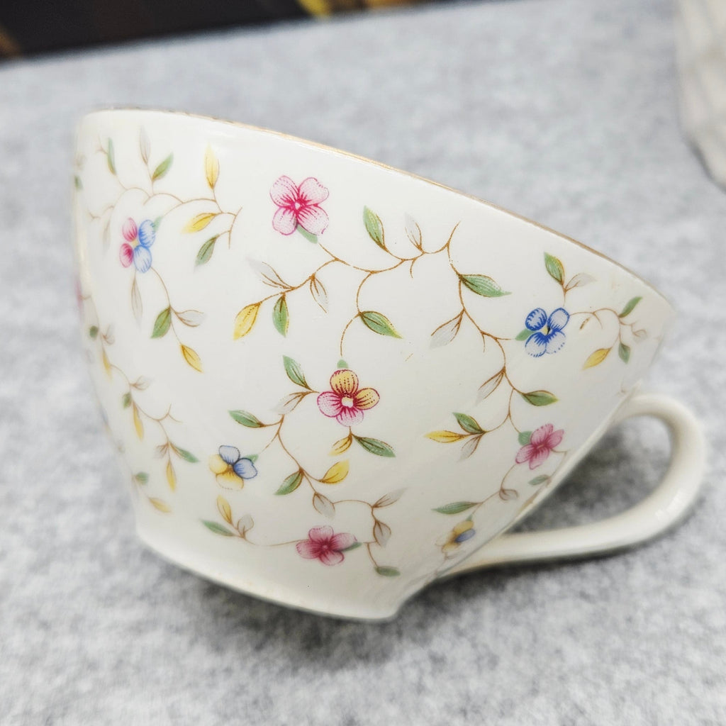 Die Form des Sets ist elegant geschwungen, die Seiten der Tasse verbreitern sich leicht nach oben und die Untertasse passt sowohl zu den Farben als auch zum dekorativen Motiv. Der goldverzierte Rand rundet das Gesamtbild ab und sorgt für eine sanfte Nostalgie.