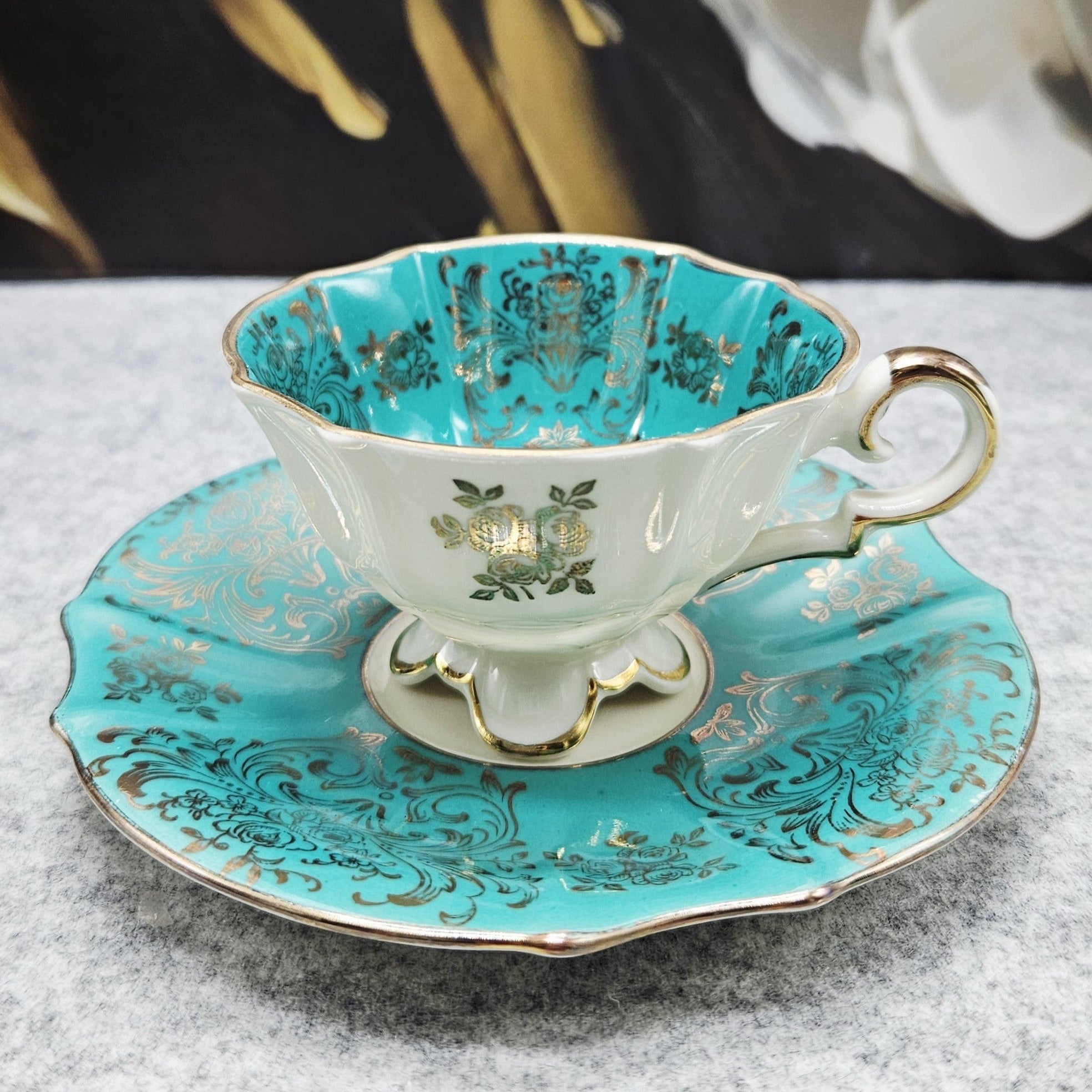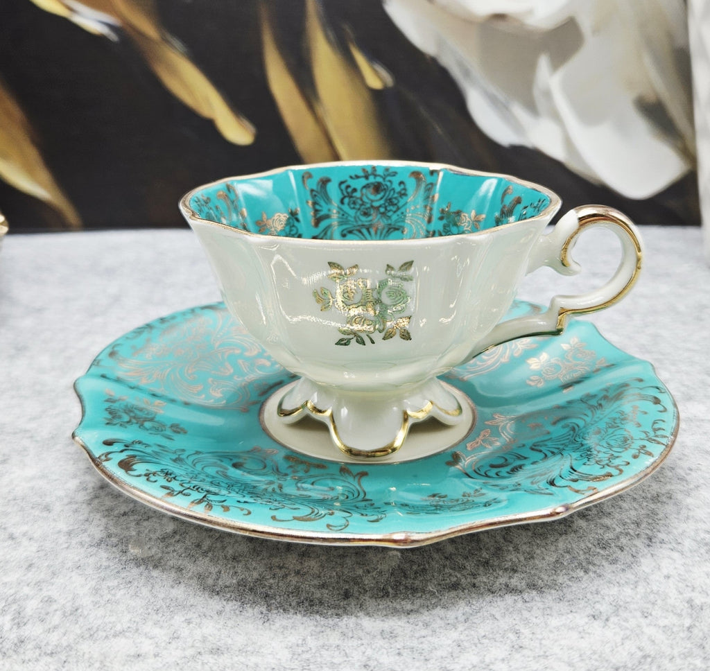 Das Set ist mit einer azurblauen Glasur und reichen goldenen Ornamenten, zarten Blumen- und Pflanzenmustern verziert. Die Innen- und Außenseite sind mit geprägten Goldmotiven verziert, während die Ränder und der Henkel mit Goldlinien überzogen sind.