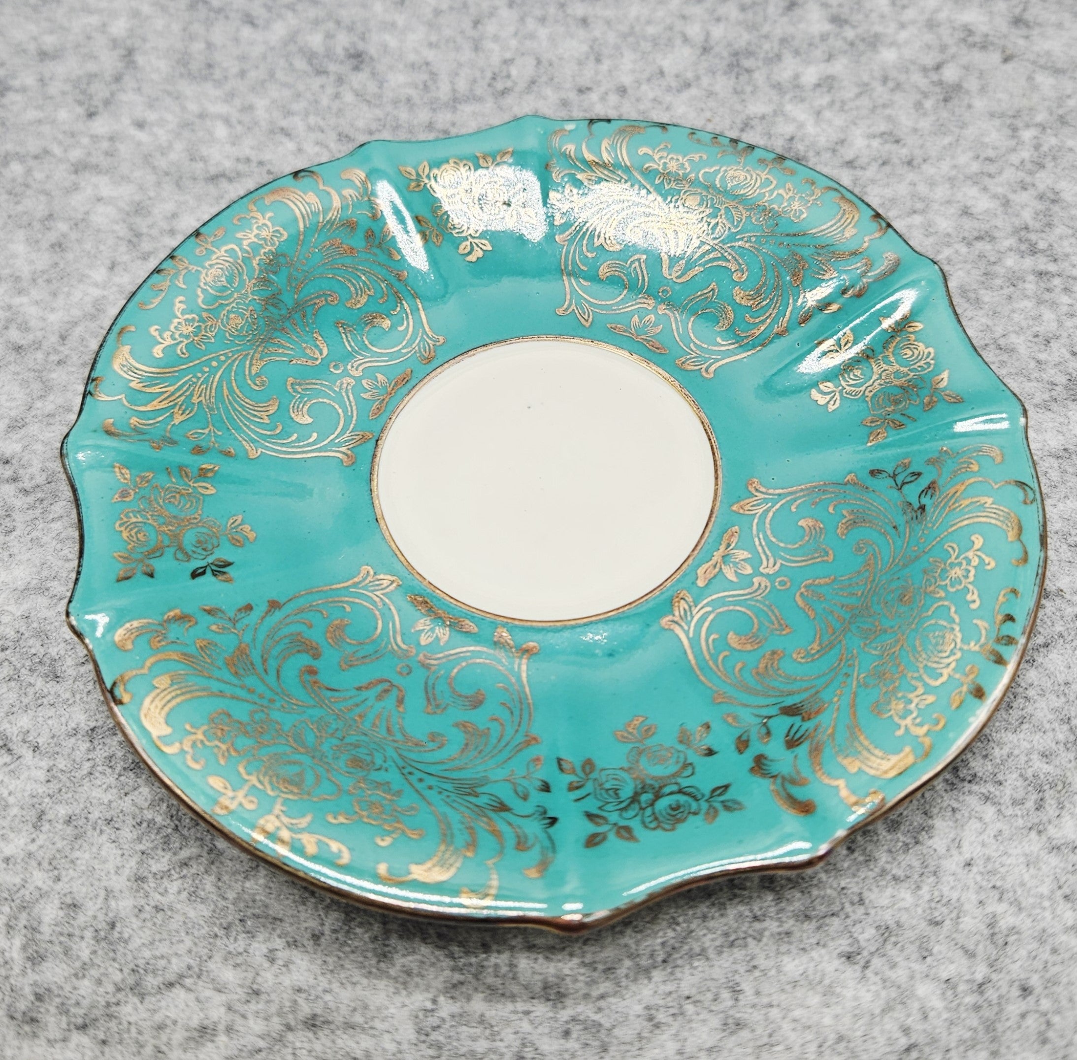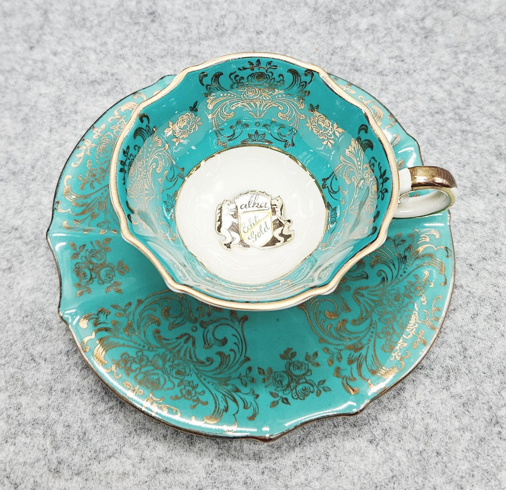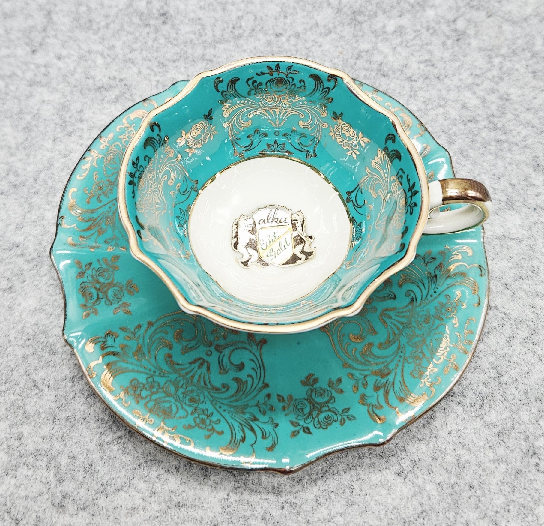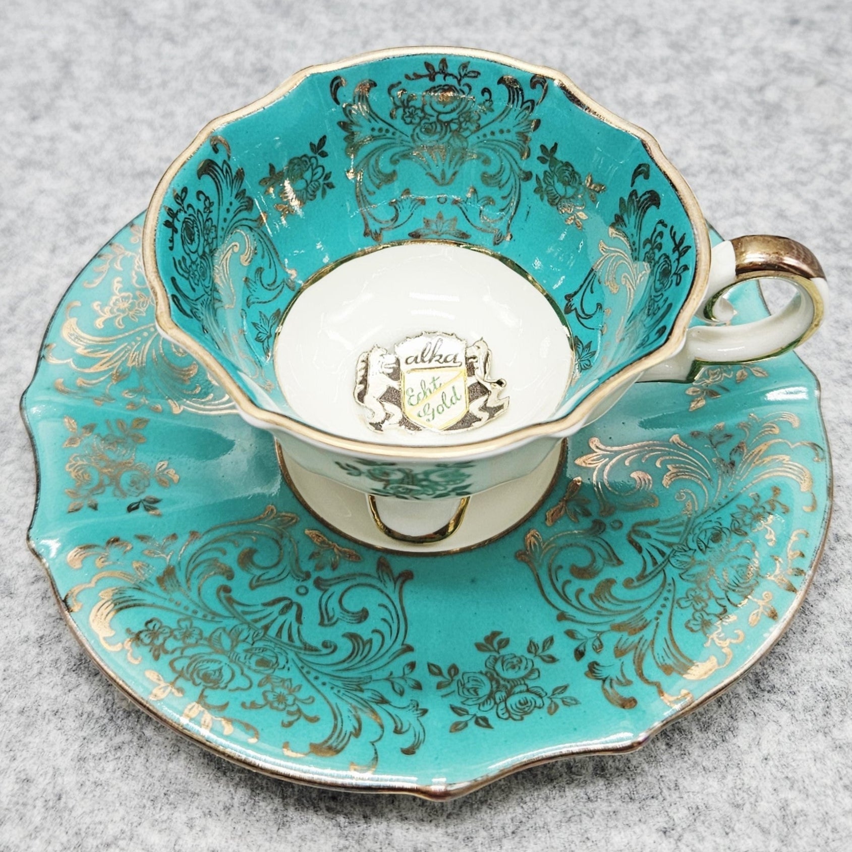 Die elegante, gewellte Form verleiht einen Hauch von Raffinesse, während das Dekor klassischen Stil und Luxus unterstreicht. Der Boden ist mit der Aufschrift "Alka Echt Gold" versehen, die auf ein echtes Golddekor hinweist.