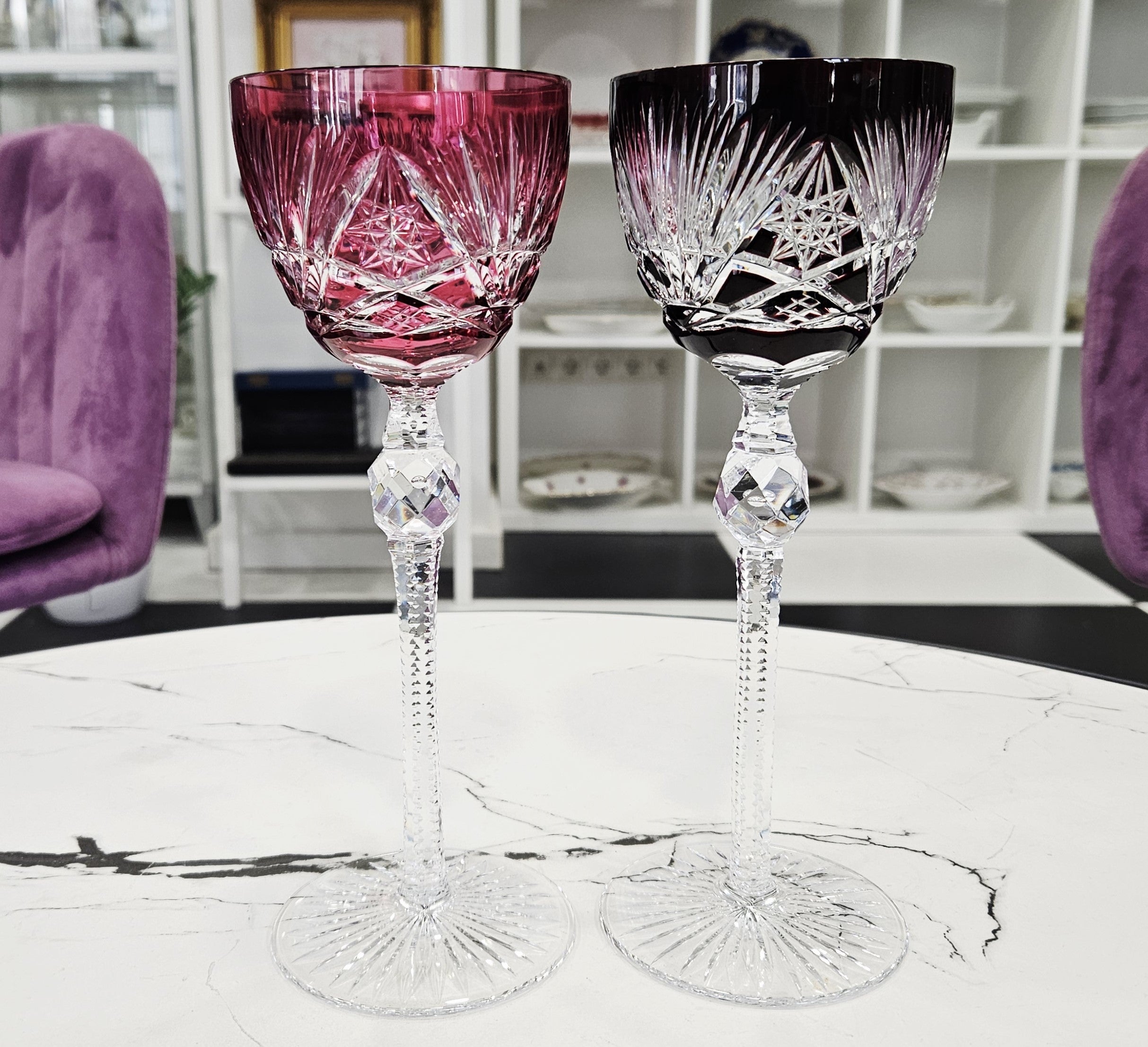 Die leuchtenden Farben, die sorgfältig geschliffenen Muster und die Form des Kelches sorgen nicht nur für optische Schönheit, sondern auch für das Gefühl, ein echtes Kunstwerk in den Händen zu halten. Dieses elegante Paar für "Sie und Ihn" eignet sich perfekt für besondere Anlässe, Hochzeitsgeschenke oder einfach, um die Verbundenheit zwischen zwei Menschen durch Ästhetik und zeitlose Qualität zu unterstreichen.