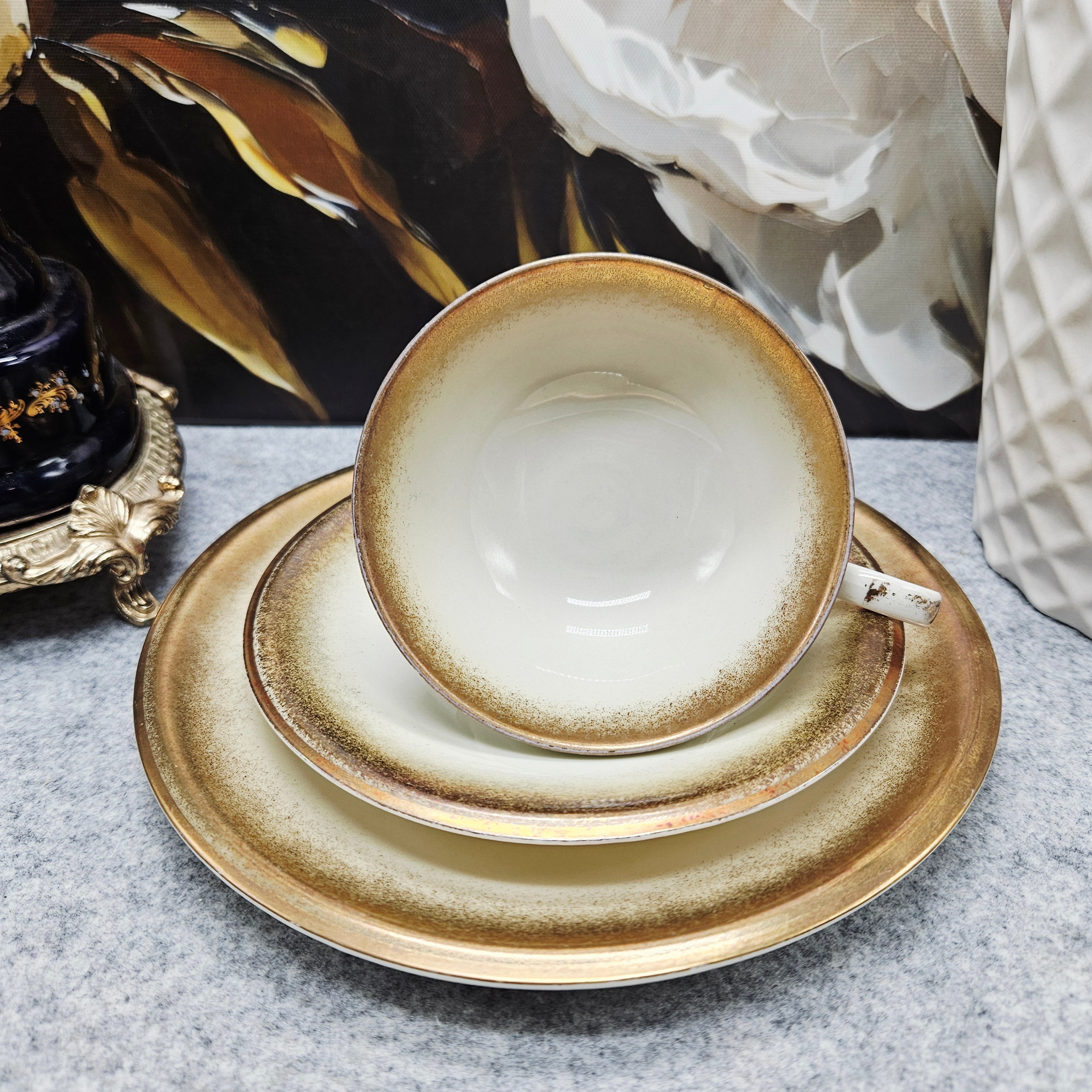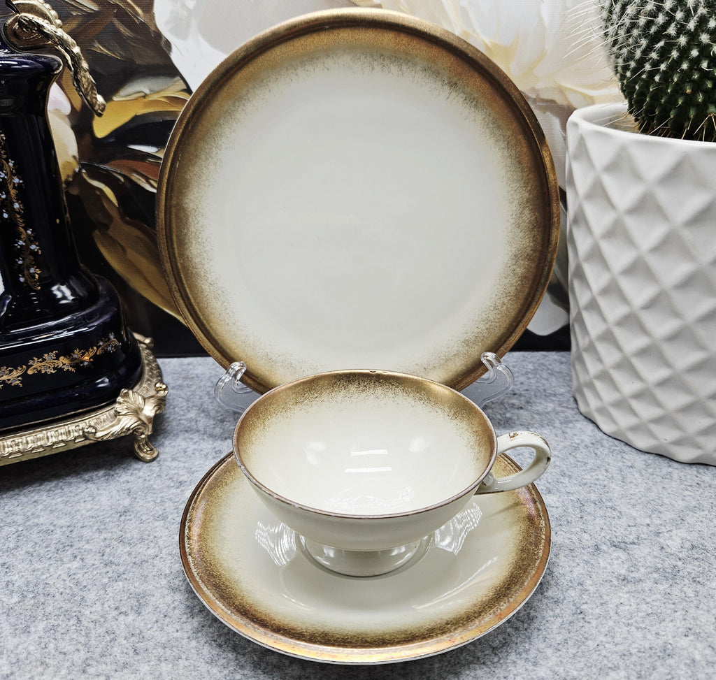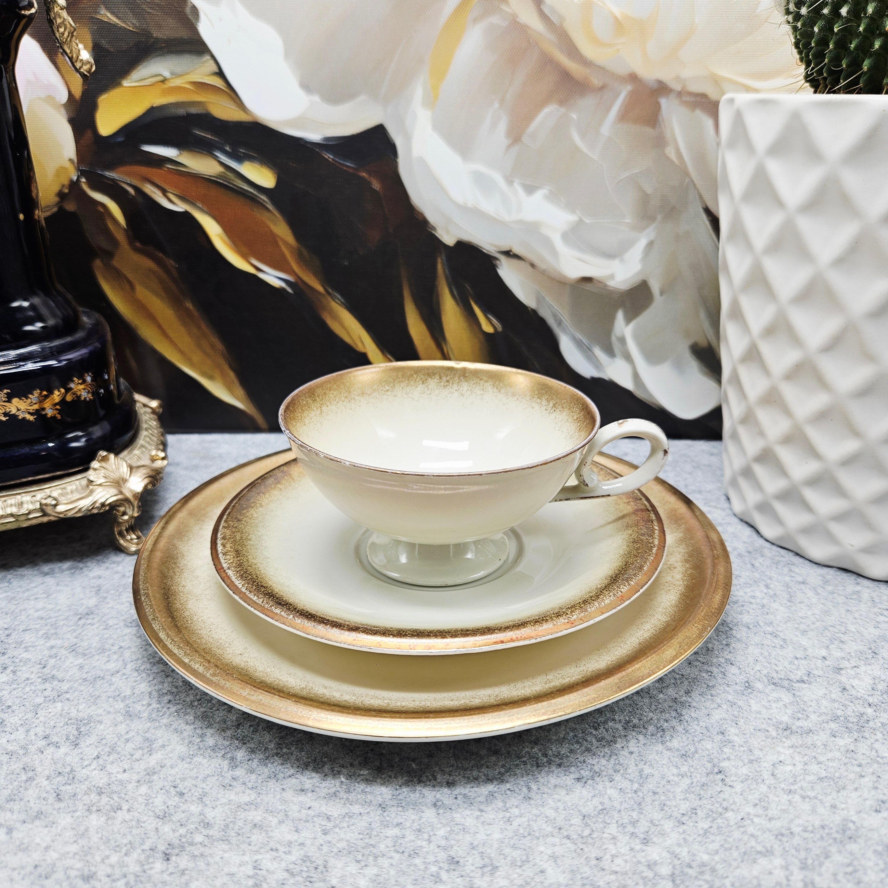 Schöne, elegante Schirnding QUALITÄTS-PORZELLAN Porzellantasse mit 2 Untertassen. Die Ränder sind mit einem sanft verlaufenden Goldton verziert, der den Eindruck von subtilem Luxus und warmem Charakter vermittelt.