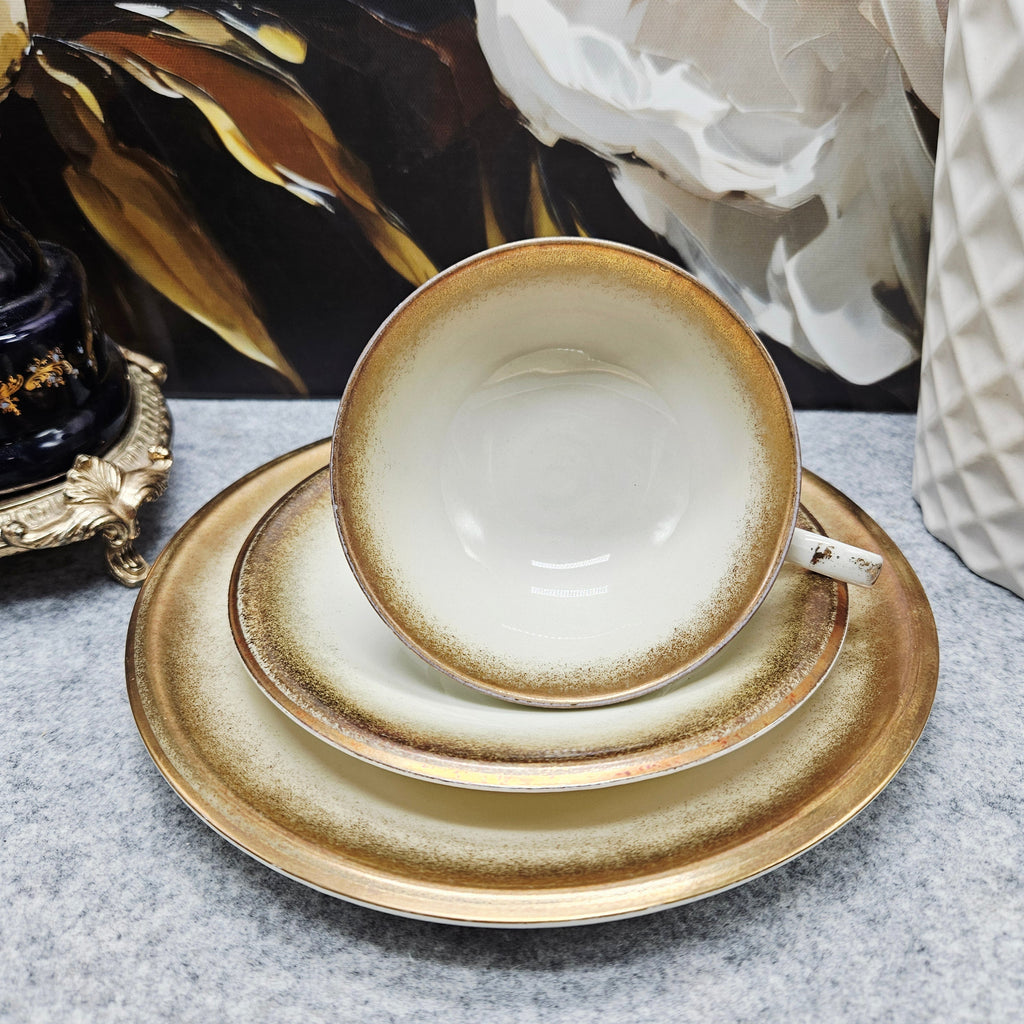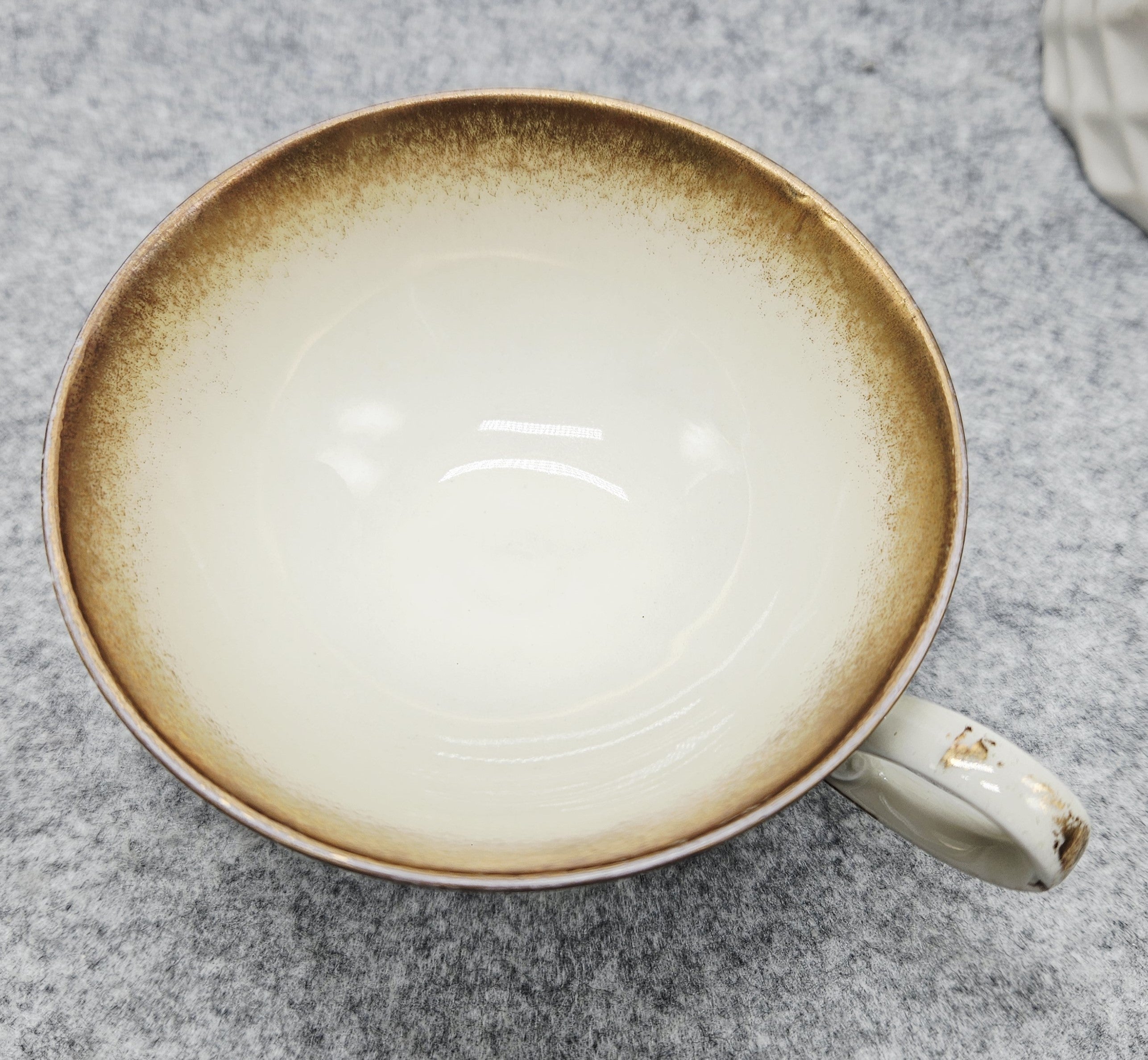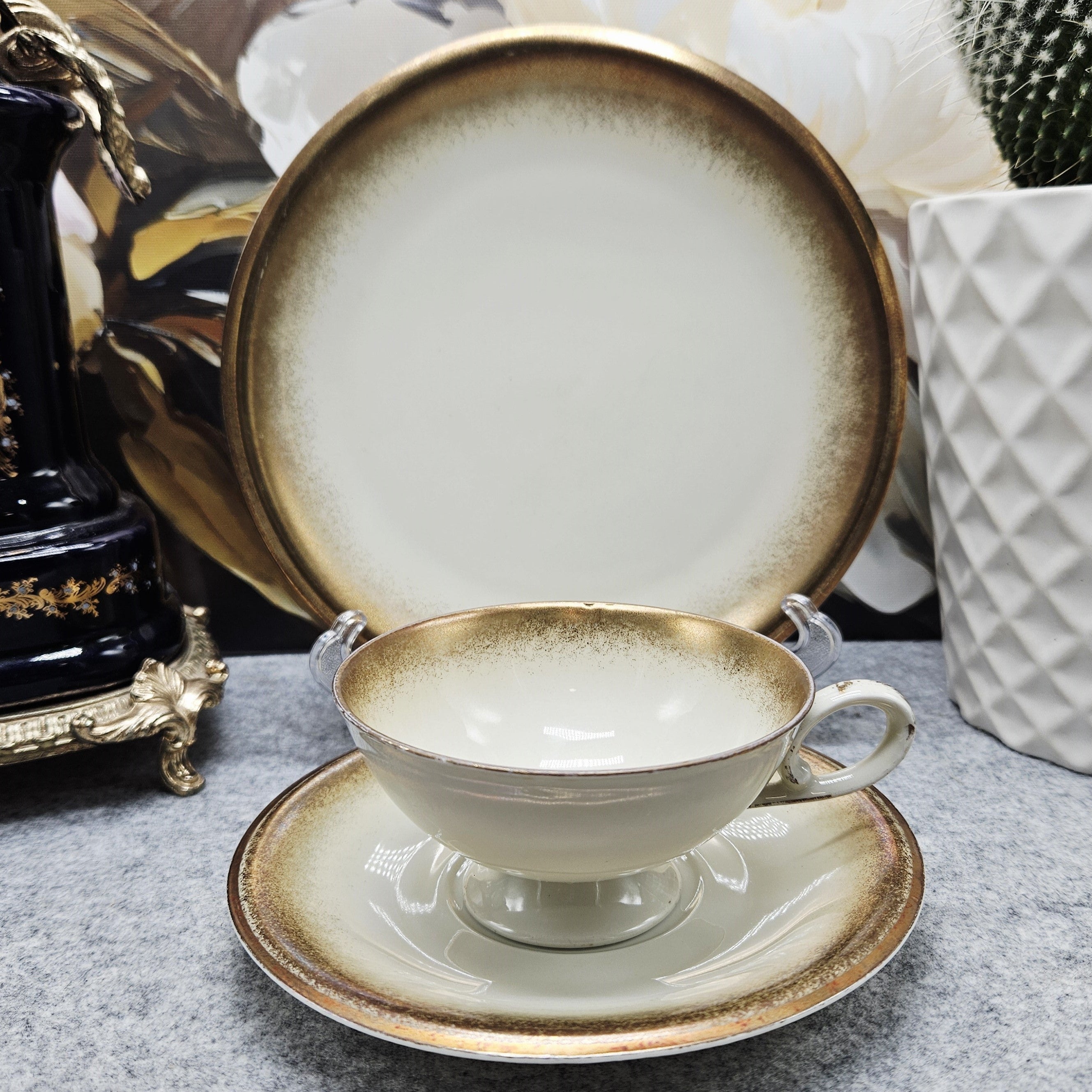 Schöne, elegante Schirnding QUALITÄTS-PORZELLAN Porzellantasse mit 2 Untertassen. Die Ränder sind mit einem sanft verlaufenden Goldton verziert, der den Eindruck von subtilem Luxus und warmem Charakter vermittelt.