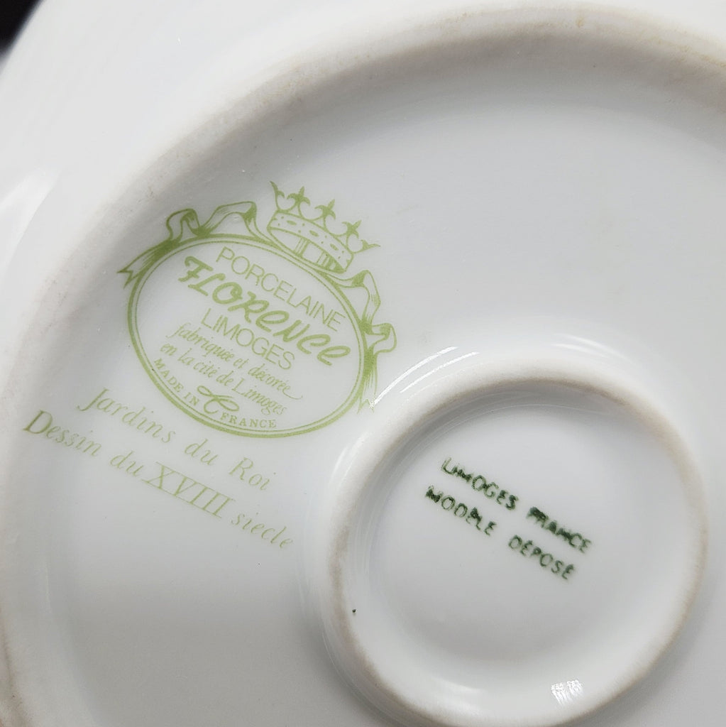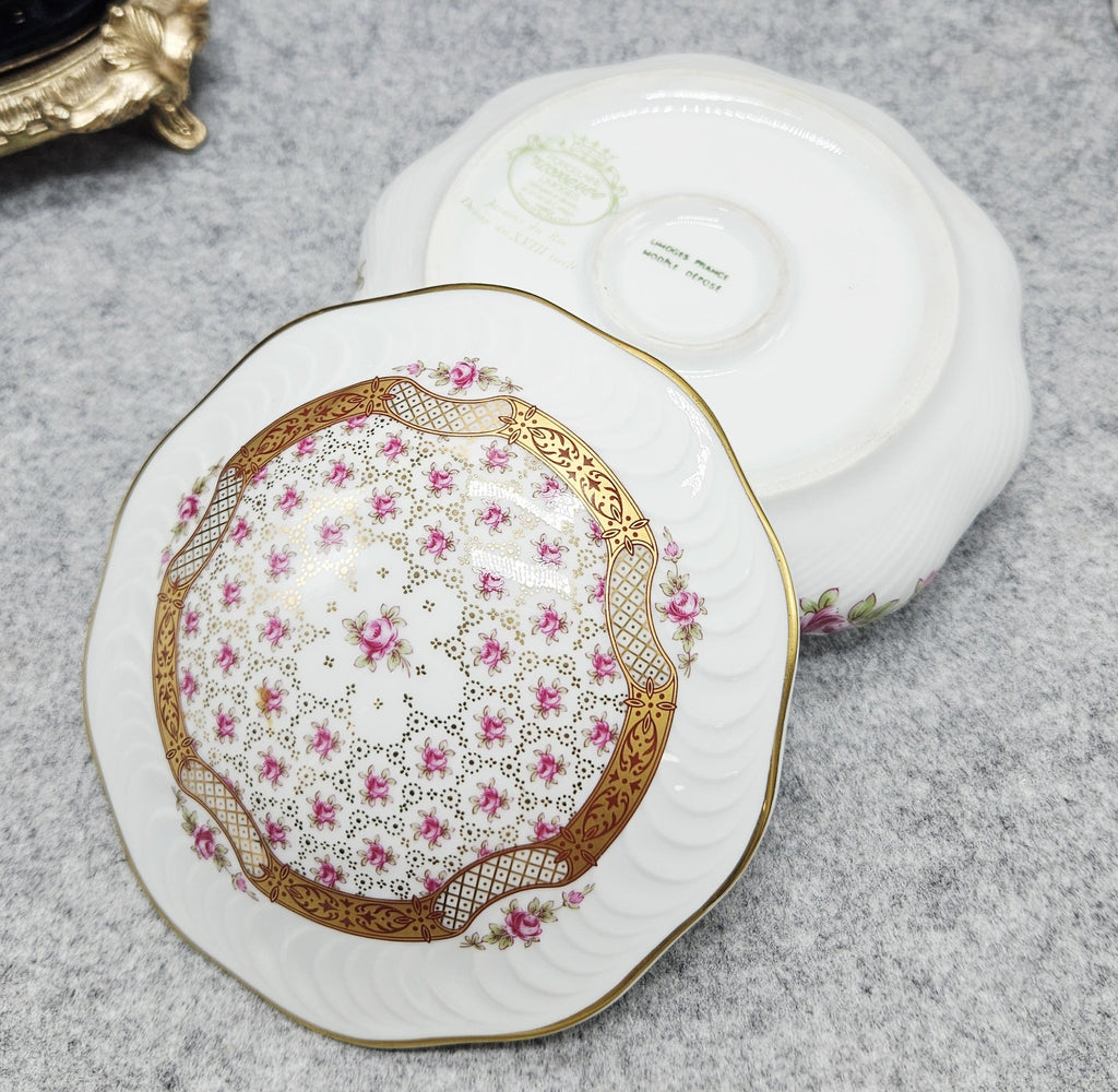 Die Schale ist mit einem zarten floralen Rosenmotiv verziert, das durch Golddekor und dekorative Muster ergänzt wird. Die Form der Dose besteht aus gewellten Linien, mit einem eleganten Deckel. Der Boden trägt die Manufakturmarke "Porcelaine Florence Limoges - Jardins du Roi".