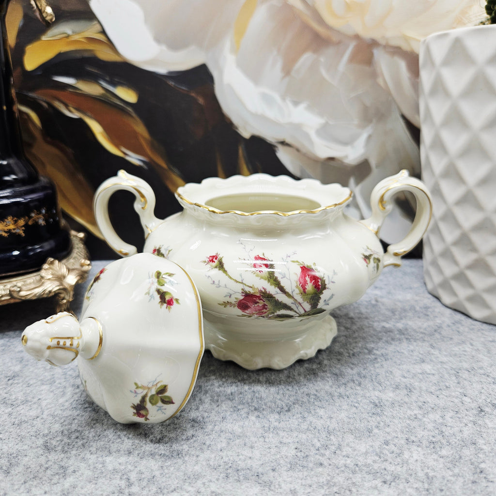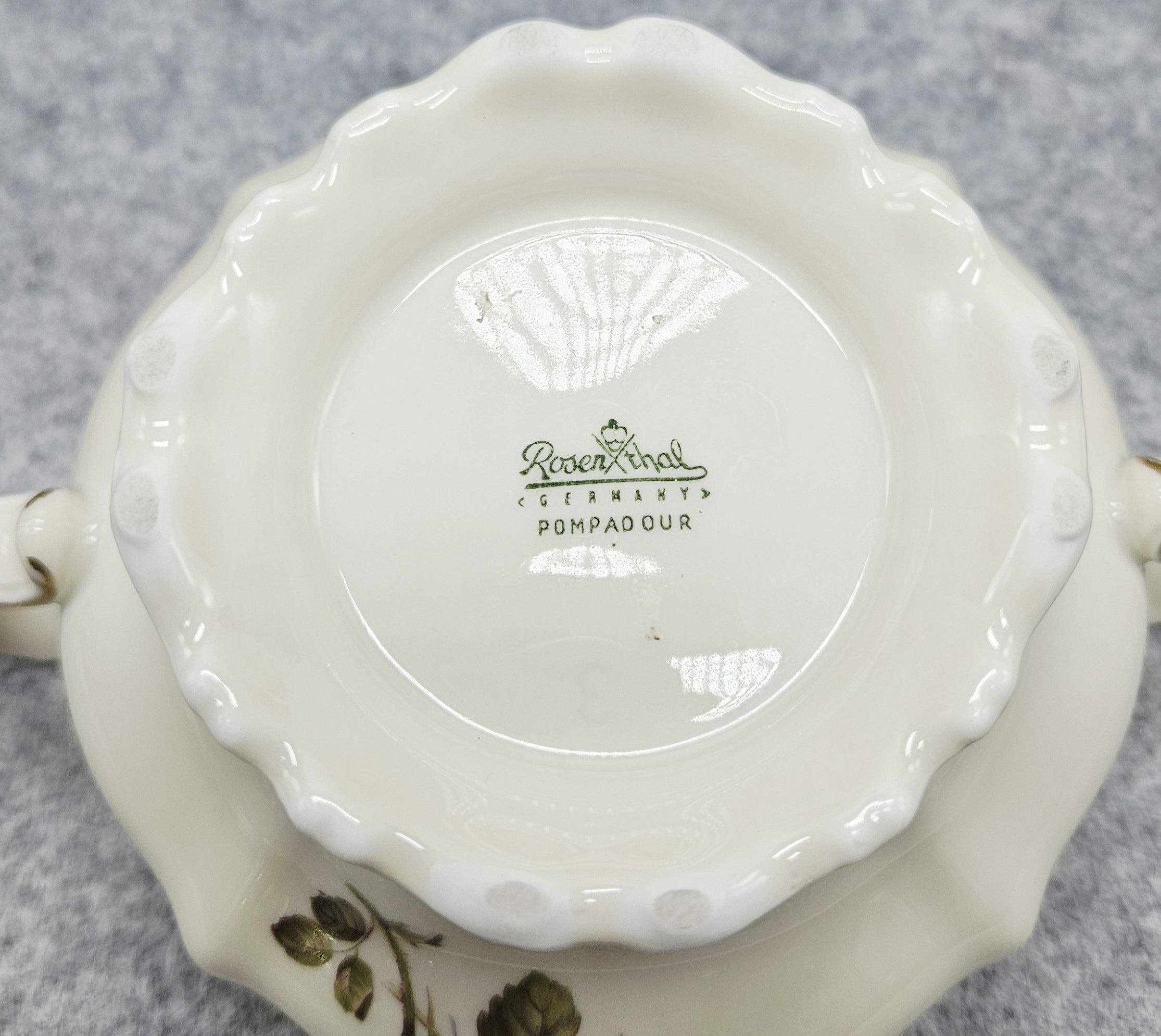 Eine Porzellan-Zuckerdose aus Deutschland von außergewöhnlicher Schönheit, im klassischen Rosenthal Pompadour-Dekor. Diese elegante Schale besticht durch ihre ausdrucksstarken barocken Formen, ihren gewellten Rand und ihren zarten cremefarbenen Farbton, der mit handgemalten Rosenblüten und zarten Vergoldungsakzenten verziert ist.