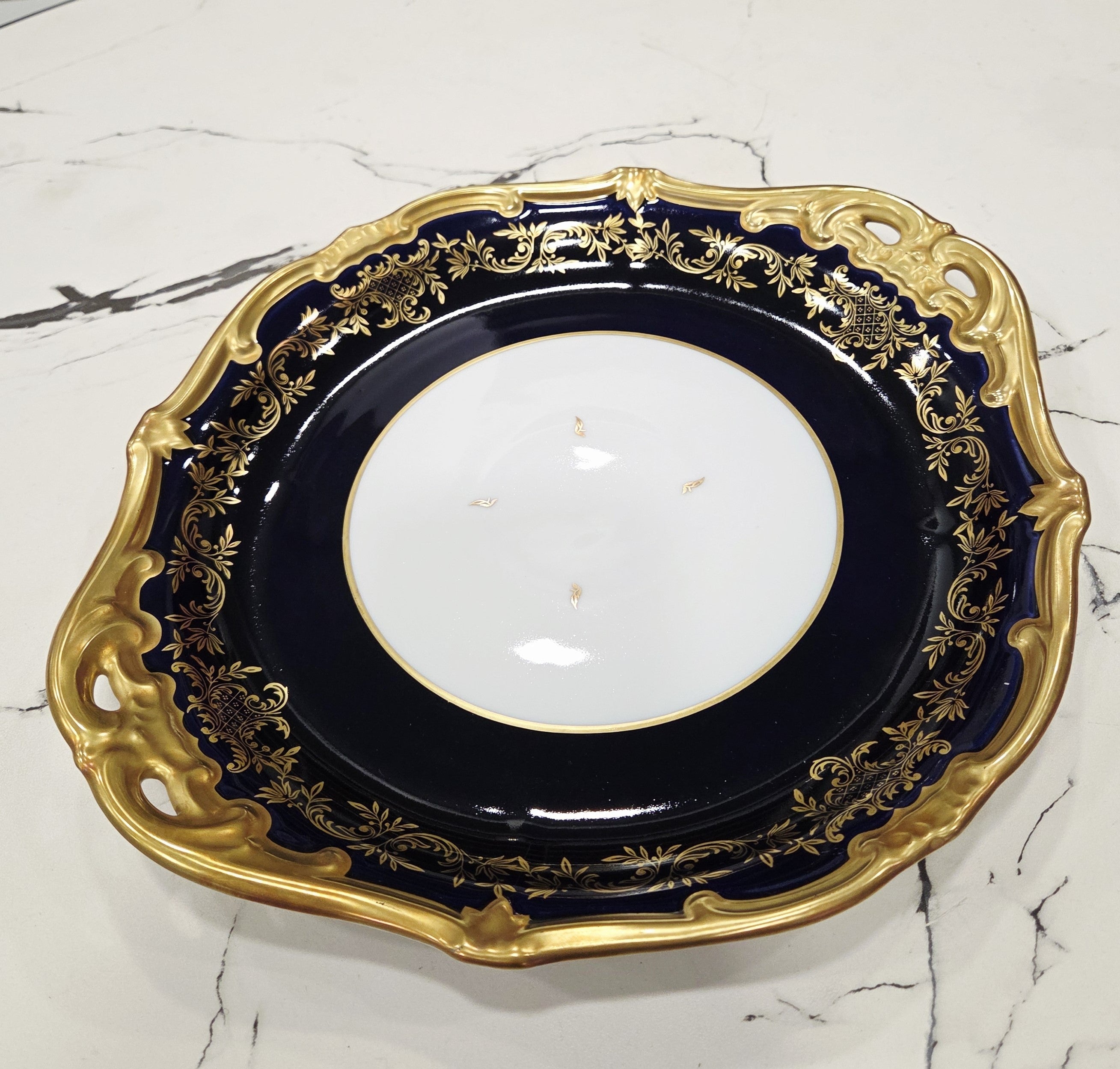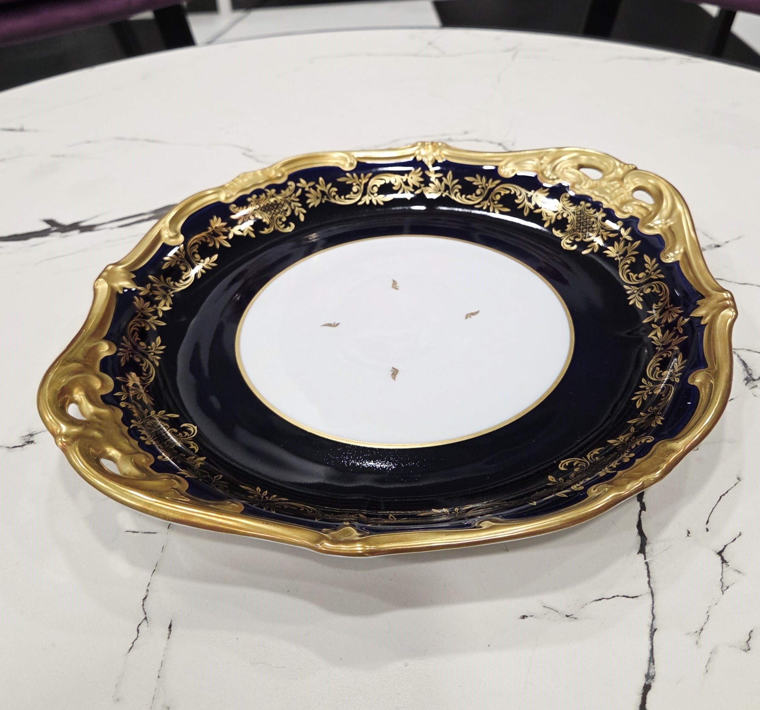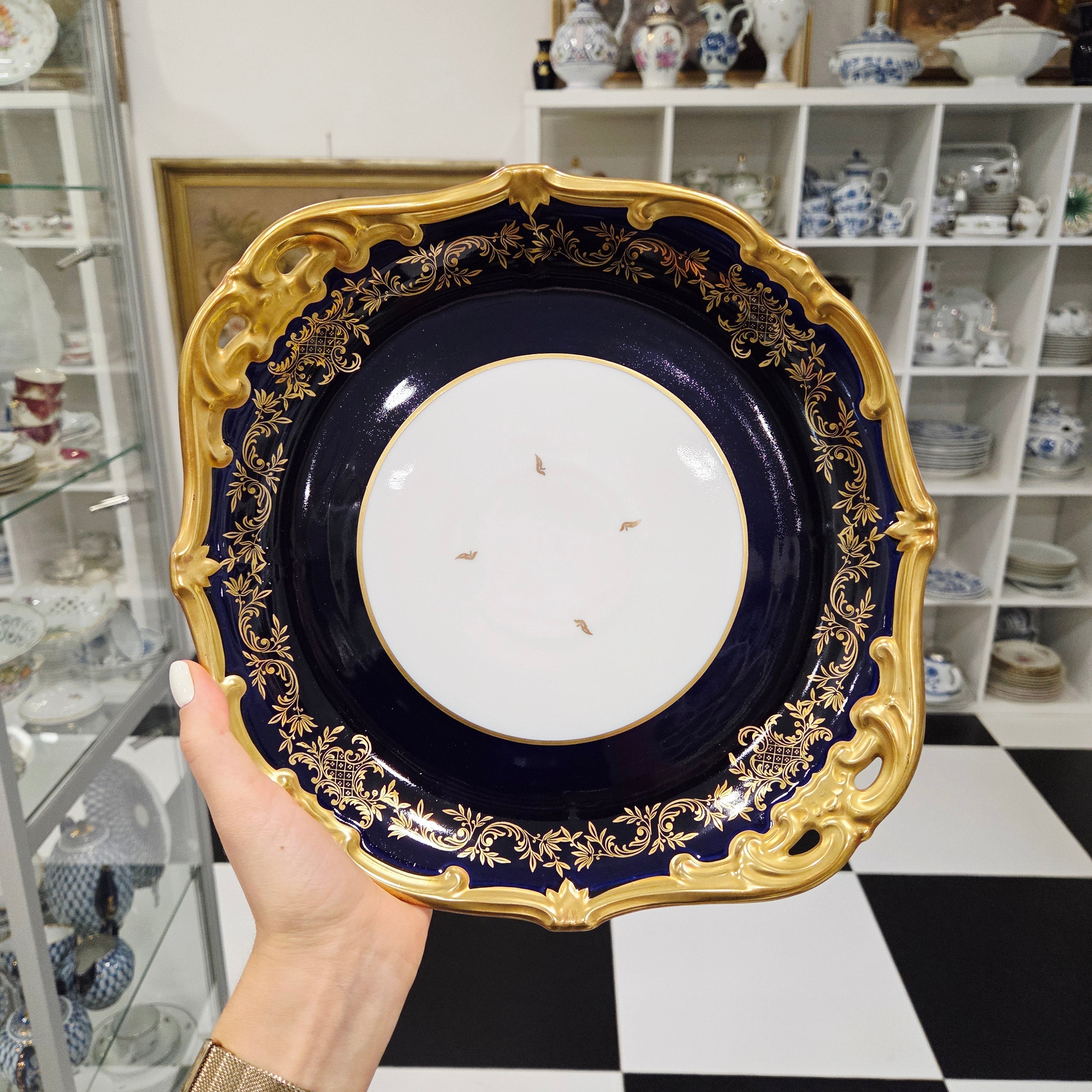 Ein atemberaubender Servierteller aus vergoldetem Weimarer Porzellan in Kobalt, hergestellt in der Weimarer Porzellanmanufaktur in Deutschland.