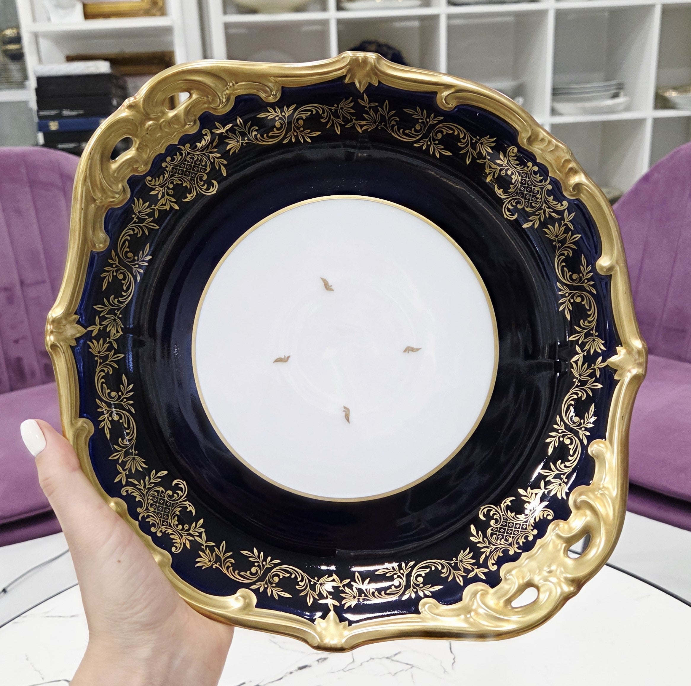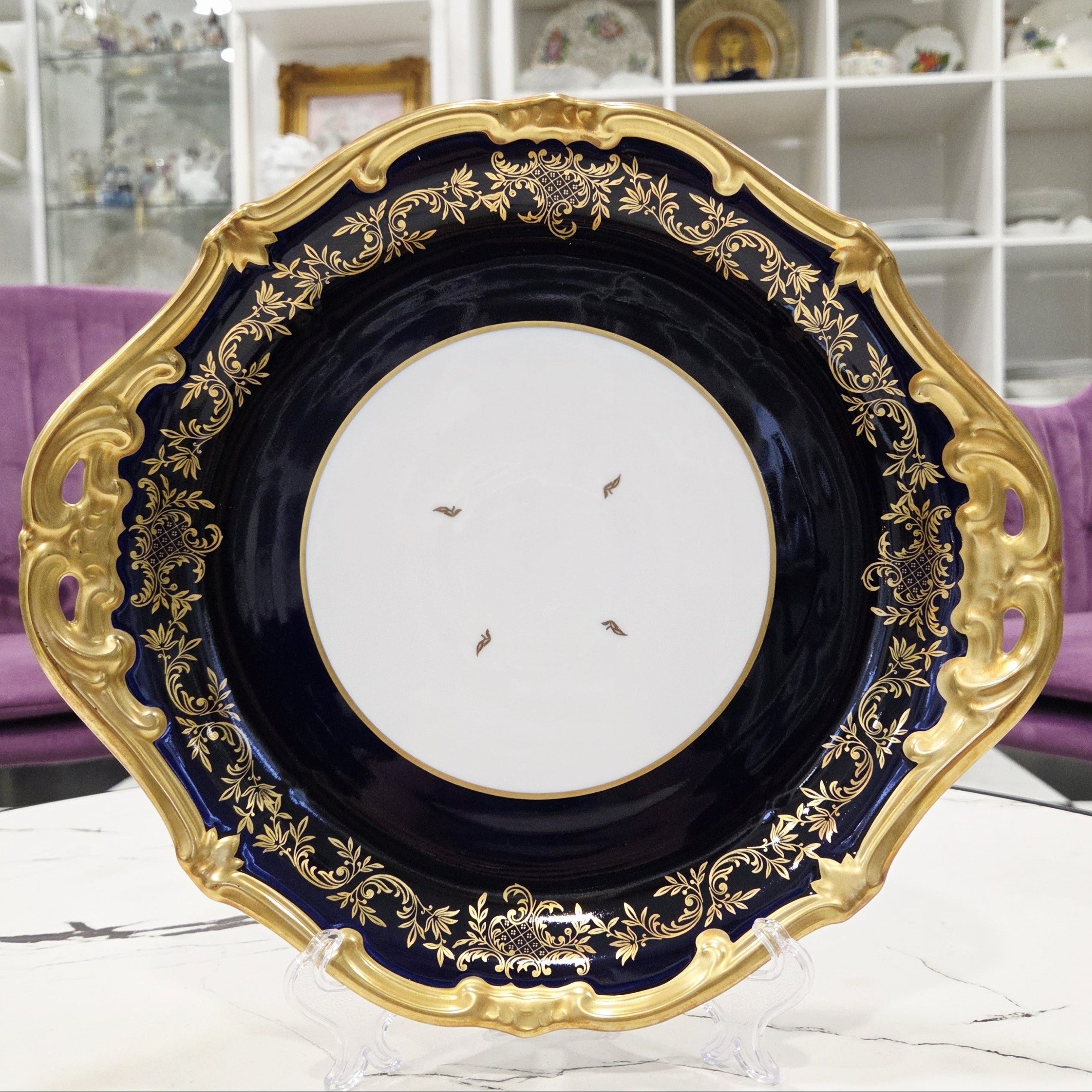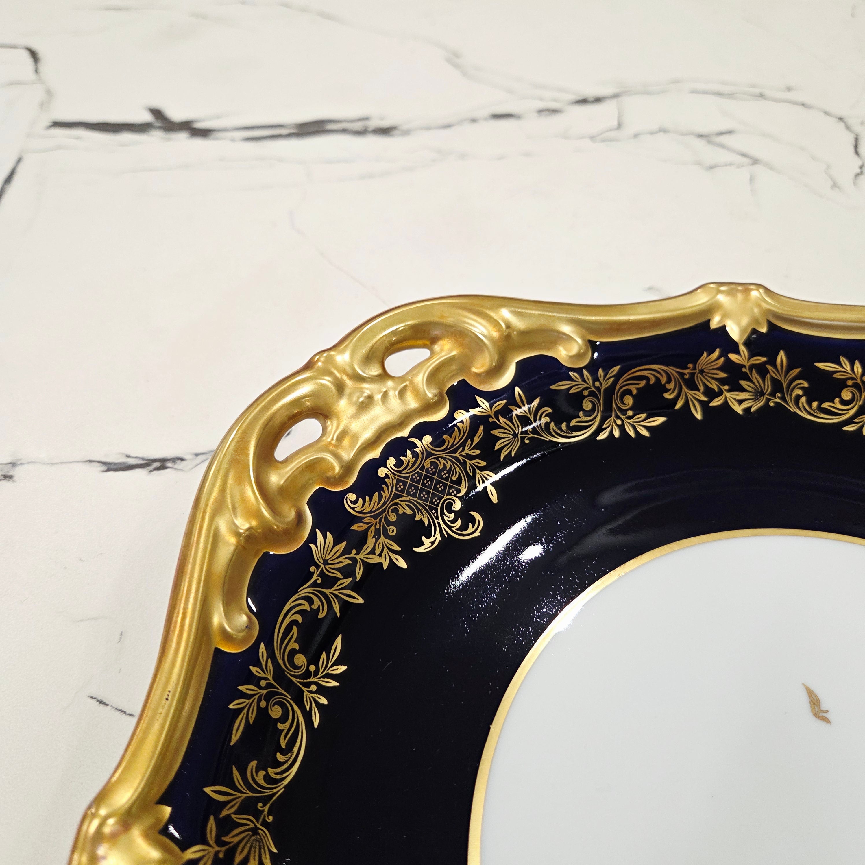 Ein atemberaubender Servierteller aus vergoldetem Weimarer Porzellan in Kobalt, hergestellt in der Weimarer Porzellanmanufaktur in Deutschland.