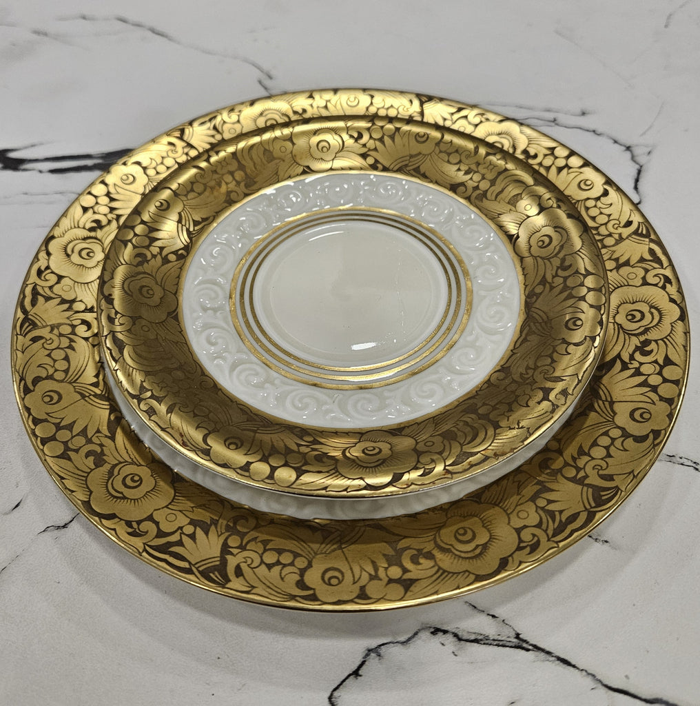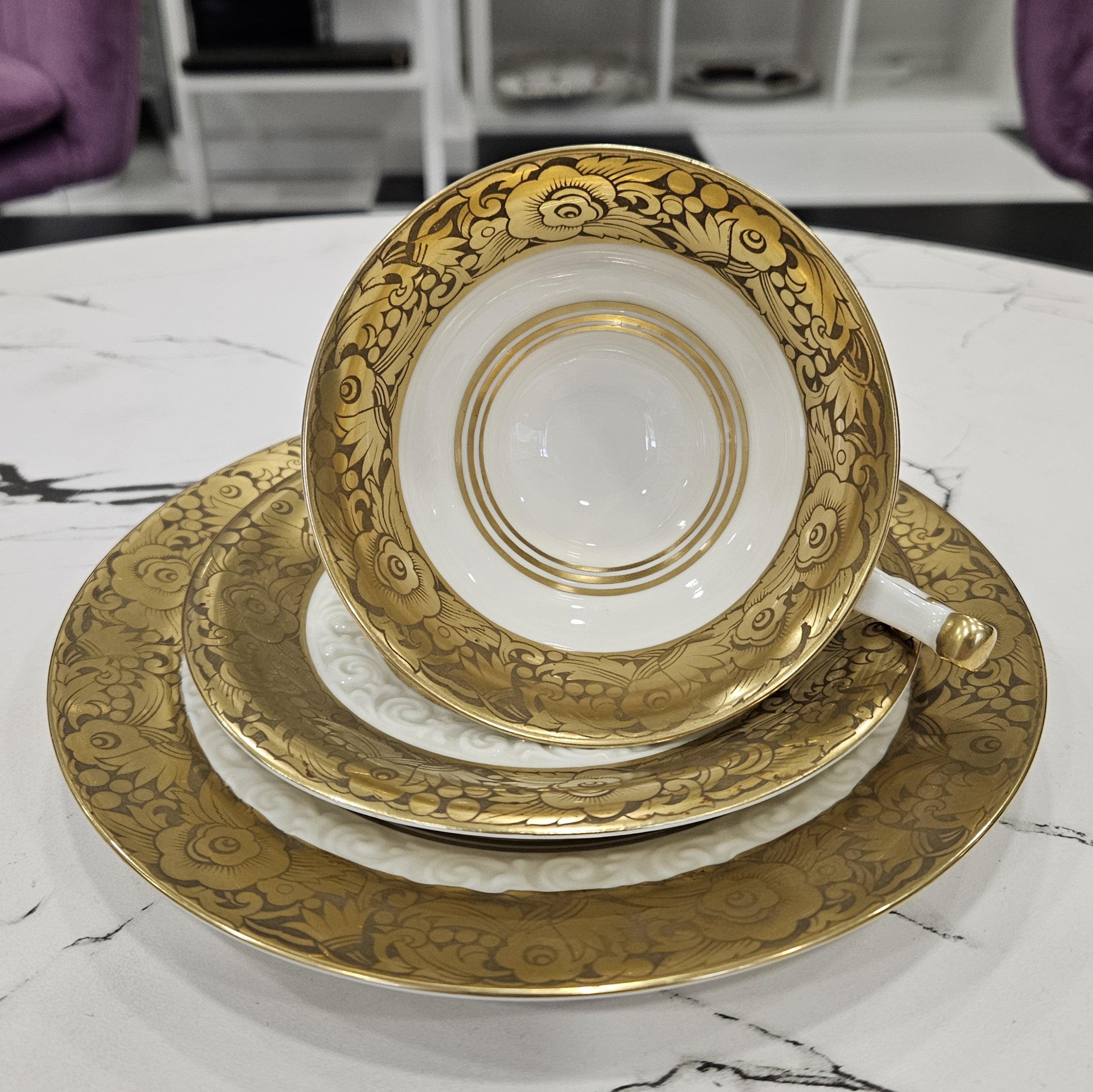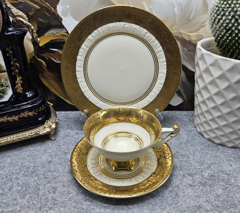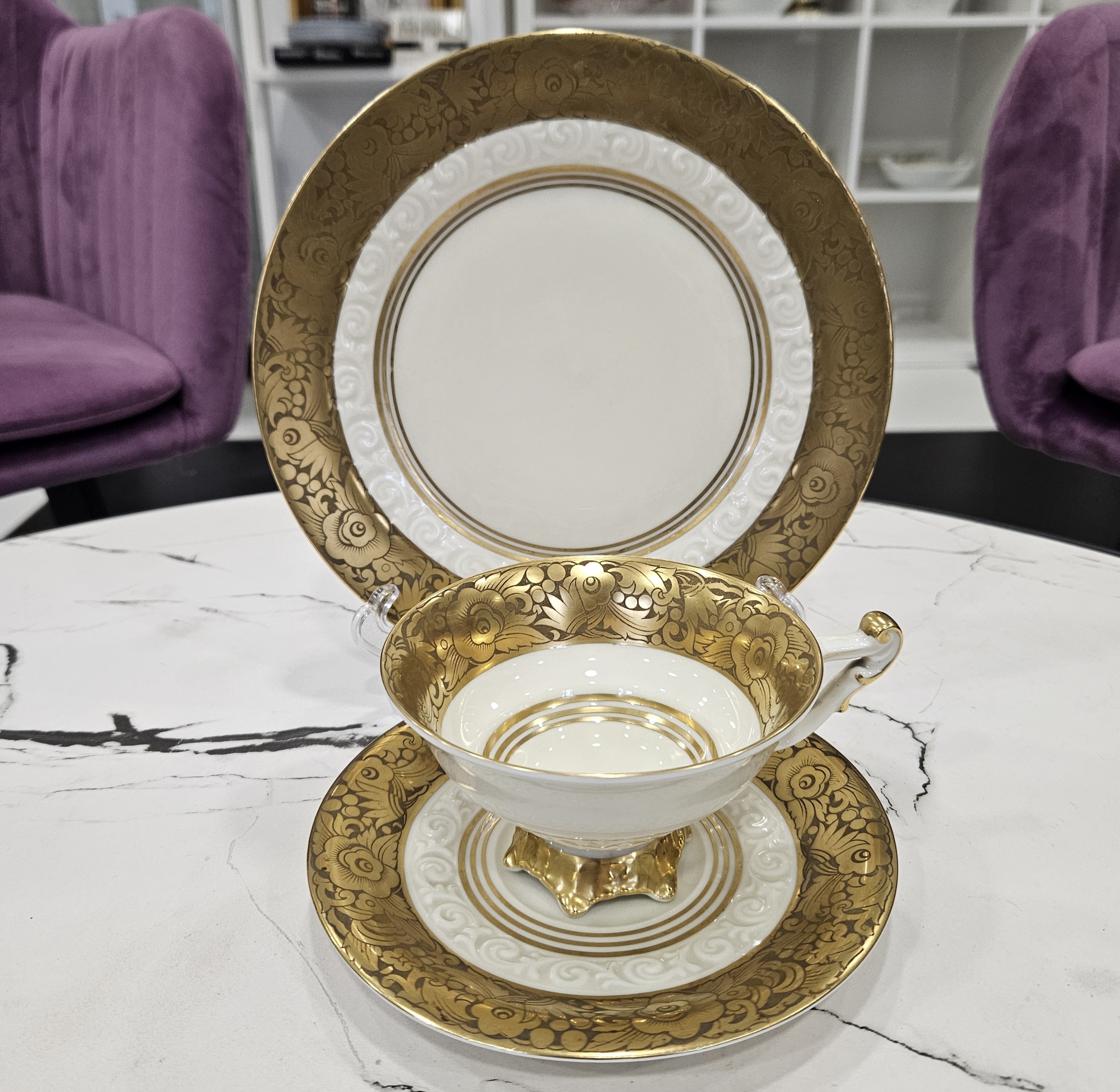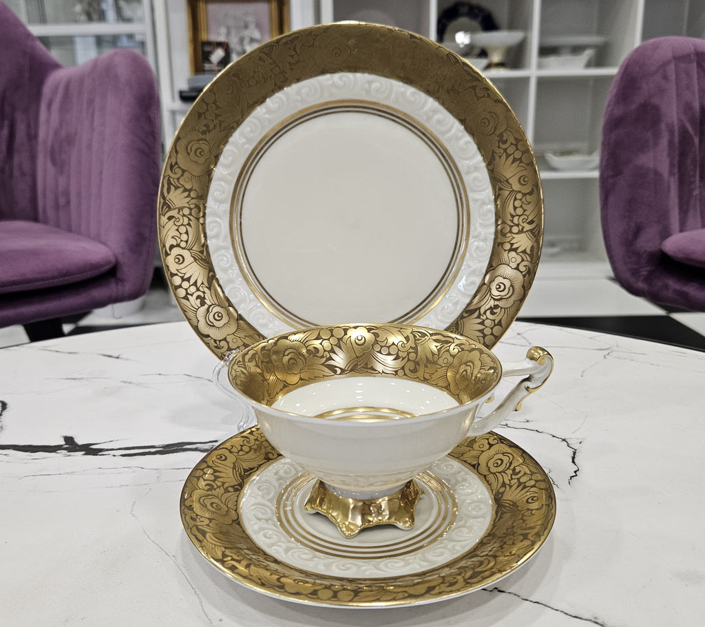 Seltenes, sammelwürdiges, luxuriöses, goldverziertes Weimarer Porzellan TRIO (1 Tasse + 2 Teller) (220ml.)
