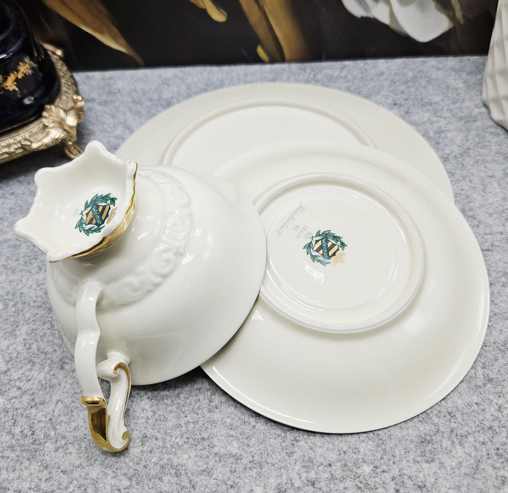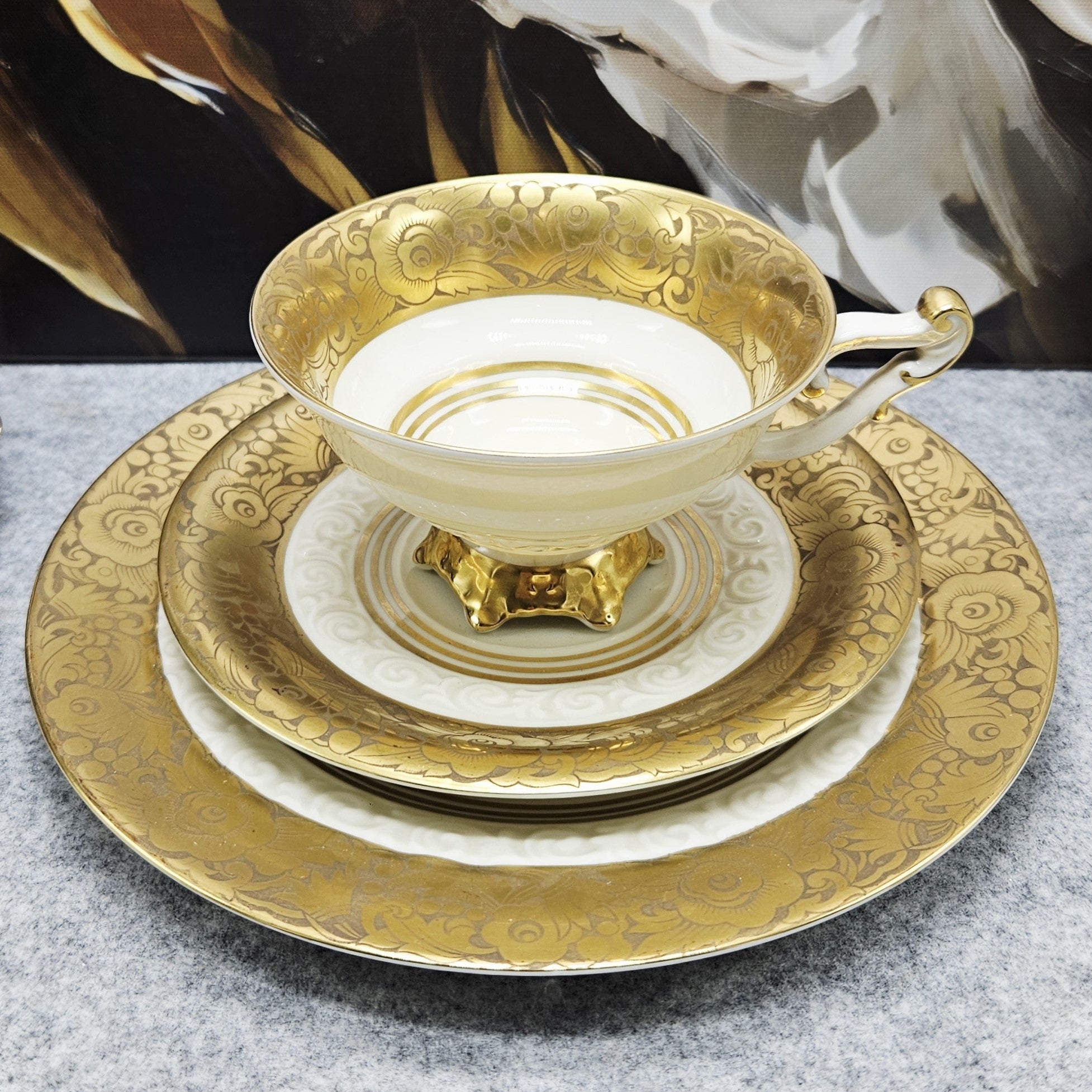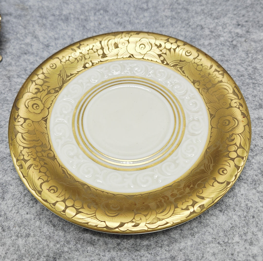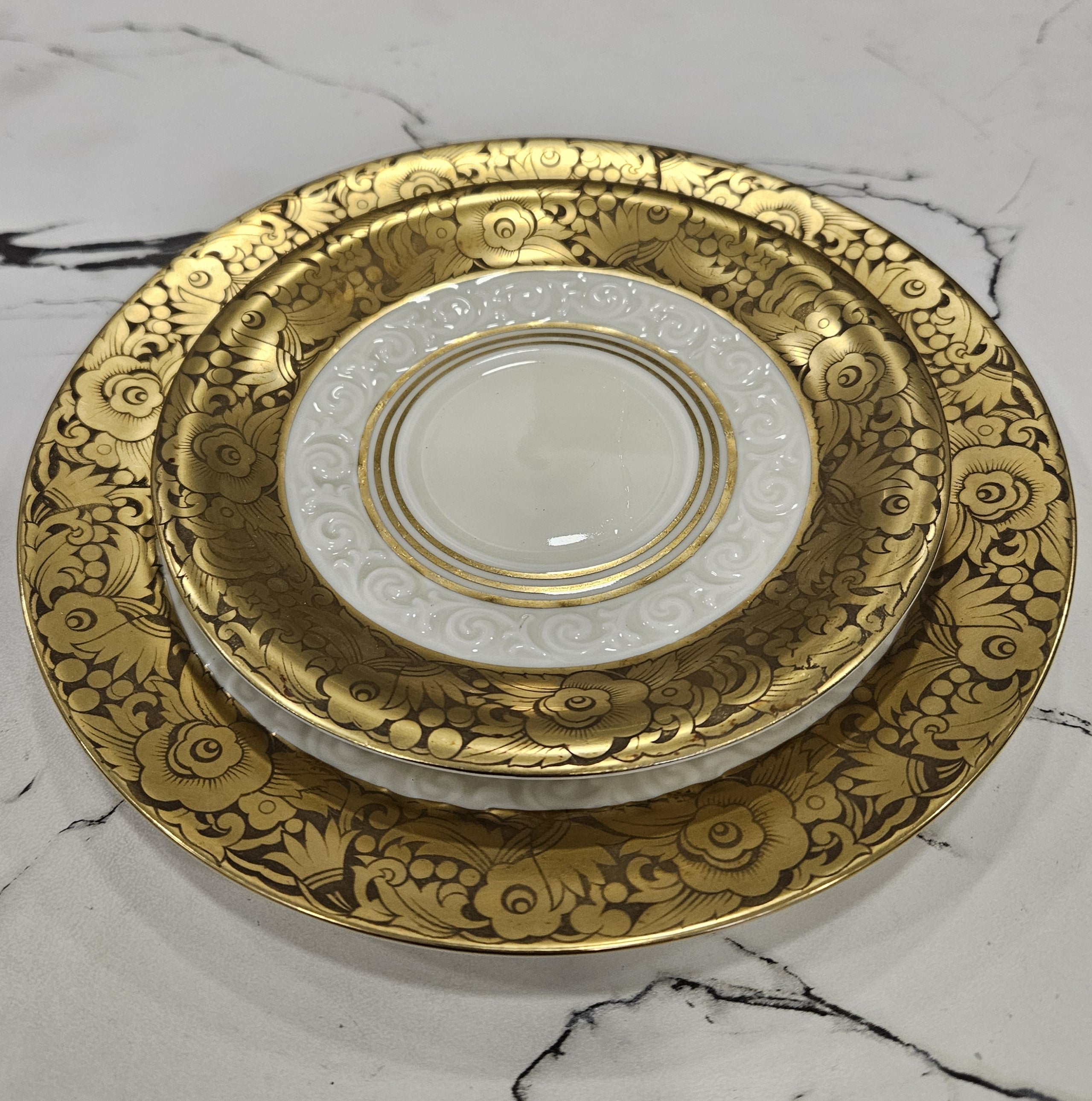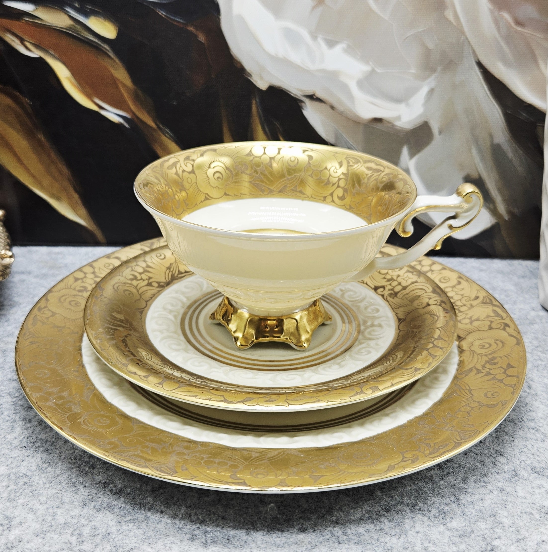 Seltenes, sammelwürdiges, luxuriöses, goldverziertes Weimarer Porzellan TRIO (1 Tasse + 2 Teller) (220ml.)