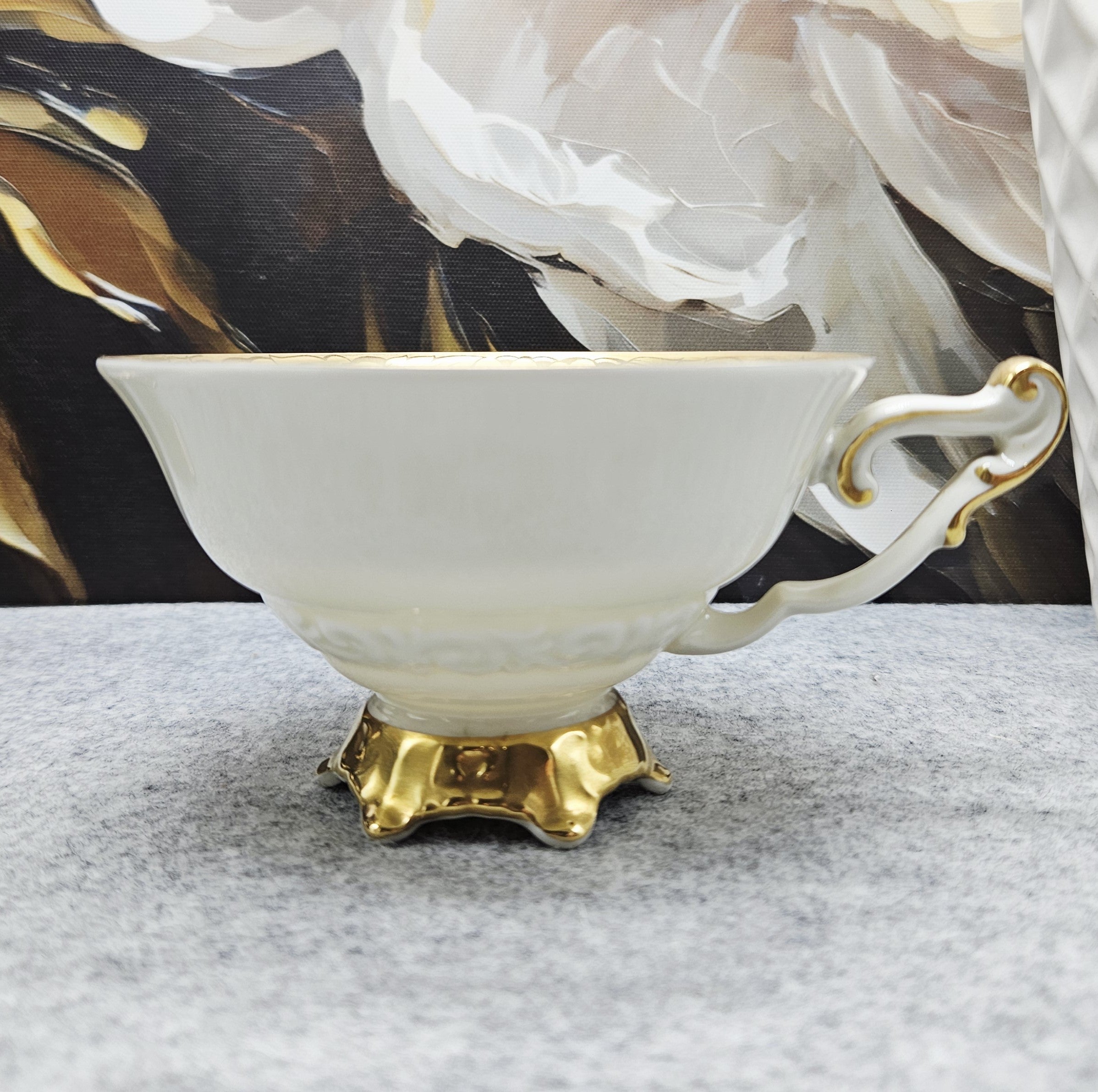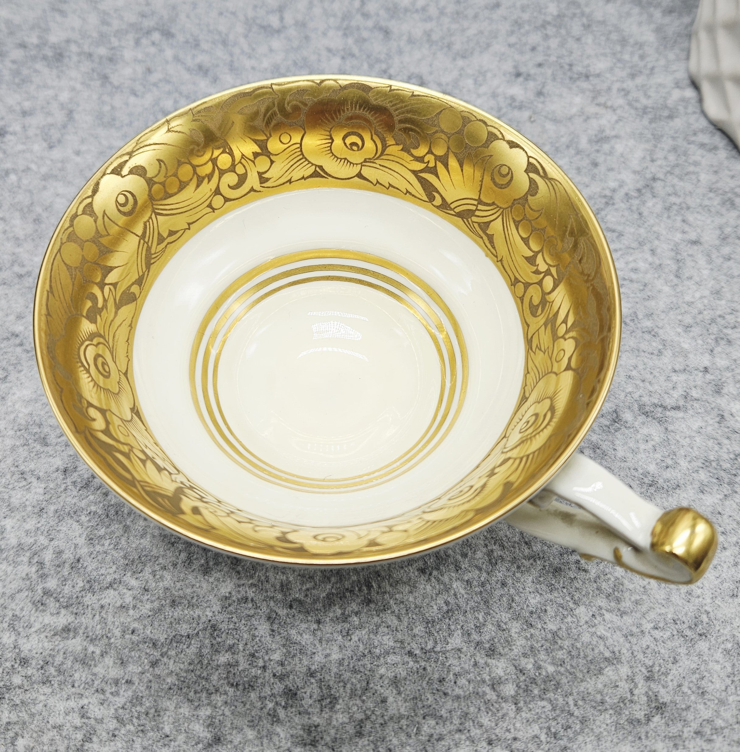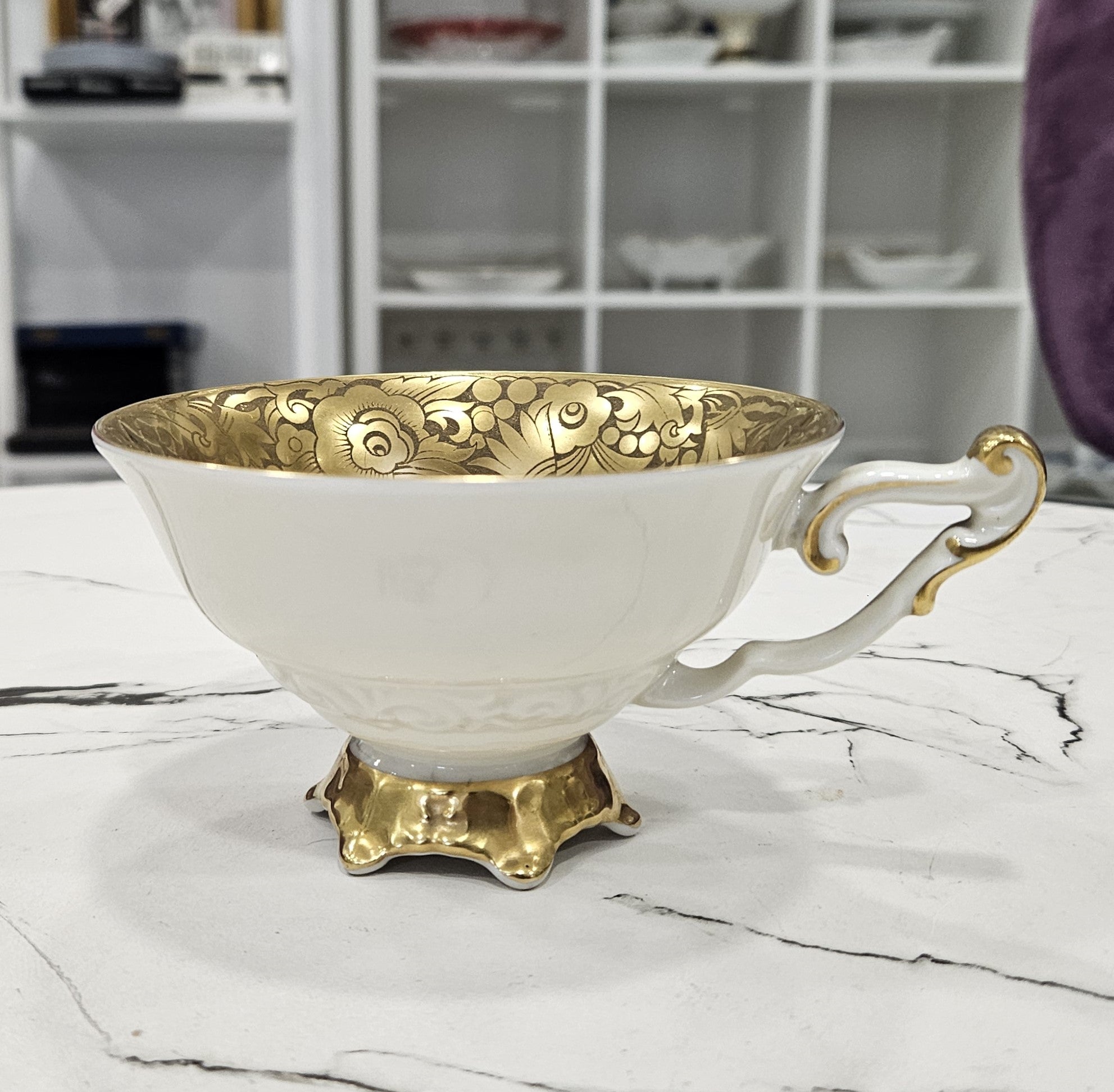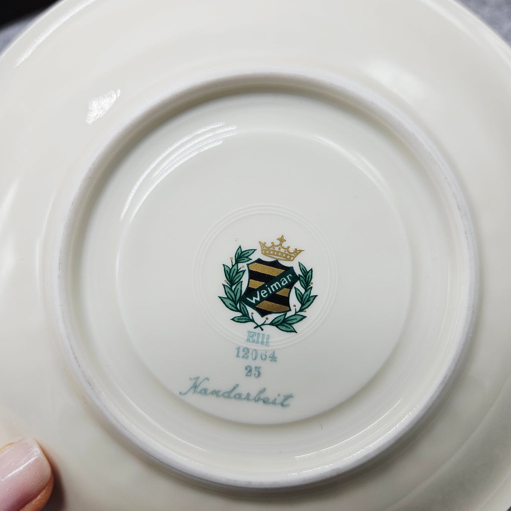 Die Tasse ruht auf einem anmutigen, vergoldeten Fuß und ihr Inneres erstrahlt in goldenem Glanz, der mit dem kunstvollen Dekor der Teller harmoniert. Jede Linie und jedes Detail zeugt von der hohen Akribie der Handwerker der Weimarer Manufaktur und vom klassischen Stil des deutschen Porzellans.